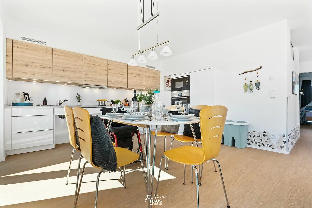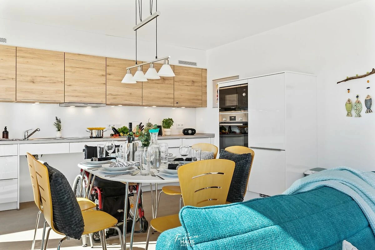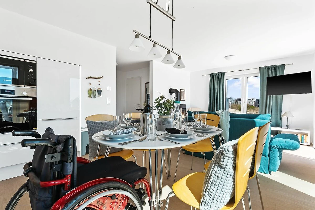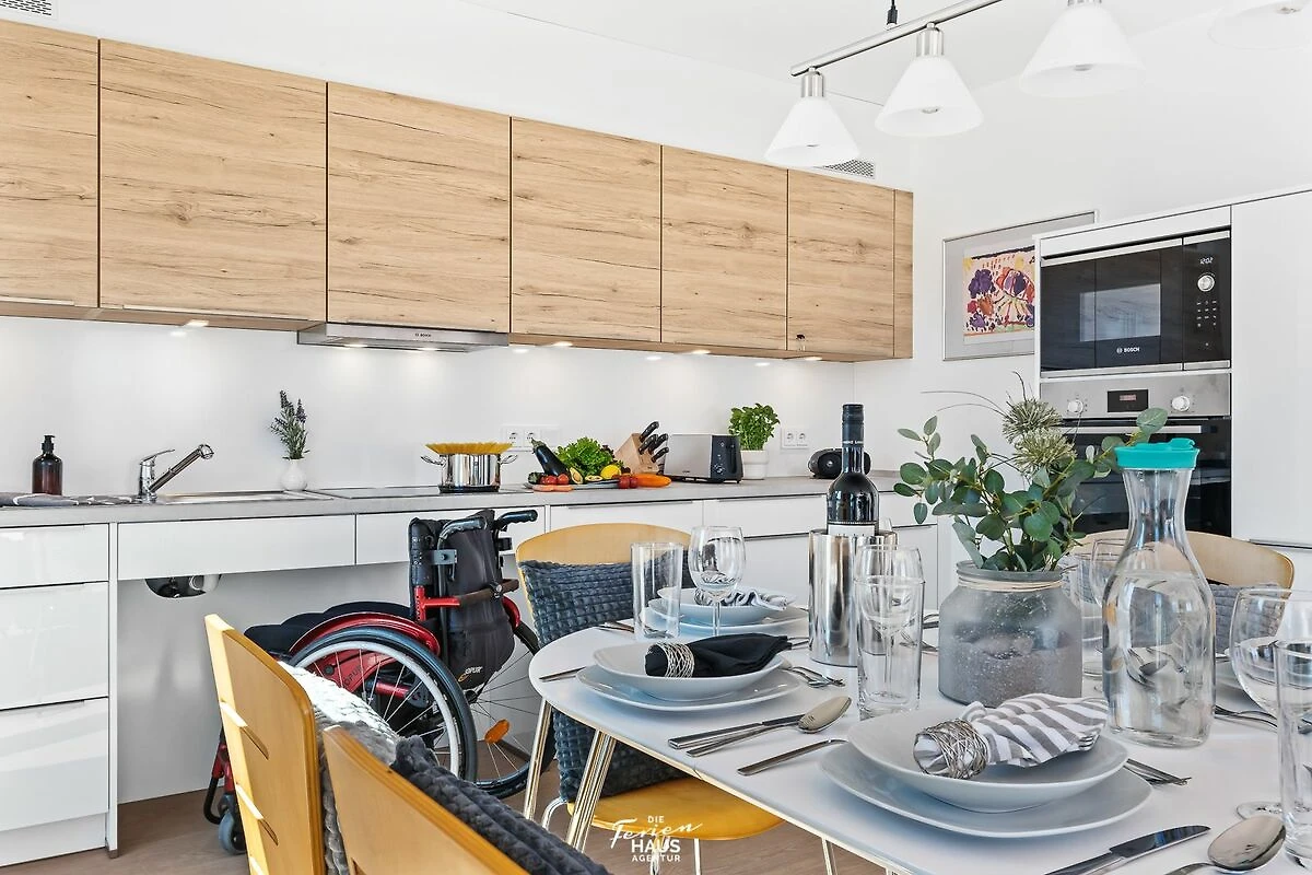 In der rundum ausgestatteten Küche sind Spüle und Kochfläche unterfahrbar. Die Abzugshaube ist im Sitzen erreichbar und der Backofen verfügt über Teleskopschienen und ist höher gesetzt. Der Essbereich bietet mit unterfahrbaren Esstisch Platz für bis zu 6 Personen.