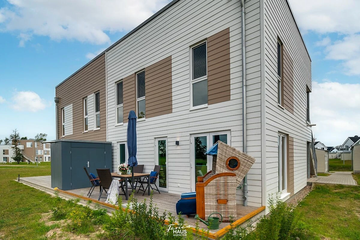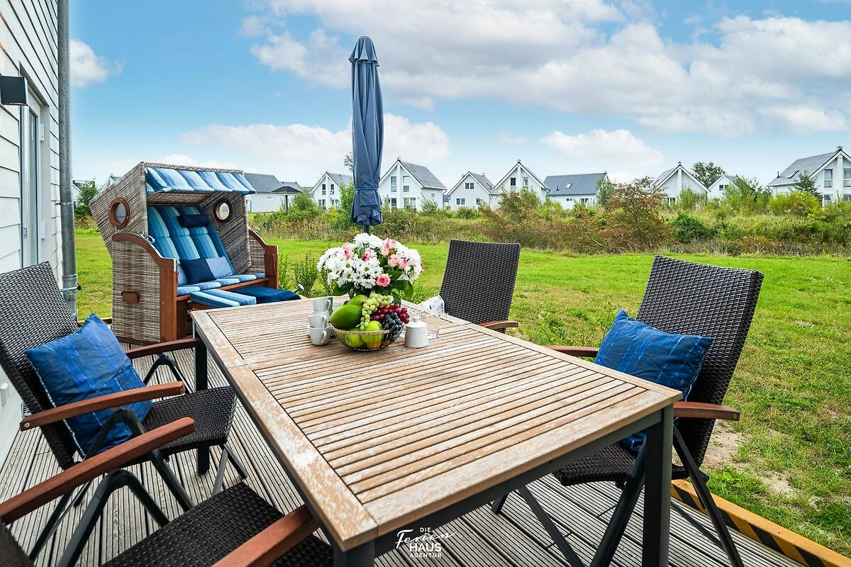 Und wenn die Sonne lockt, wartet bereits die große Terrasse auf euch. Diese erreicht der/die Rolli-Fahrer/in problemlos über eine kleine Holzschwelle. Hier lässt sich die frische Ostseeluft und die Sommersonne in vollen Zügen auskosten. Mit Gartenmöbeln, XL-Strandkorb und Grill lassen sich auch gemeinsame Grillabende verbringen.