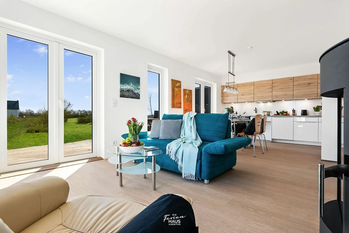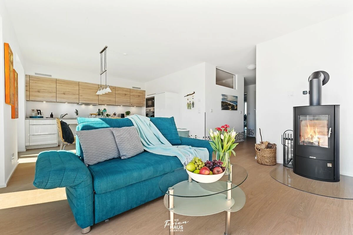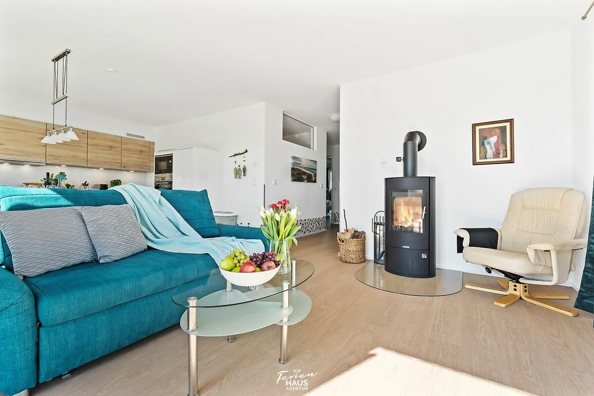 Die Einrichtung im nordischen, modernen Stil heißt einen willkommen und verbreitet Wohlfühlstimmung. Hier sorgen ein gemütliches Zweiersofa mit Schlaffunktion, ein Fernseher und ein Kaminofen auch an Schietwetter Tagen oder nach einem langen Strandtag für wohlige Wärme und Gemütlichkeit.