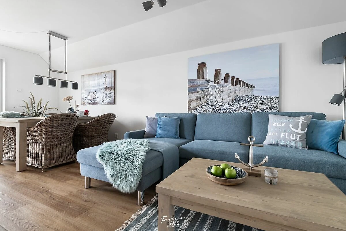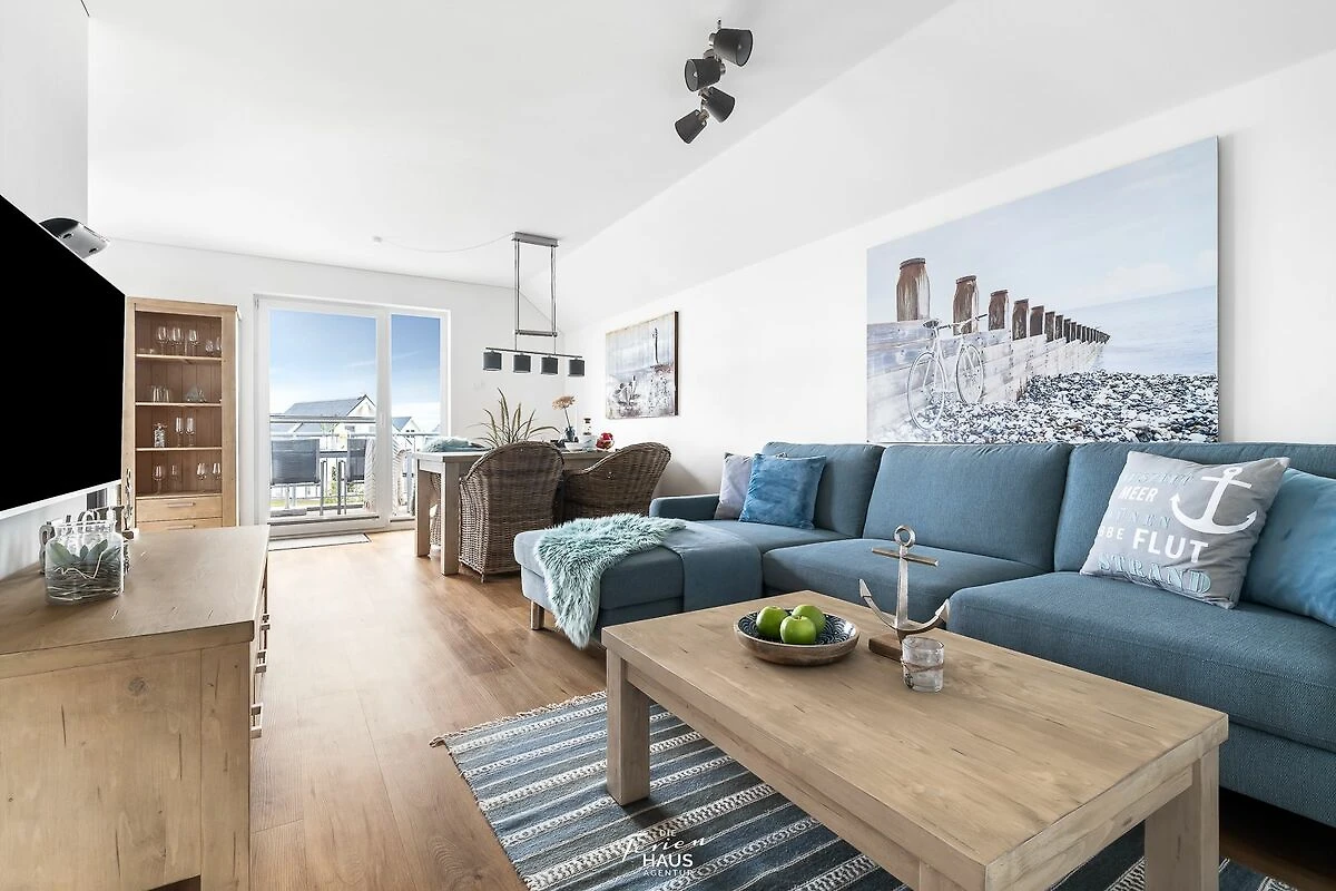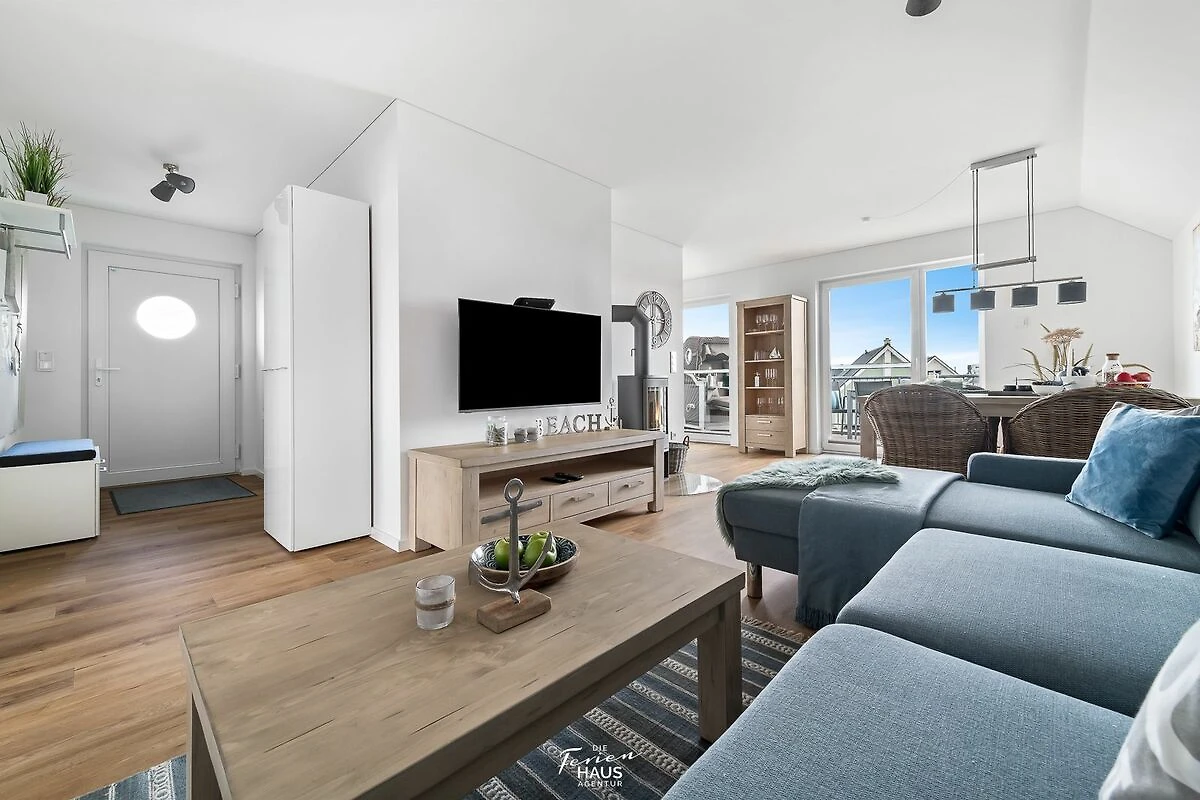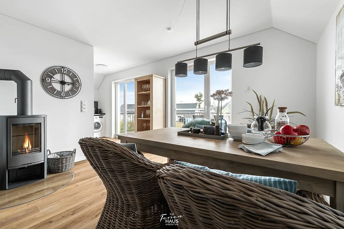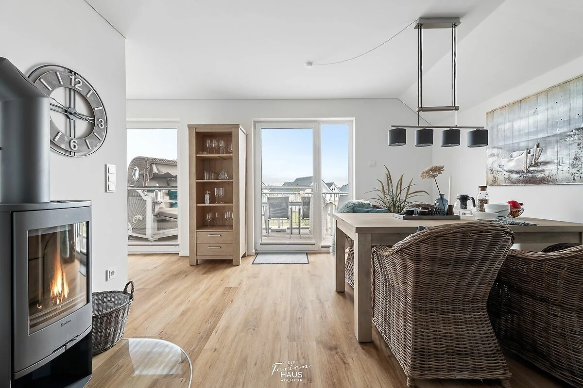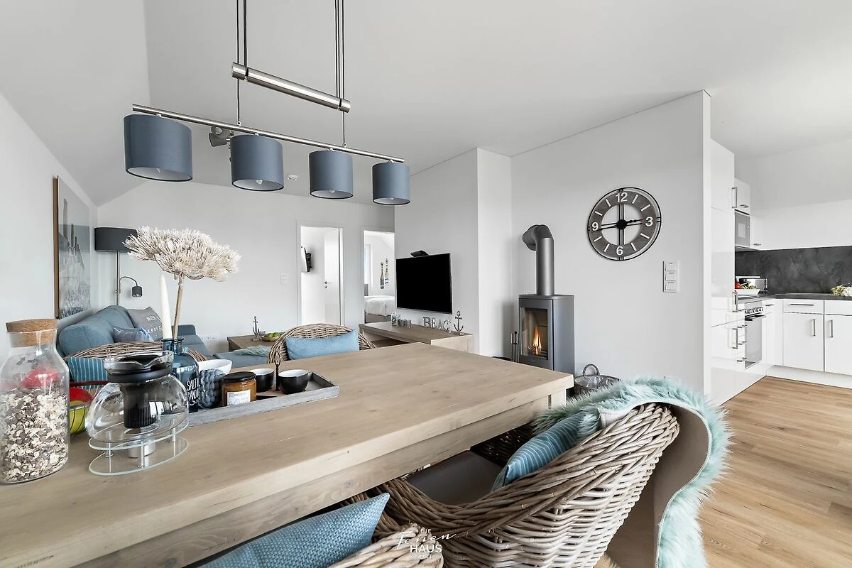 Beim Betreten der Wohnung begrüßt euch der helle und freundliche Wohnbereich mit seinen bodentiefen Fensterfronten. Die frische nordische Einrichtung sorgt direkt für Urlaubsfeeling. Lasst die Seele baumeln und genießt die Ostseesonne im Strandkorb auf der geräumigen Terrasse oder den Abend mit einem guten Buch und einem Glas Wein auf dem kuscheligen Sofa vor dem knisternden Kamin. Erholung pur!