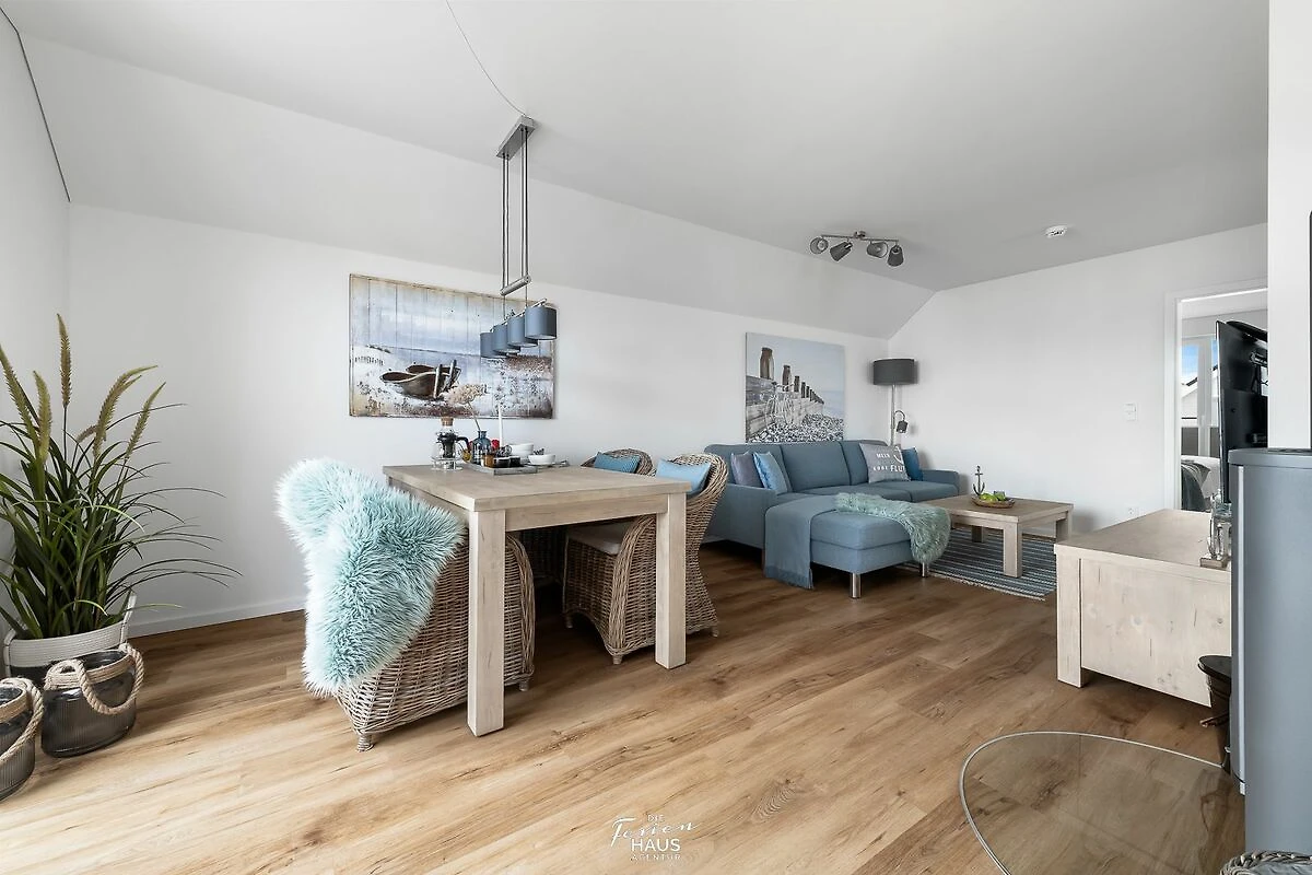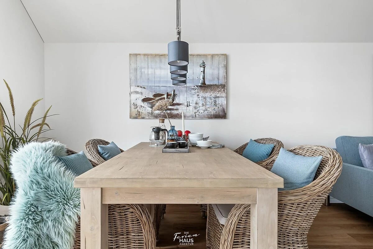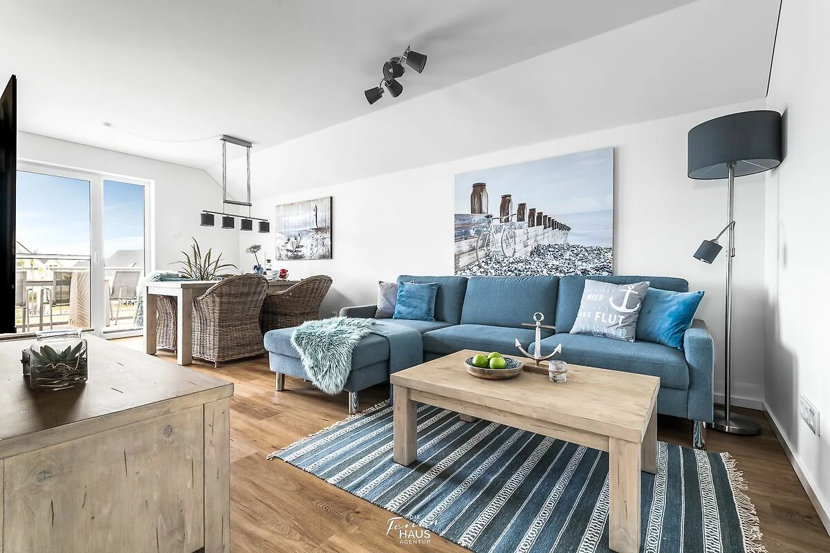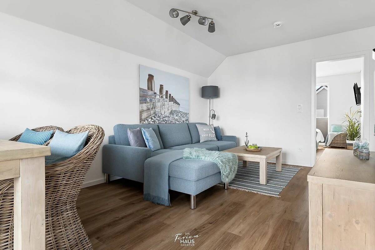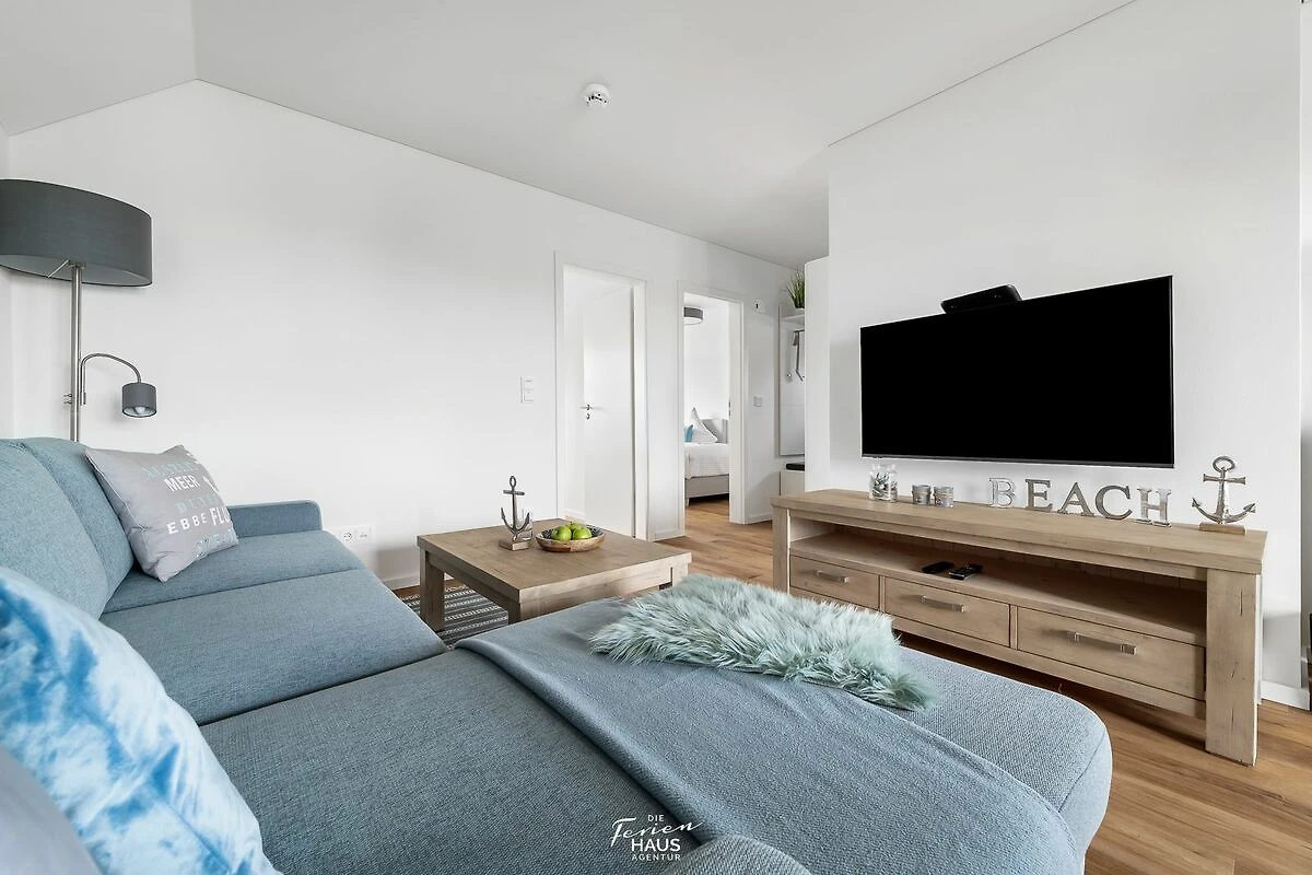 Beim Betreten der Wohnung begrüßt euch der helle und freundliche Wohnbereich mit seinen bodentiefen Fensterfronten. Die frische nordische Einrichtung sorgt direkt für Urlaubsfeeling. Lasst die Seele baumeln und genießt die Ostseesonne im Strandkorb auf der geräumigen Terrasse oder den Abend mit einem guten Buch und einem Glas Wein auf dem kuscheligen Sofa vor dem knisternden Kamin. Erholung pur!