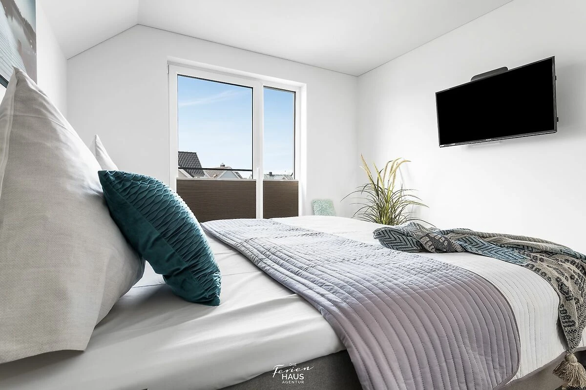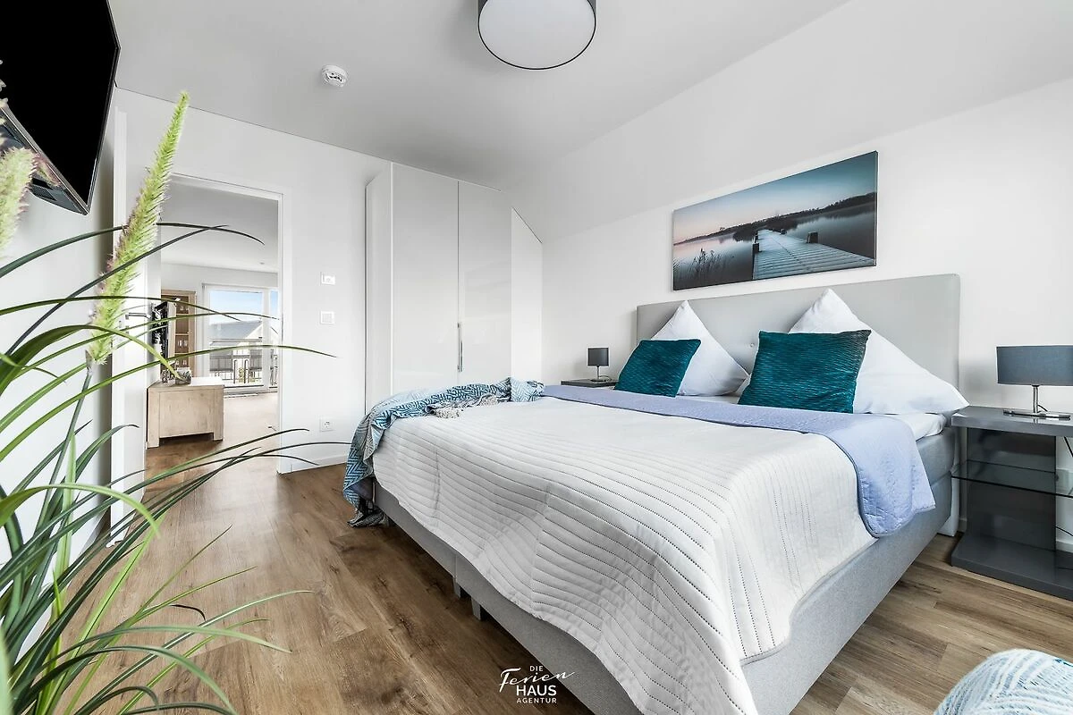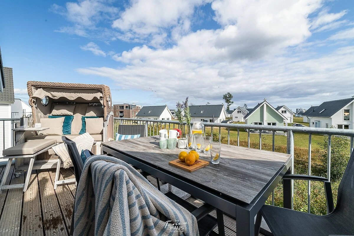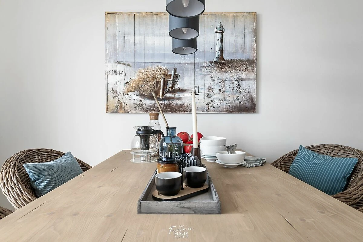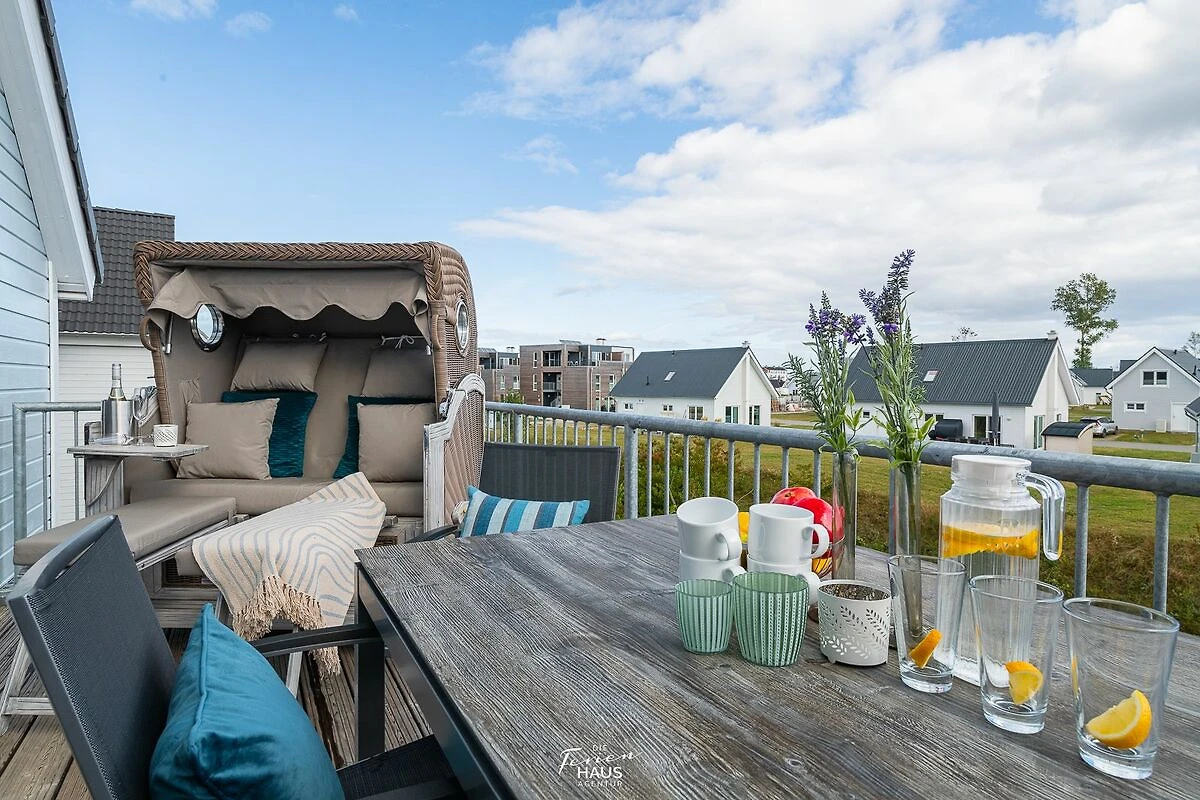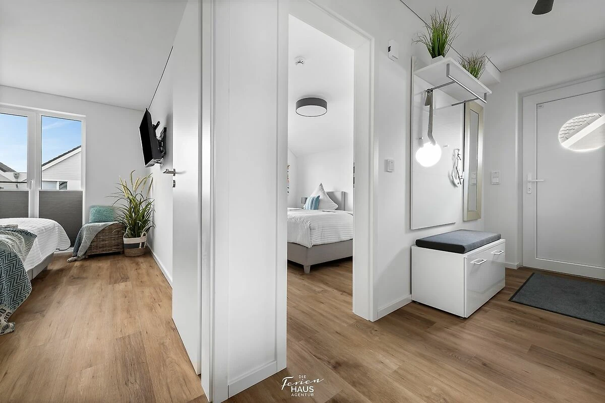 Beim Betreten der Wohnung begrüßt euch der helle und freundliche Wohnbereich mit seinen bodentiefen Fensterfronten. Die frische nordische Einrichtung sorgt direkt für Urlaubsfeeling. Lasst die Seele baumeln und genießt die Ostseesonne im Strandkorb auf der geräumigen Terrasse oder den Abend mit einem guten Buch und einem Glas Wein auf dem kuscheligen Sofa vor dem knisternden Kamin. Erholung pur!