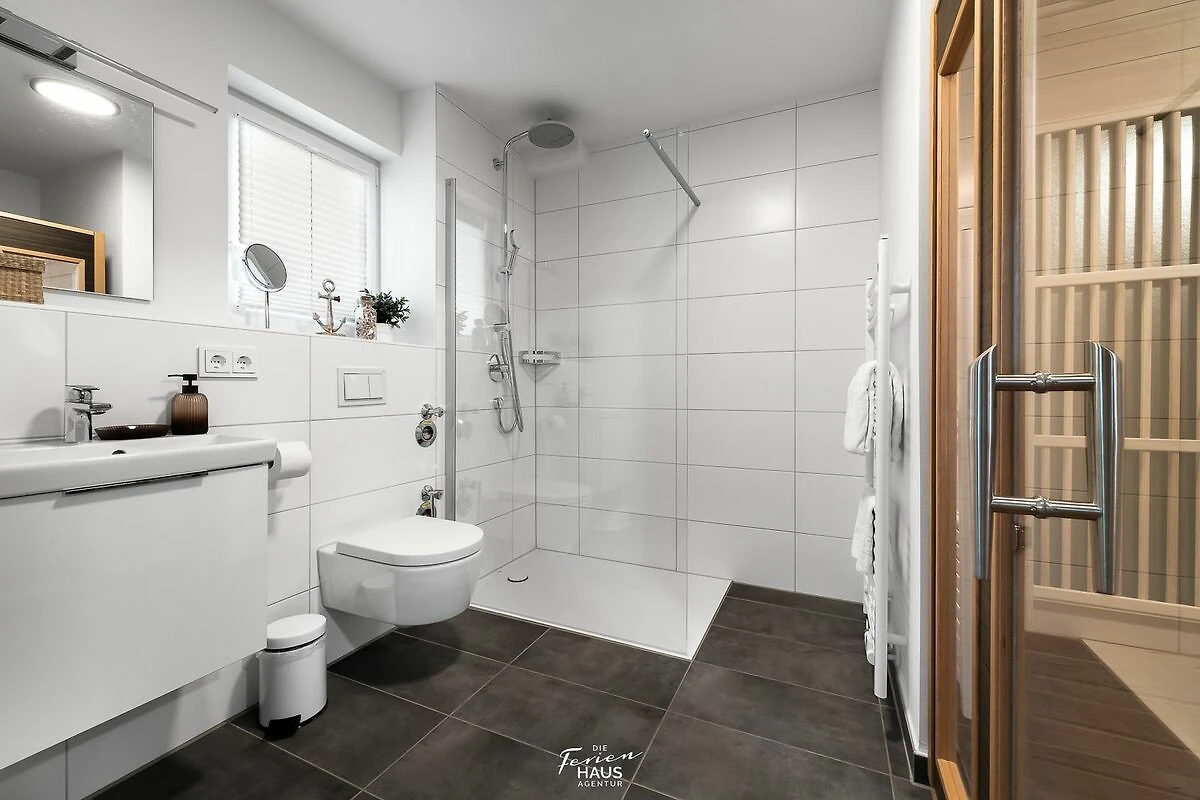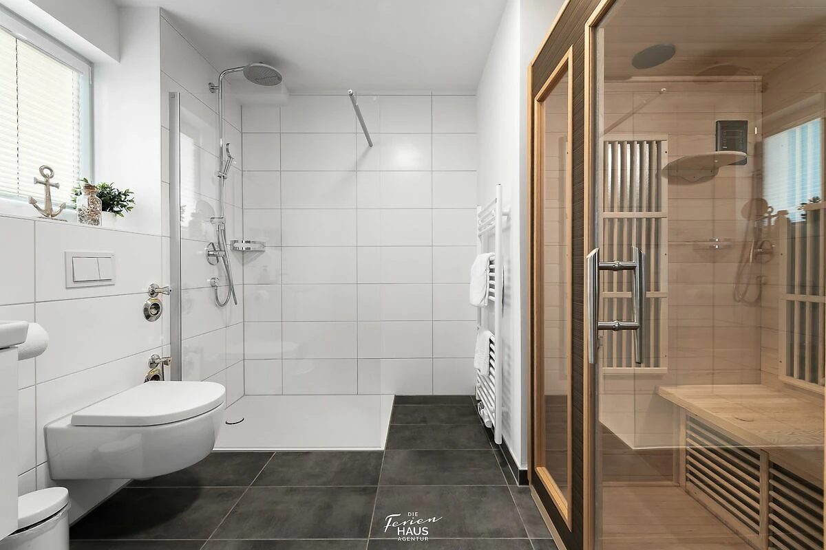 Für den perfekten Abschluss eines erlebnisreichen Urlaubstages sorgt das Bad. Eure ganz eigenen kleine Wellnessoase mit bodengleicher Dusche und einer Infrarot-Sauna.