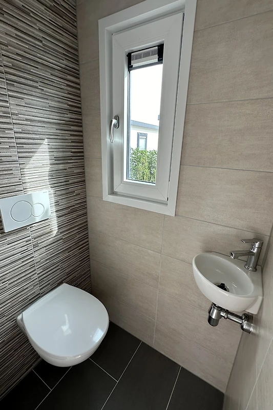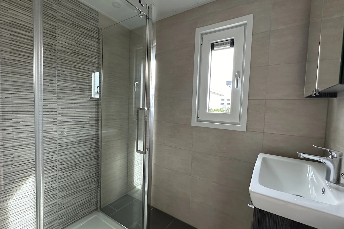 Badezimmer mit Dusche und Waschbecken. Separate Toilettenraum