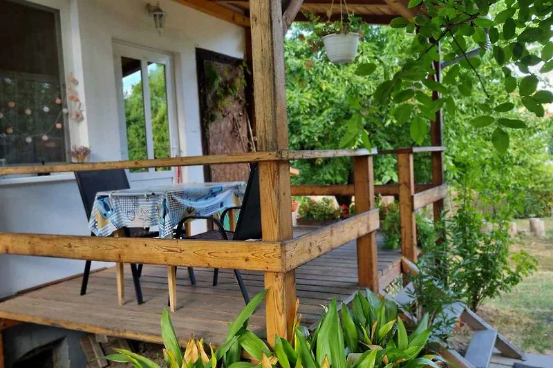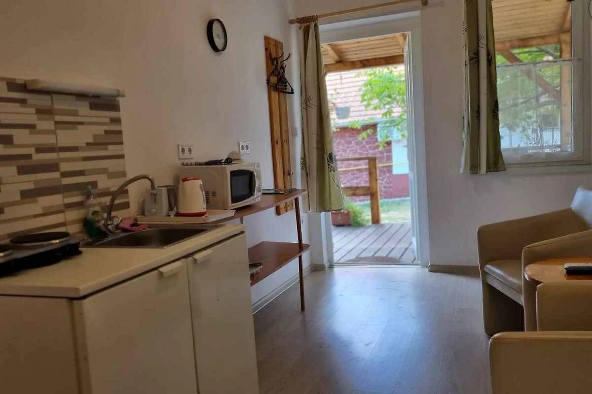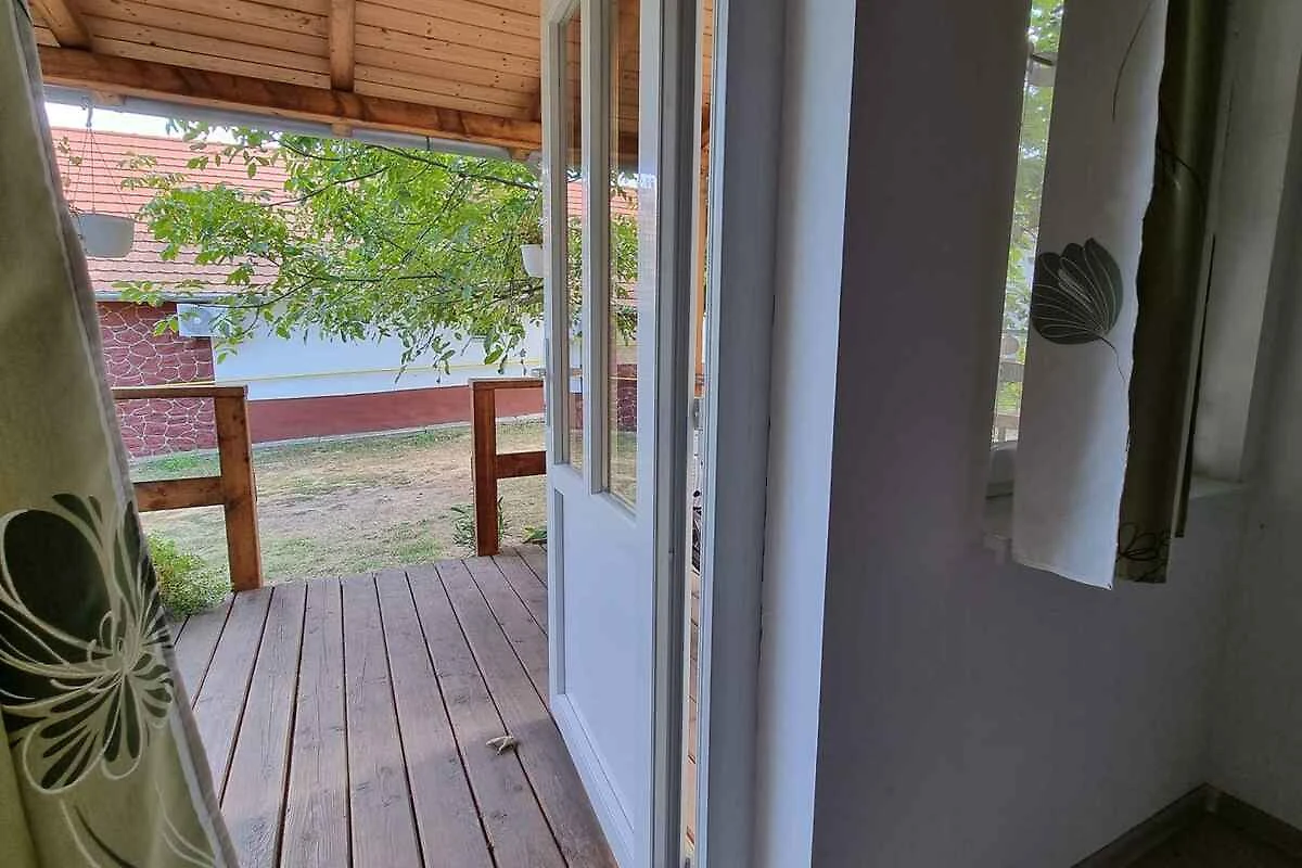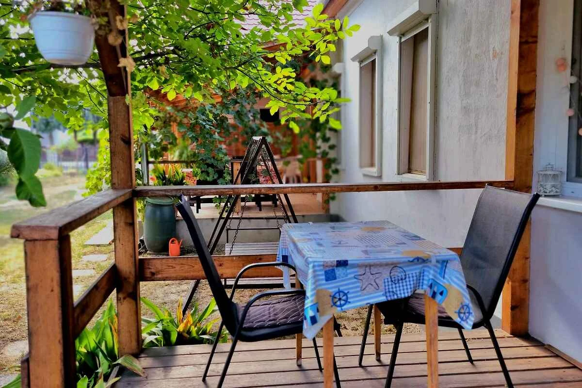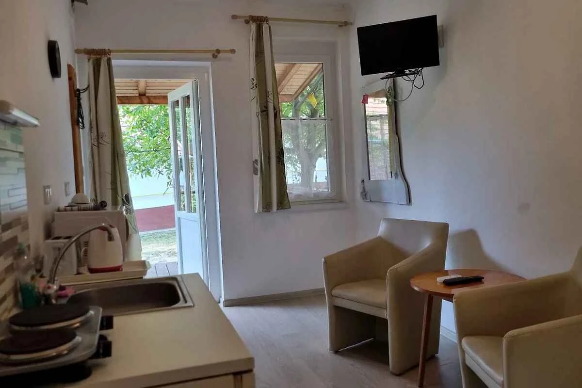 Balatonlelle. Das Studio befindet sich auf einem geschlossenen Gartengrundstück mit Wiese, von einem Zaun begrenzt. Der Vermieter wohnt ständig in einem separaten Gebäude auf dem Grundstück. Das Studio-Apartment hat eine separate Terrasse. Die Zufahrt erfolgt über eine Nebenstrasse (asphaltiert). Parkplatz auf dem Grundstück.