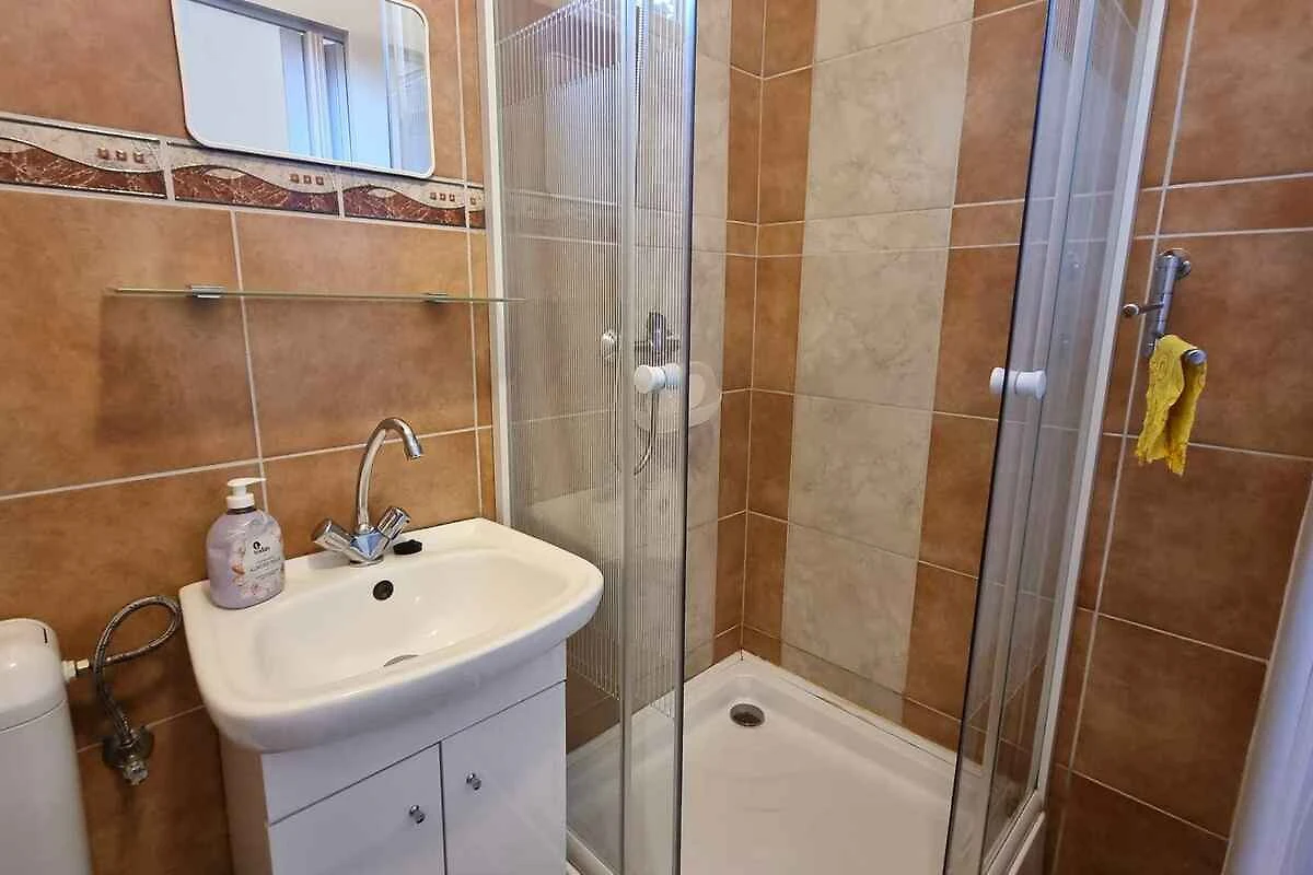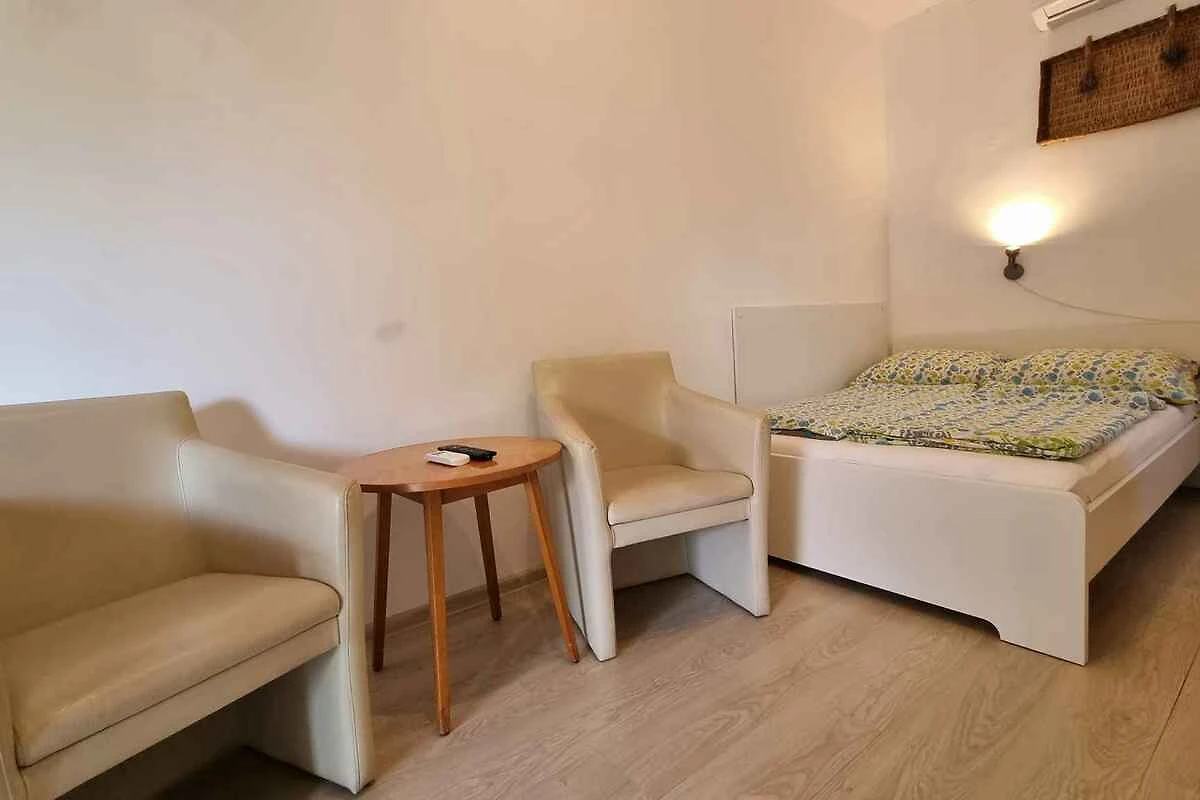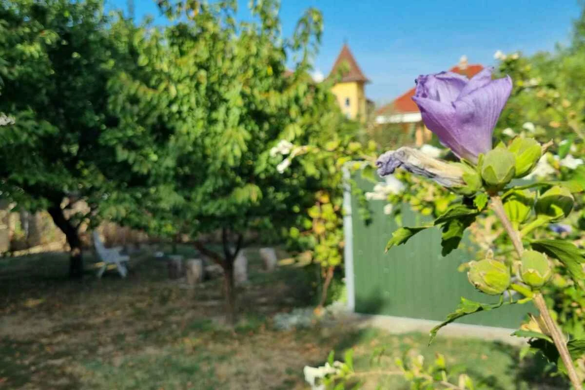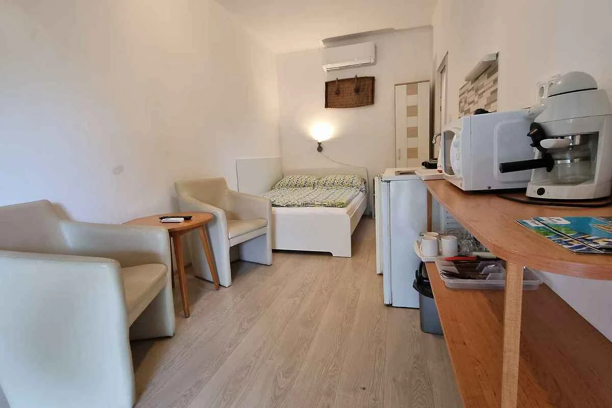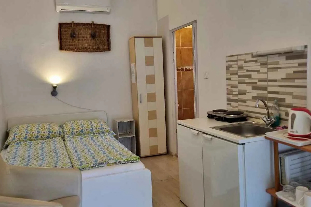 Balatonlelle. Das Studio befindet sich auf einem geschlossenen Gartengrundstück mit Wiese, von einem Zaun begrenzt. Der Vermieter wohnt ständig in einem separaten Gebäude auf dem Grundstück. Das Studio-Apartment hat eine separate Terrasse. Die Zufahrt erfolgt über eine Nebenstrasse (asphaltiert). Parkplatz auf dem Grundstück.
