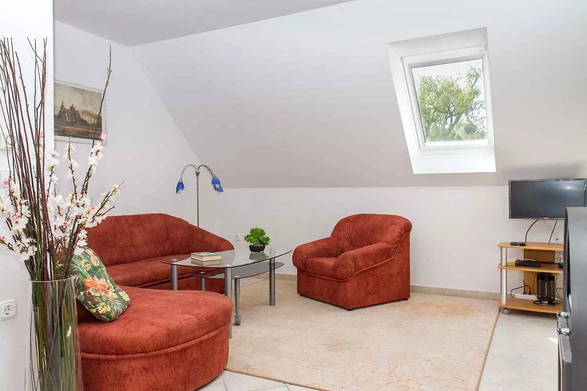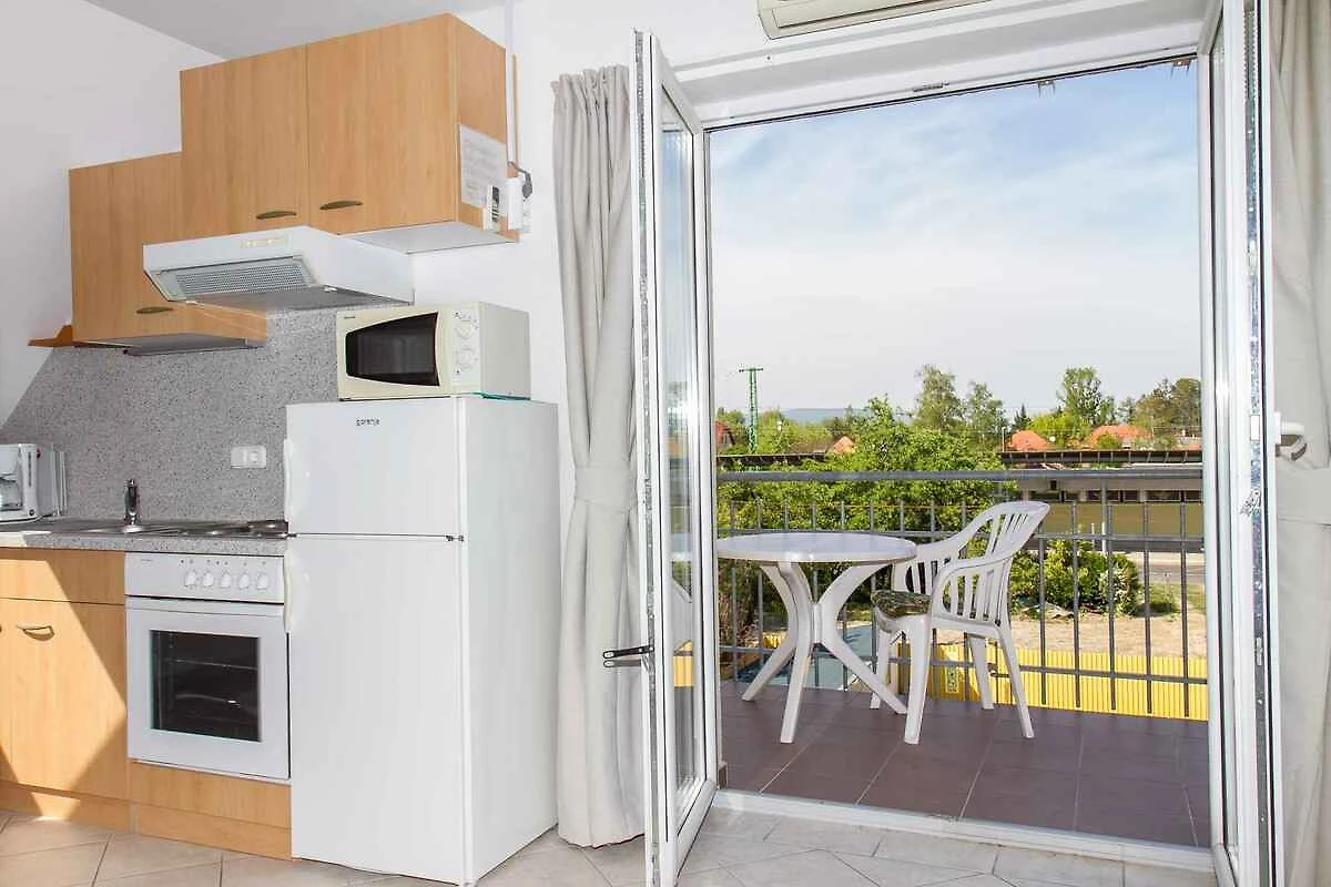 Balatonmáriafürdő. Die Ferienwohnung befindet sich auf einem 600 qm grossen, geschlossenen Gartengrundstück mit Wiese, Blumen und Sträuchern, von einem Zaun begrenzt. Der Vermieter wohnt nicht im Haus oder auf dem Grundstück. Die Zufahrt erfolgt über eine Nebenstrasse (asphaltiert). Parkplatz (für 1 Pkw) auf dem Grundstück.