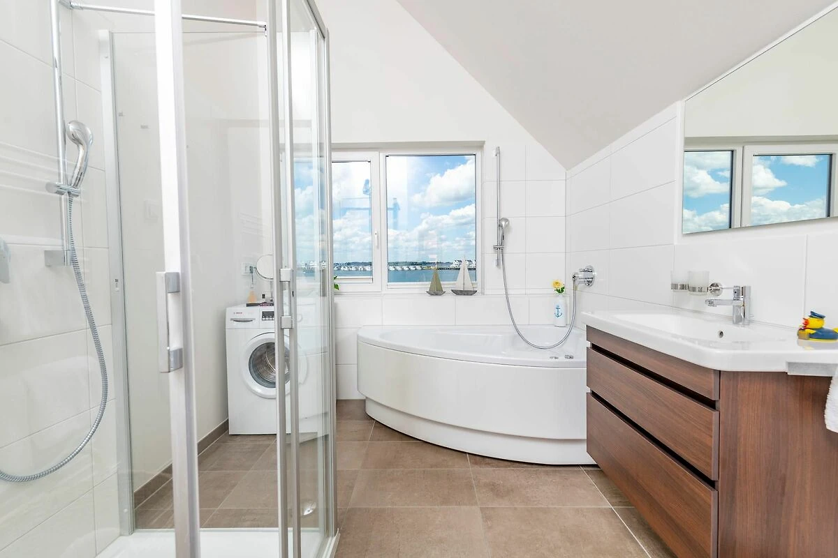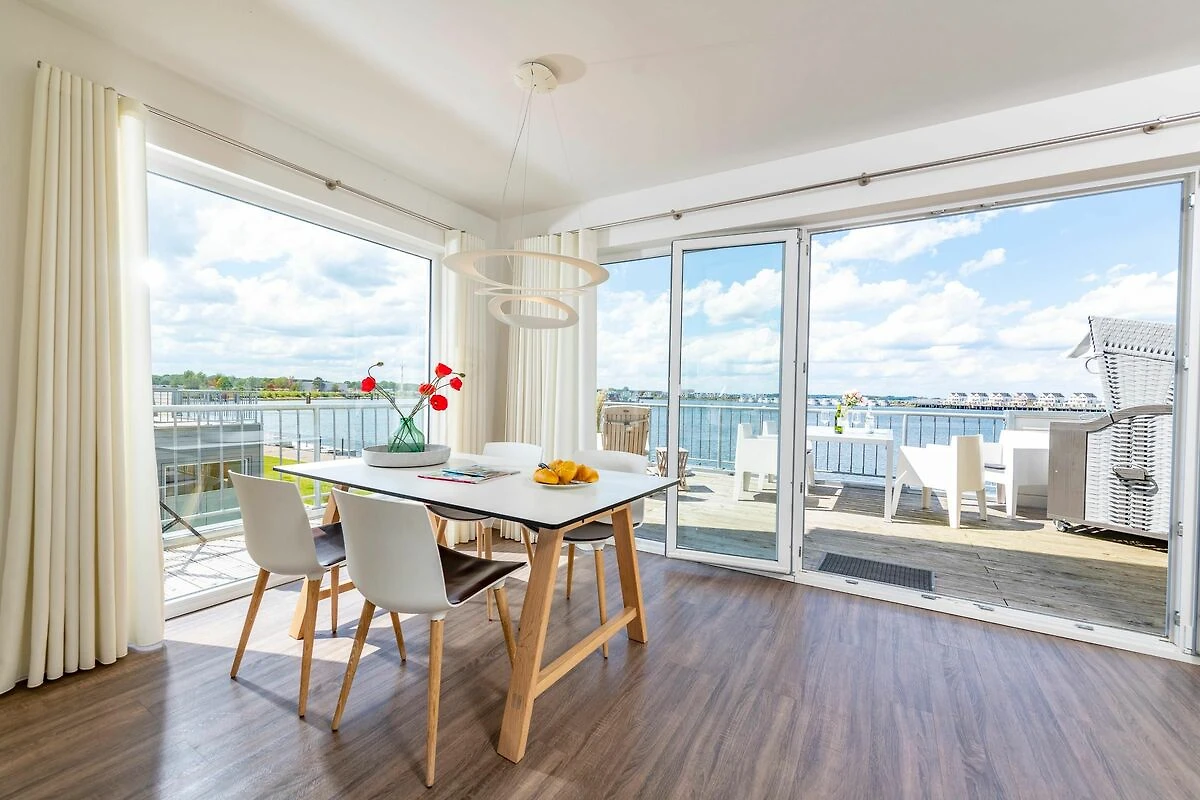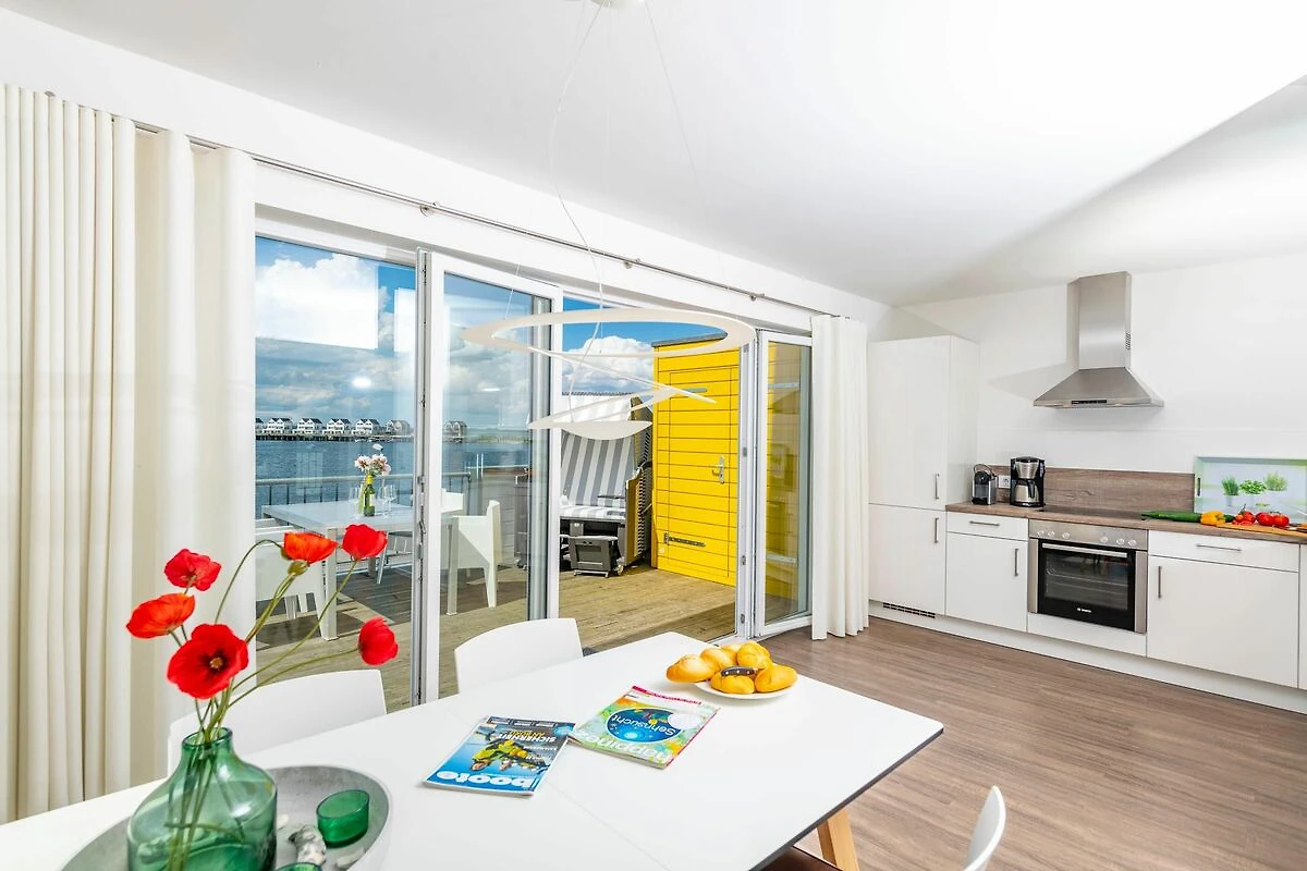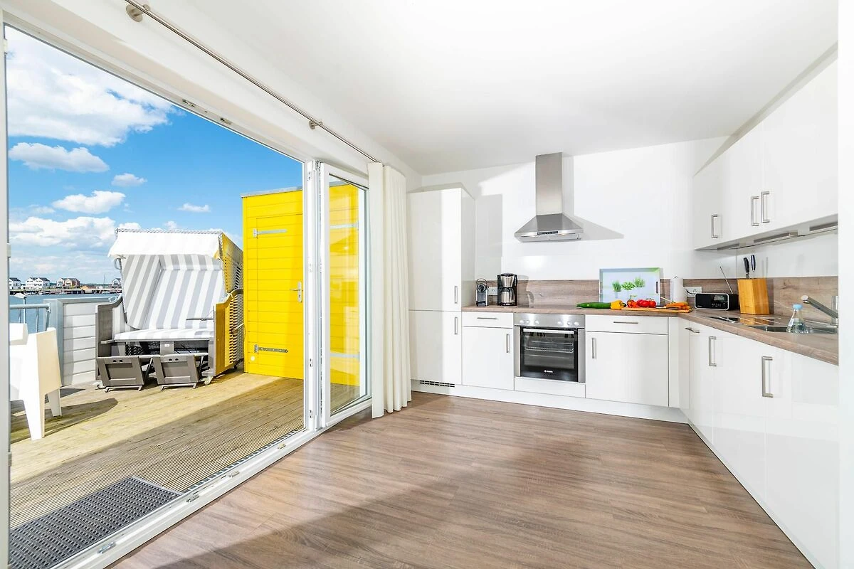 Traumhafte Aussichten eröffnen sich auf der an den Wohnbereich angrenzenden Terrasse mit Blick über den Segel- und Sportboothafen des OstseeResort Olpenitz. Hafenkino sorgt hier für Unterhaltung während eines geselligen Grillabends oder romantischen Candle-Light-Dinners bei Sonnenuntergang. Die Wohnküche ist erstklassig ausgestattet und erlaubt vollen Urlaubskomfort. Frühstück lässt sich gemeinsam an dem großen Esstisch und bei wunderschöner Morgensonne auf der 24m2 großen Terrasse genießen.