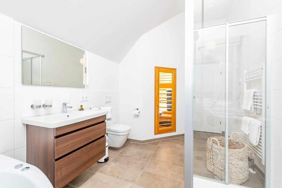 Besonderen Komfort bieten die Badezimmer pro Wohnebene (Badewanne mit Whirlpool und Dusche im DG und ein Duschbad im 1. OG).