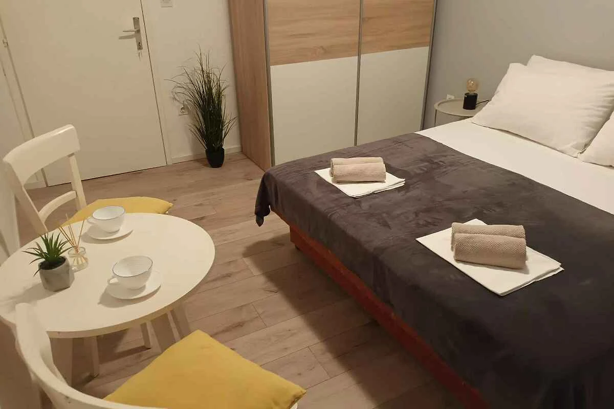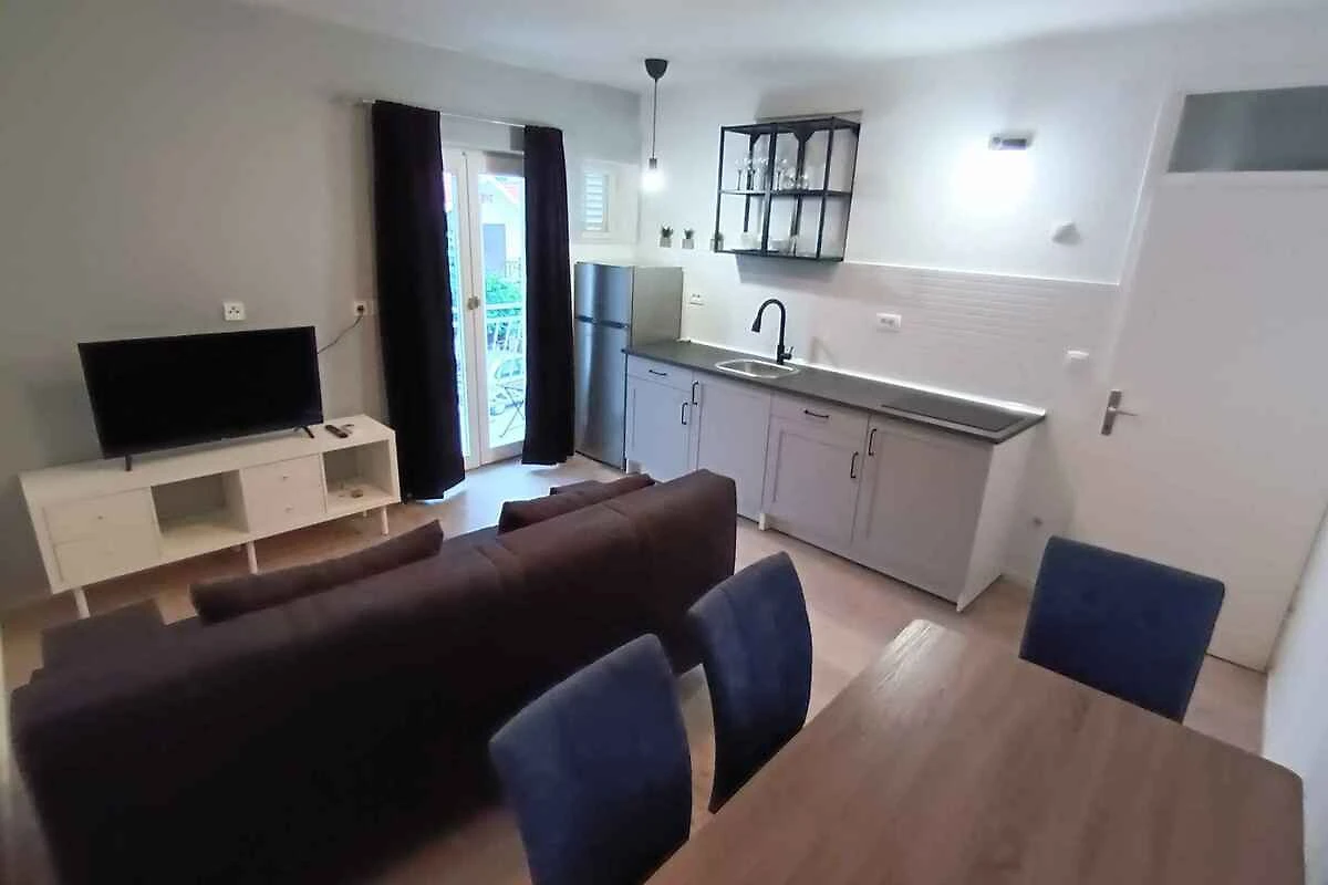 Tribunj. Die Ferienwohnung befindet sich auf einem 200 qm grossen Gartengrundstück. Der Vermieter wohnt im Haus, nutzt jedoch einen separaten Eingang. Die Zufahrt erfolgt über eine Nebenstrasse (asphaltiert). Parkplatz: vor dem Haus.