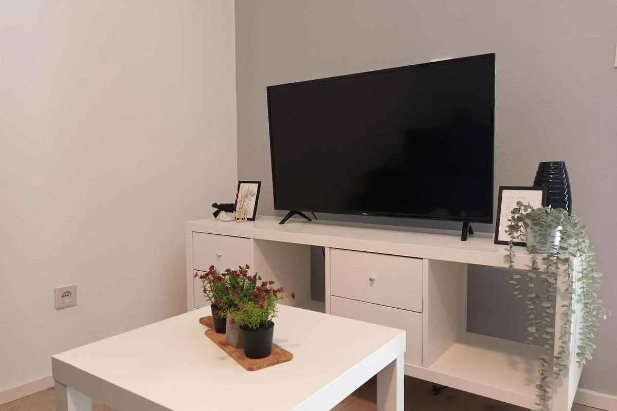 . Wohnzimmer mit 2 Zusatzbetten auf Doppelausziehcouch, TV und Zugang zum Balkon (5 qm). Schlafzimmer (12 qm) mit 1 Doppelbett. Kochecke im Wohnzimmer mit Kühlschrank (Eisfach), Kaffeemaschine und Kochfeld, Geschirr und Besteck. Bad mit Dusche, 1 Waschbecken, WC und Haartrockner (nach Bestellung).