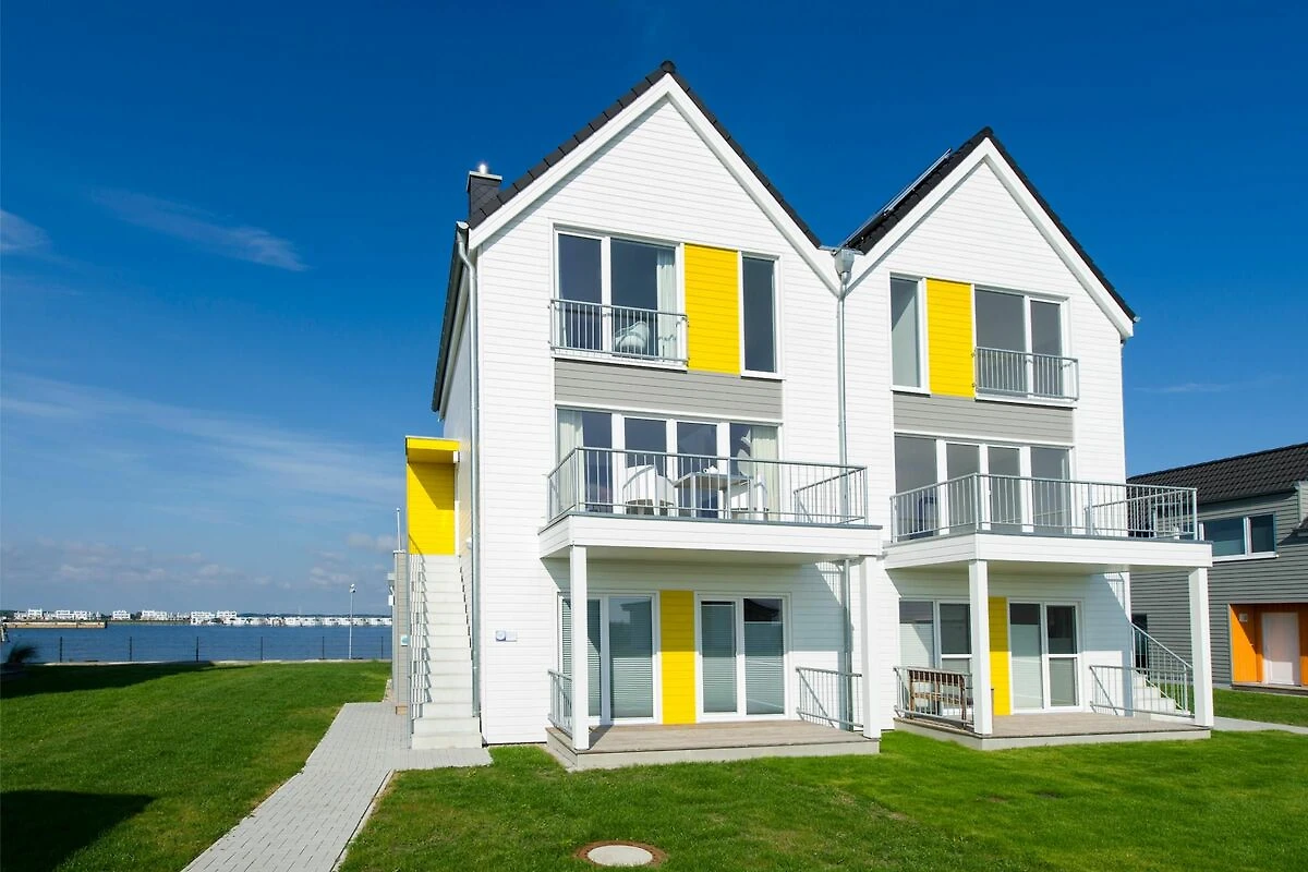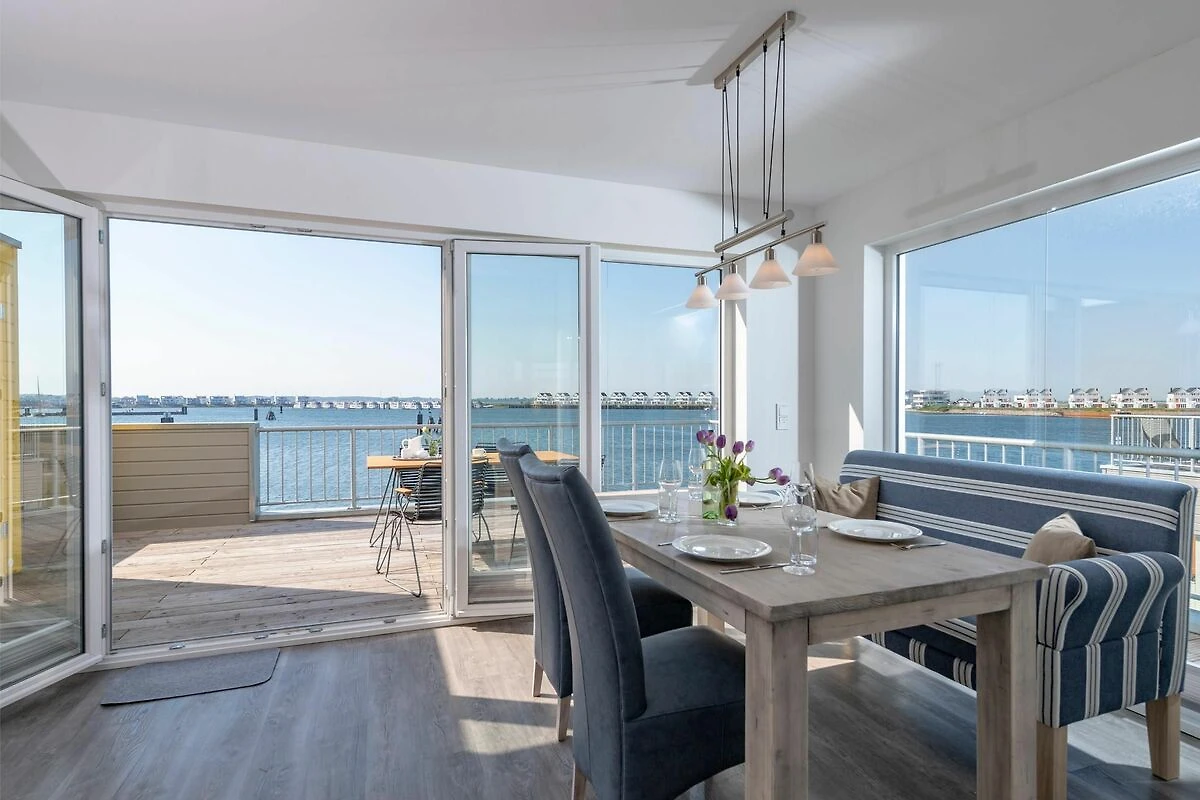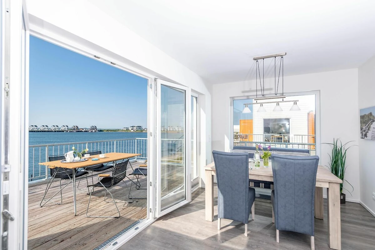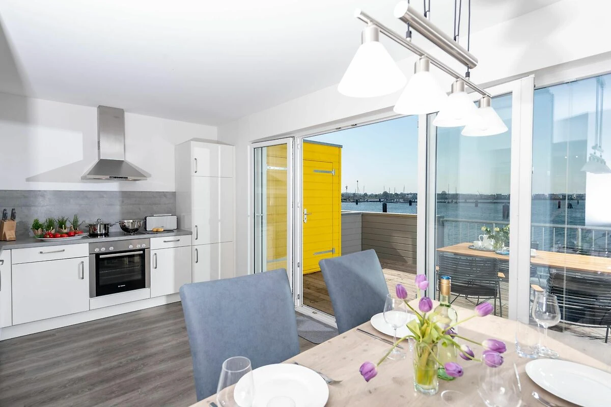 Bodentiefe Fensterfronten machen das Wasser zum Greifen nah und schaffen einen lichtdurchfluteten Wohnraum. Frische Energien tanken lässt es sich bei einem Frühstück auf der gen Osten ausgerichteten Terrasse. Wer früh genug ausgeschlafen hat, kann hier traumhafte Sonnenaufgänge beobachten. Nach einem ausgiebigen Strandtag lädt die gen Westen ausgerichtete Terrasse mit Sonnenuntergangsgarantie zum romantischen Candle Light Dinner oder einem geselligen Grillabend ein. Hafenkino ist hierbei garantiert.
