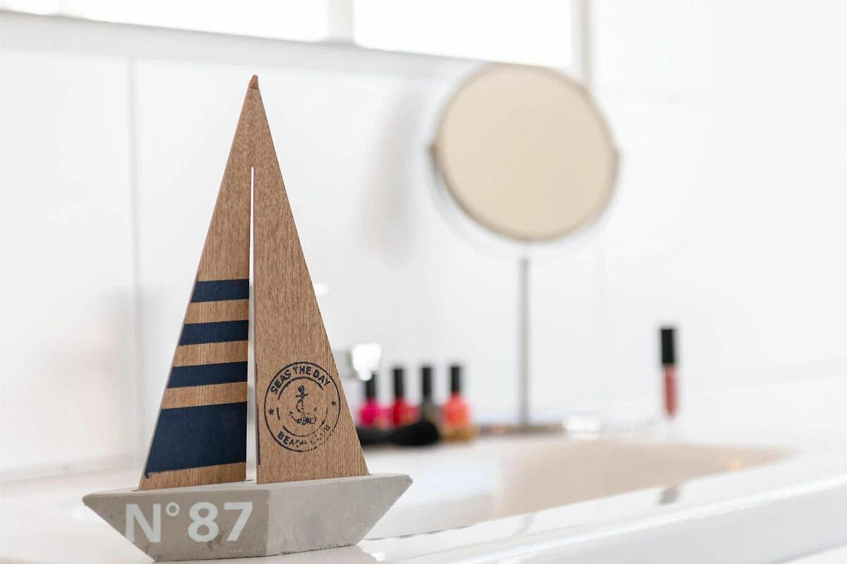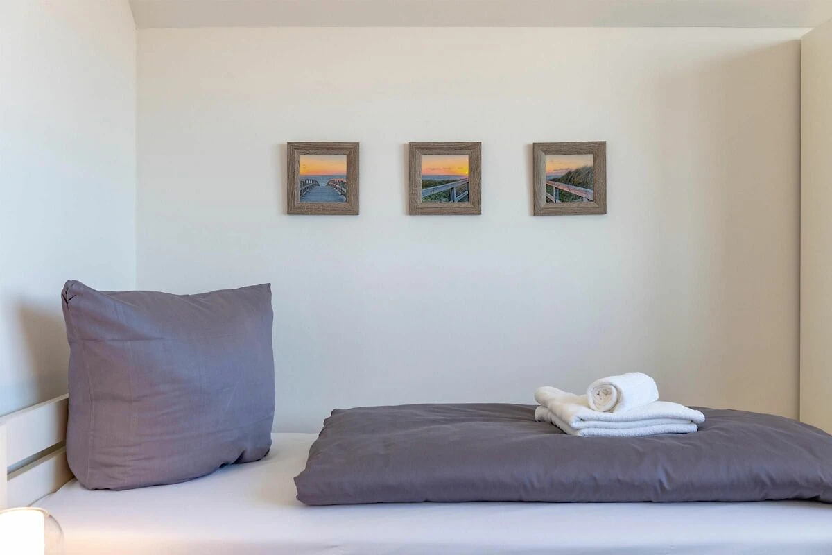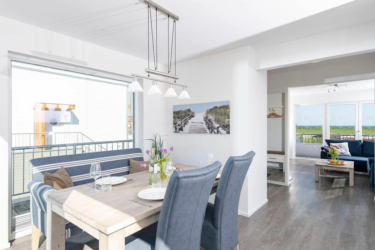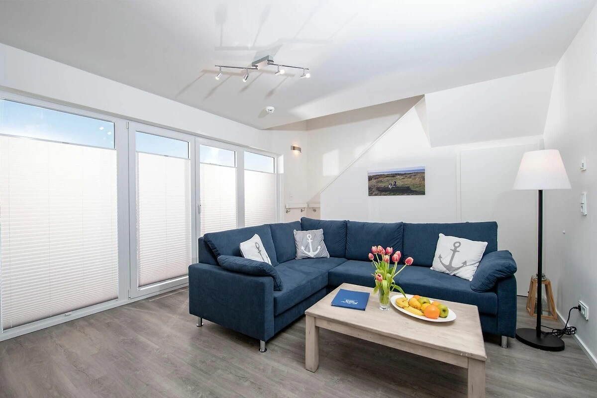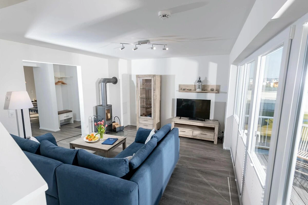Bodentiefe Fensterfronten machen das Wasser zum Greifen nah und schaffen einen lichtdurchfluteten Wohnraum. Frische Energien tanken lässt es sich bei einem Frühstück auf der gen Osten ausgerichteten Terrasse. Wer früh genug ausgeschlafen hat, kann hier traumhafte Sonnenaufgänge beobachten. Nach einem ausgiebigen Strandtag lädt die gen Westen ausgerichtete Terrasse mit Sonnenuntergangsgarantie zum romantischen Candle Light Dinner oder einem geselligen Grillabend ein. Hafenkino ist hierbei garantiert.