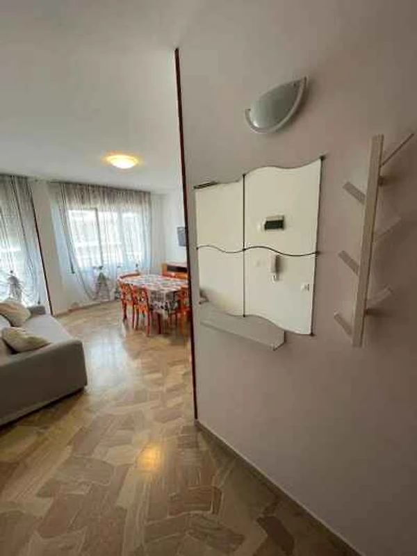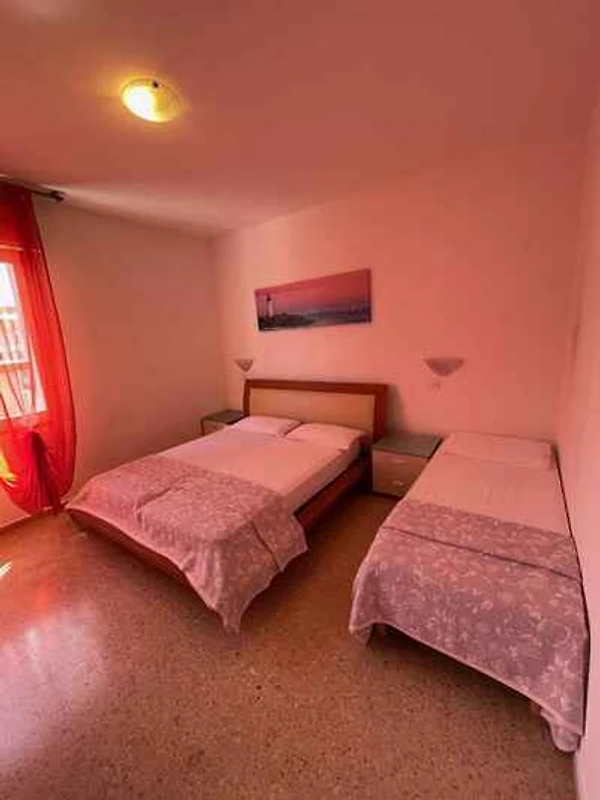 Der Eingang in Ihre Ferienwohnung befindet sich in der 2. Etage und führt direkt in das Wohn/Schlafzimmer. Wohnzimmer mit 2 Zusatzbetten auf Doppelausziehcouch, Sitzecke, TV, Essecke (6 Plätze) und Zugang zum Balkon. Schlafzimmer mit 1 Doppelbett. Schlafzimmer mit 1 Doppelbett und 1 Einzelbett. Küche mit Elektroherd (4 Platten), Backofen, Kühlschrank (Eisfach), Mikrowelle und Zugang zum Balkon. Bad mit Waschmaschine, Dusche, 1 Waschbecken, WC und Bidet.
