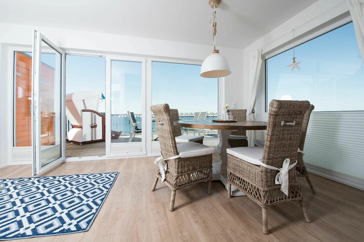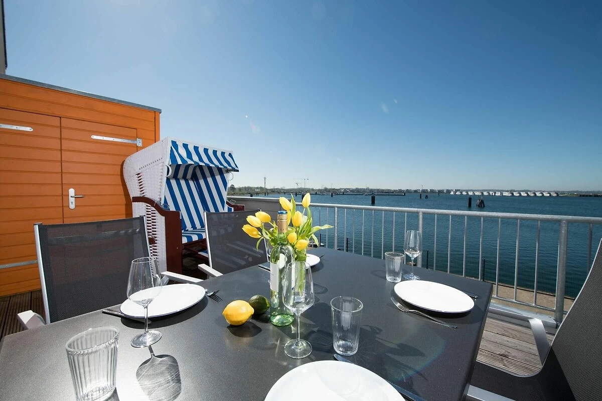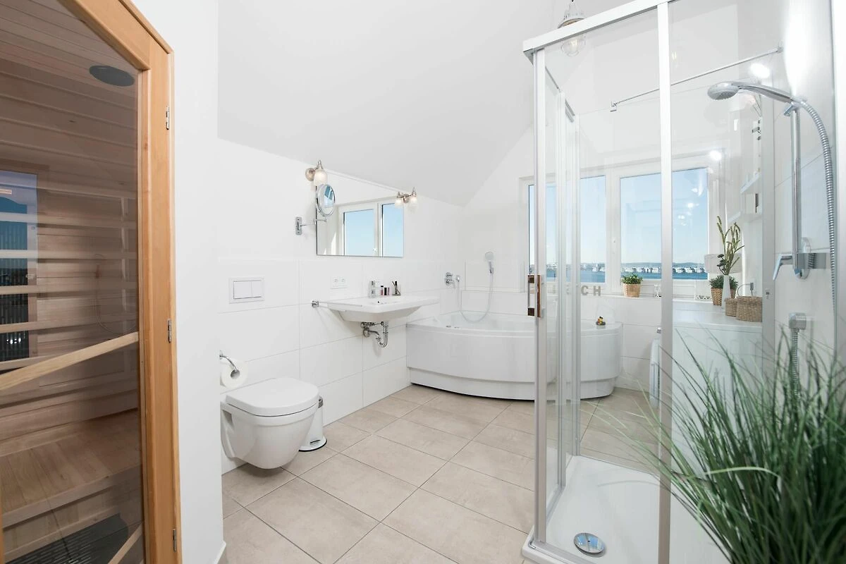 Die direkte Wasserlage, zwei Terrassen mit Morgen- und Abendsonne, ein privater Wellness Bereich und die unmittelbare Nähe zum Weidefelder Sandstrand lassen Urlaubsherzen in diesem Ferienobjekt höher schlagen. Auch die Hafenpromenade des OstseeResort Olpenitz befindet sich in unmittelbarer Nähe. Das ganze Objekt ist mit Fußbodenheizung ausgestattet. Sauna, Whirlwanne und Kaminofen versprechen Komfort zu jeder Jahreszeit.Offen und großzügig gestaltet mit hohen Decken erstreckt sich das Ferienobjekt über zwei Ebenen. Lichtdurchflutet gestaltet sich der Wohn- Essbereich des Ferienobjekts auf der ersten Ebene mit bodentiefen Panorama-Fensterfronten zu den anliegenden Terrassen auf beiden Seiten. Traumhafte Aussichten eröffnen sich auf der an den Wohnbereich angrenzenden Terrasse mit Blick über den Segel- und Sportboothafen des OstseeResort Olpenitz. Hafenkino sorgt hier für Unterhaltung während eines geselligen Grillabends oder romantischen Candle-Light-Dinners bei traumhaften Sonnenuntergängen. Für Indoor-Entertainment sorgt derweil der TV mit Telekom Home Entertainment Programm.