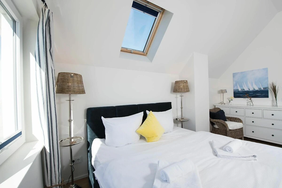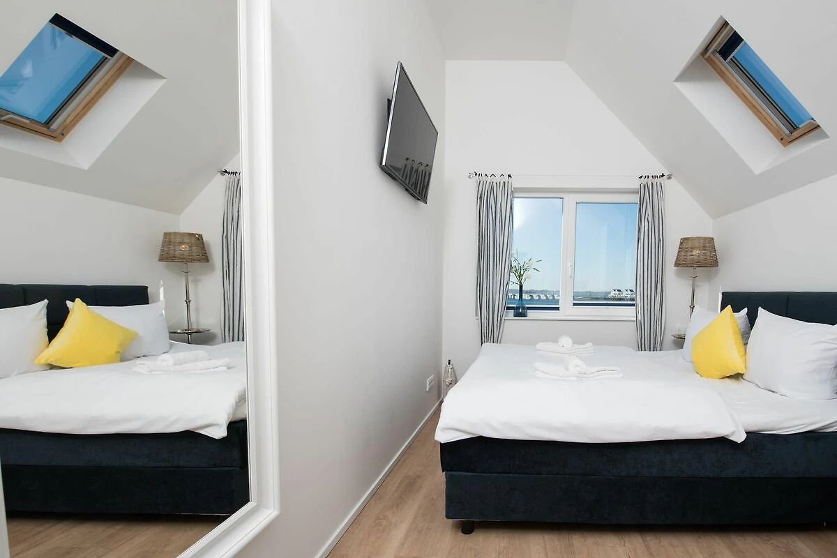 Auf der zweiten Ebene befindet sich der Ruhebereich dieses Ferienobjekts. Über den Dingen gelegen eröffnet das Hauptschlafzimmer neue Perspektiven: Mit einem Boxspring-Doppelbett ausgestattet verfügt dieses Schlafzimmer über einen traumhaften Hafenblick, während das Dachfenster den Blick in den Sternenhimmel ermöglicht. Wer will schlafen, wenn man auch wach so schön träumen kann? Das zweite Schlafzimmer verfügt über zwei flexibel zusammenschiebbare Einzelbetten. Ein fünfter Schlafplatz steht auf dem ausziehbaren Einzelbett zur Verfügung. Zudem sind beide Schlafzimmer mit Flatscreen-TVs ausgestattet.