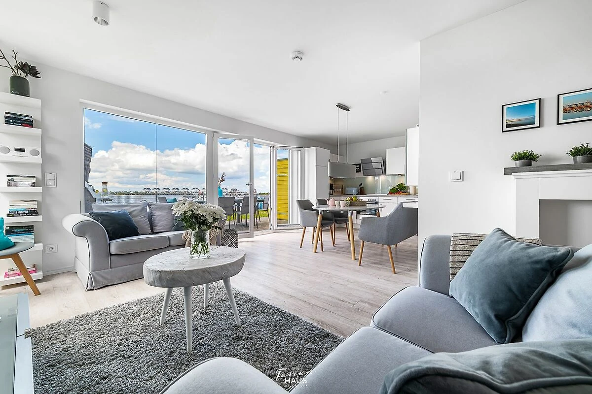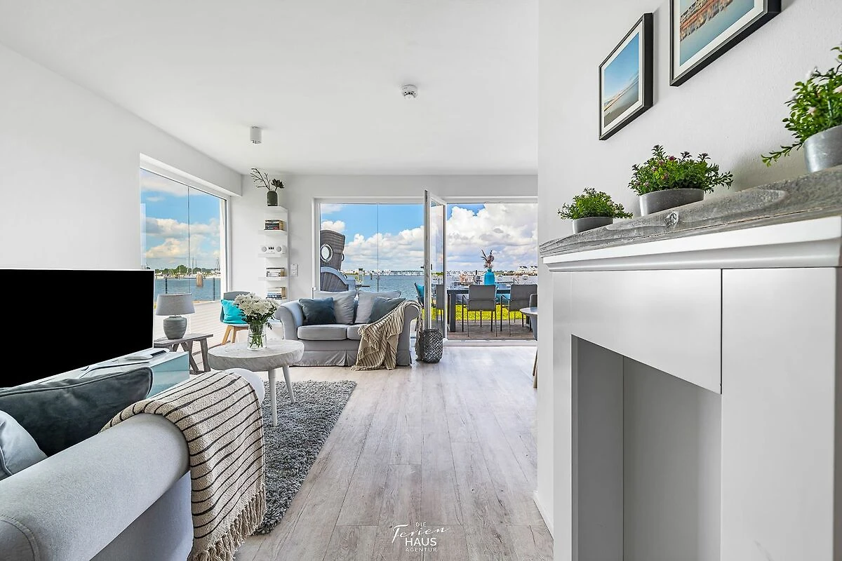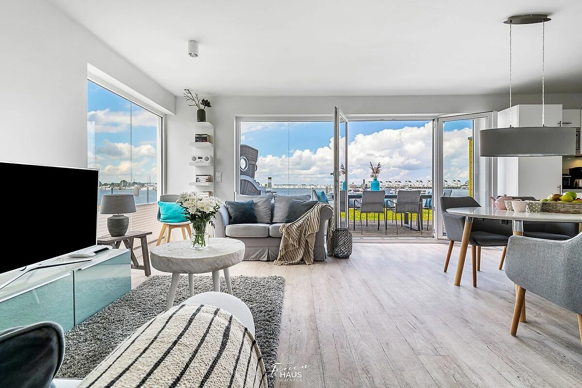 Traumhafte Aussichten eröffnen sich aus dem Wohnbereich und auf der angrenzenden Terrasse mit Blick über den Segel- und Sportboothafen des OstseeResort Olpenitz. Hafenkino sorgt hier für Unterhaltung während eines geselligen Grillabends oder romantischen Candle-Light-Dinners bei Sonnenuntergang.