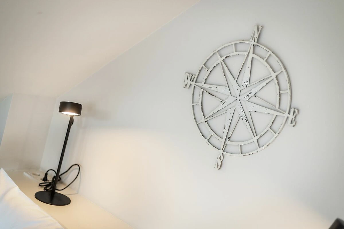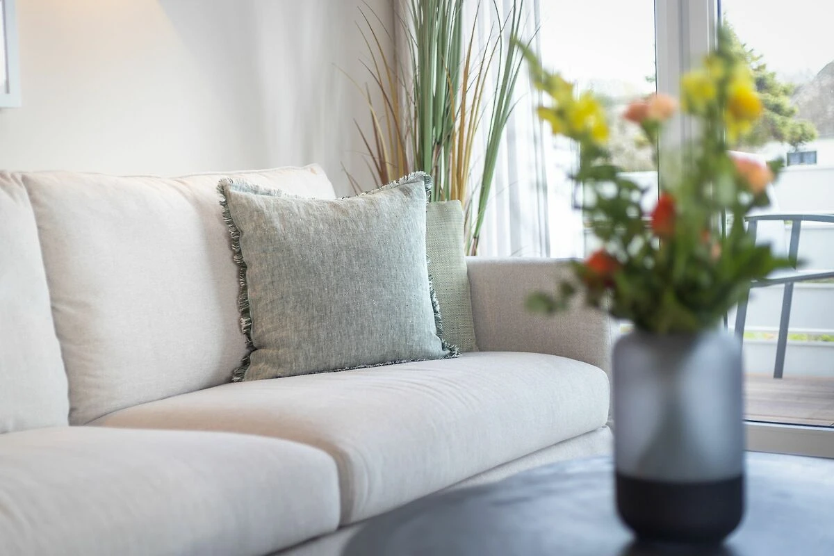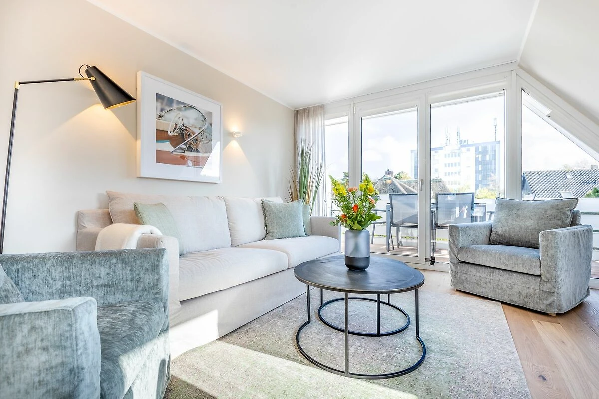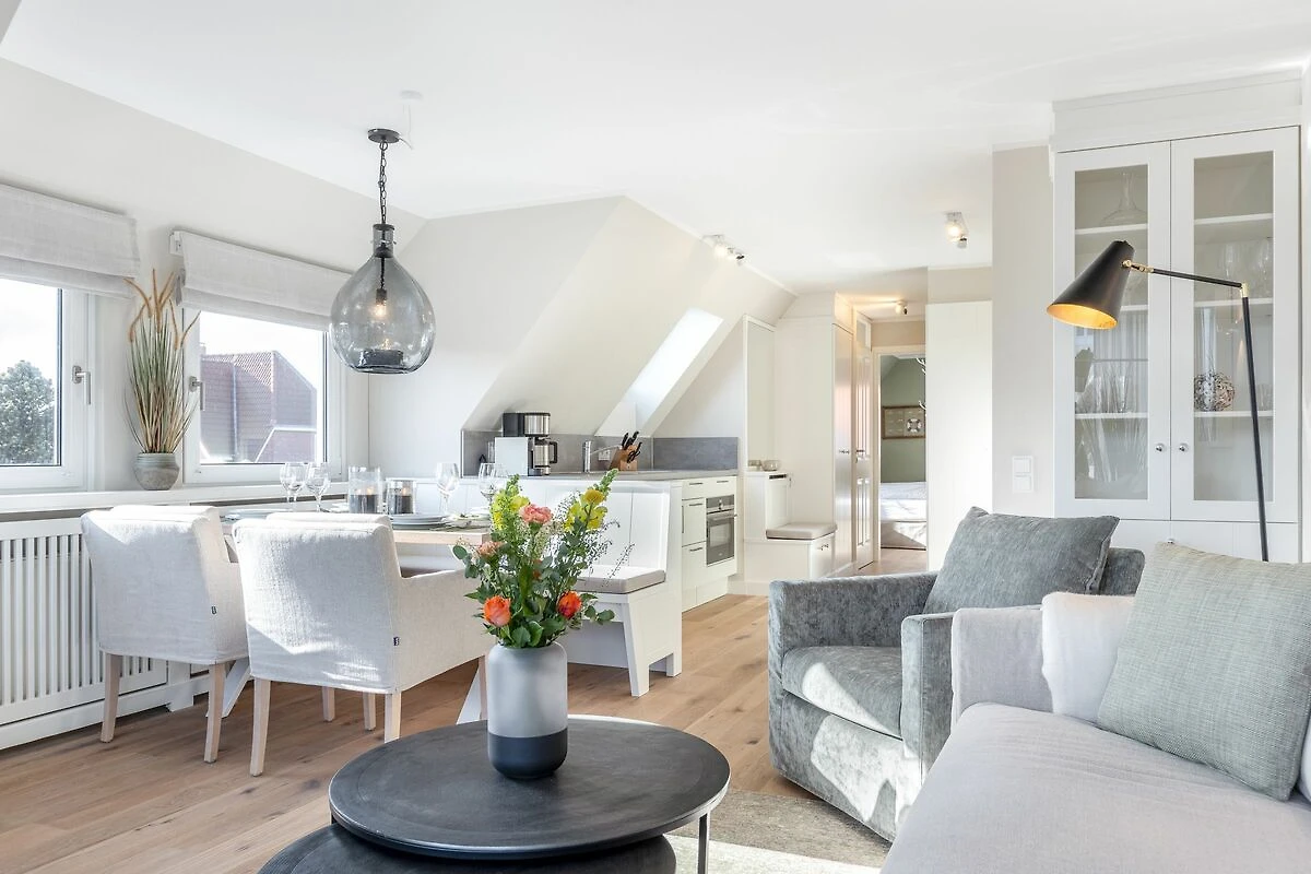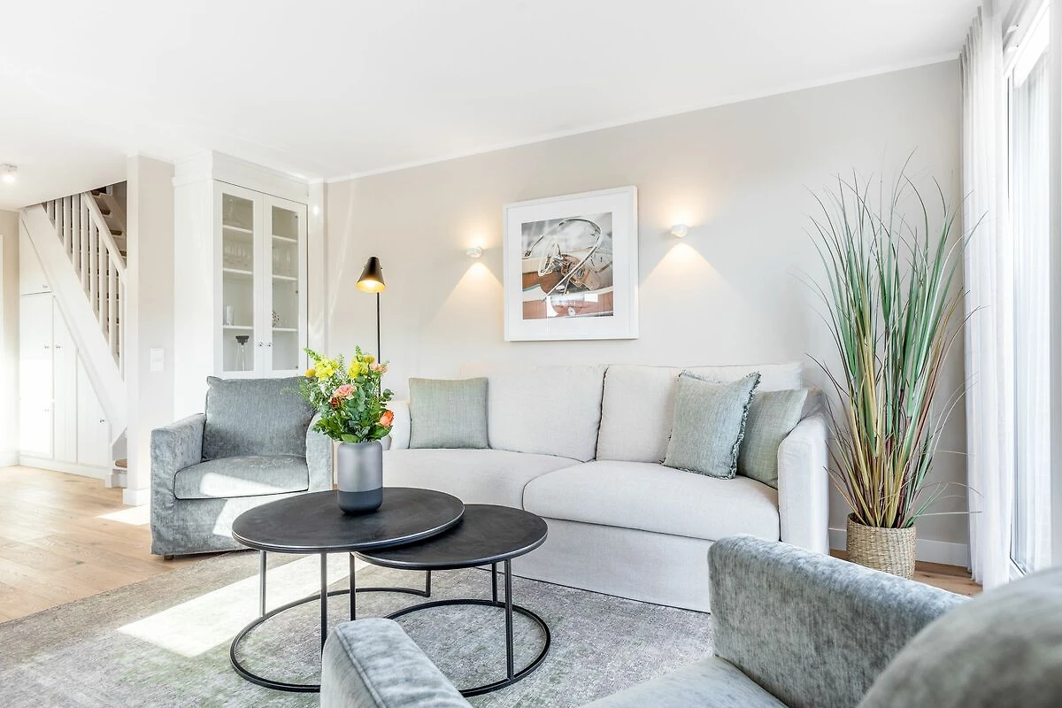 Sandfarbene und türkisblaue Wände sowie ein edler Holzfußboden rahmen das farblich darauf abgestimmte Interieur ein. Ein Zitat an Strand und Meer. Ein Appartement, das zum Entspannen und Wohlfühlen einlädt. Zeitlos, elegant und gemütlich.