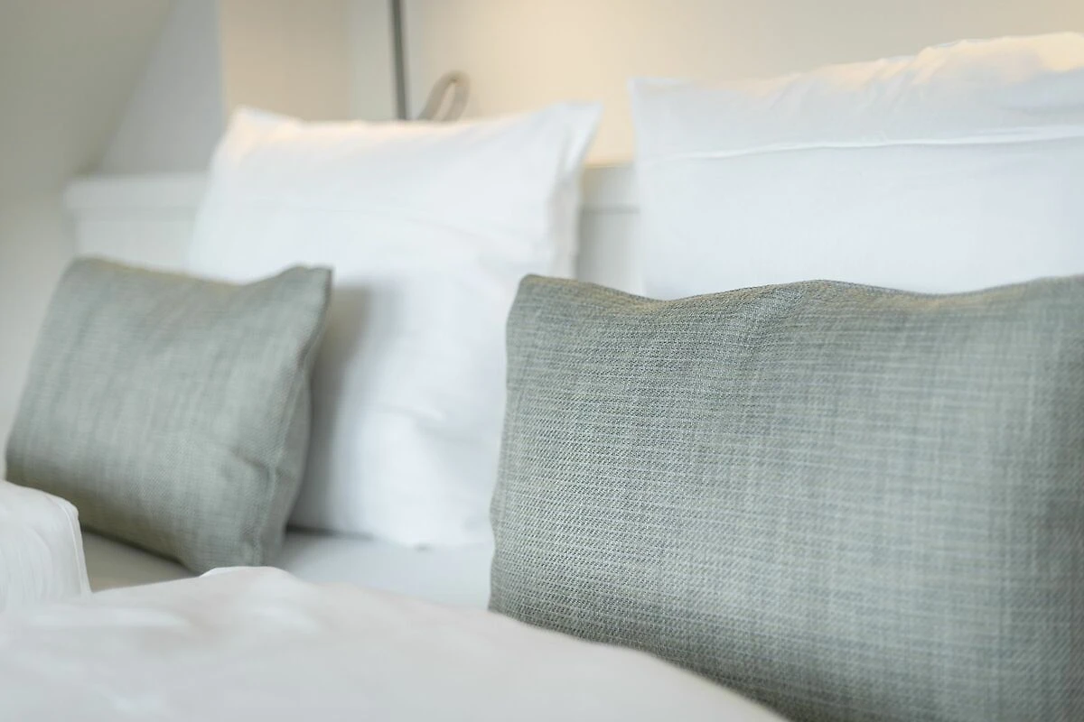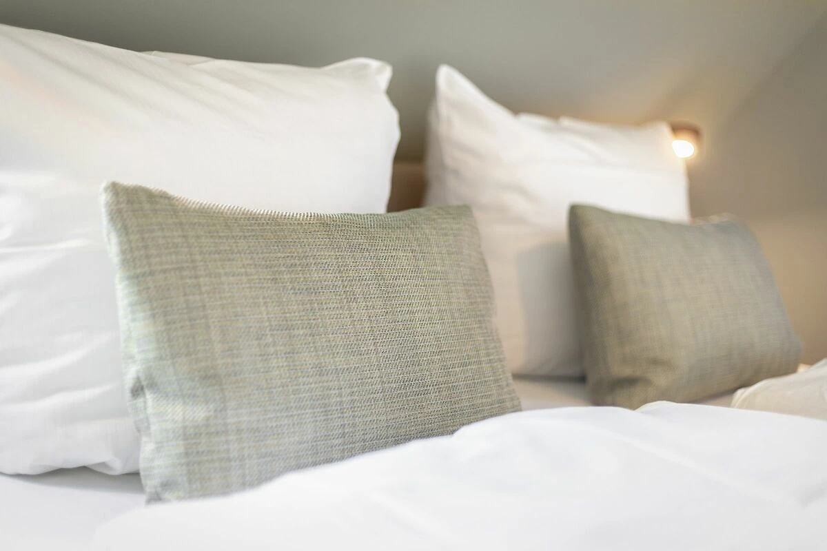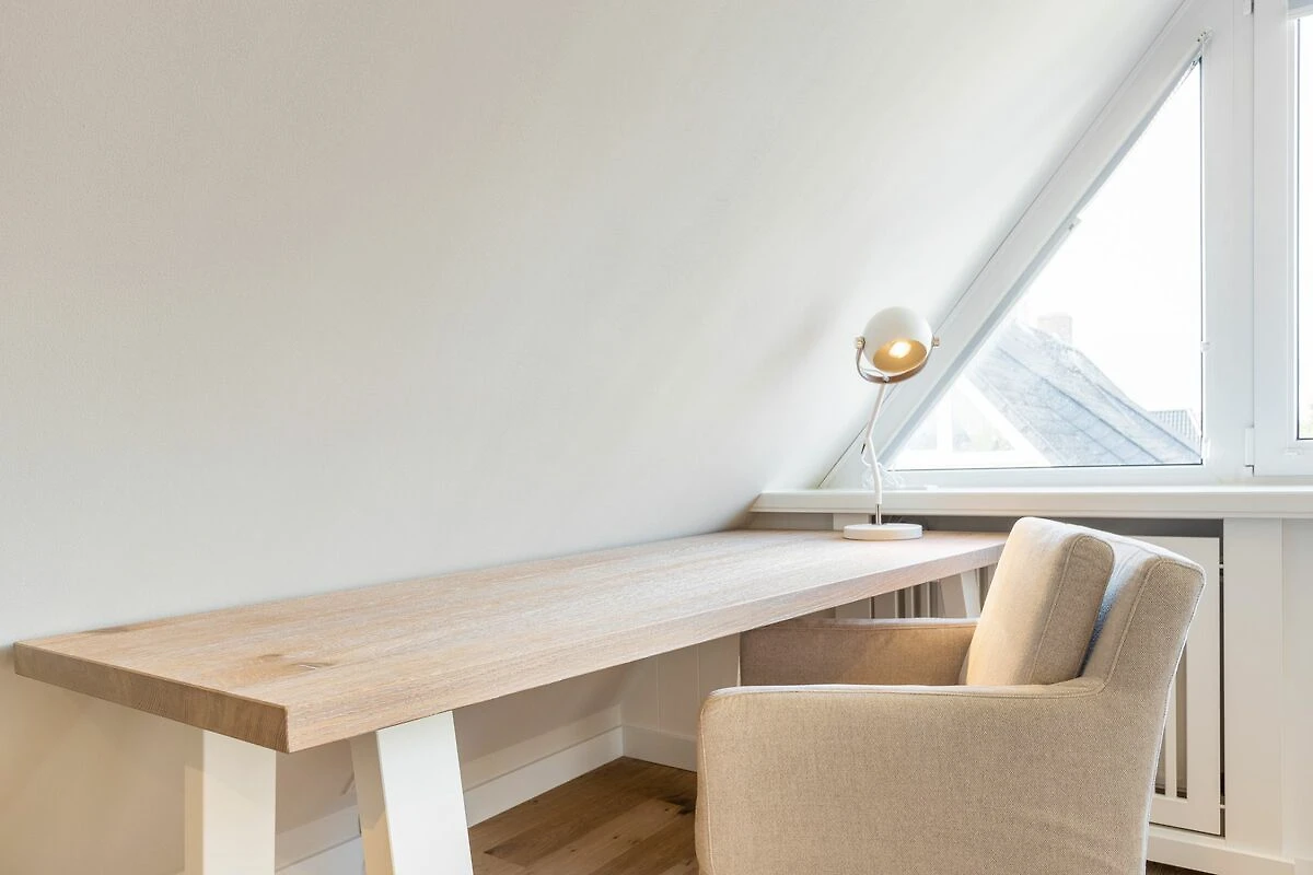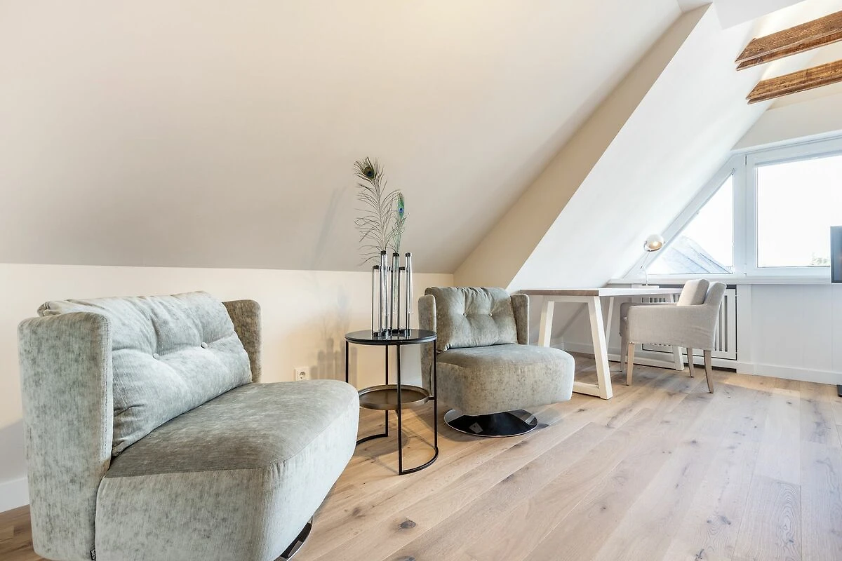 Eine Treppe höher, im Dachgeschoss fängt schon der Himmel an: so viel Licht und Wohlfühl-Atmosphäre! Dazu noch das Bett, das sich gemütlich in eine Nische kuschelt, eine kleine Sitzecke sowie ein Schreibtisch. Ensuite befindet sich ein weiteres Bad mit einer großen Dusche.