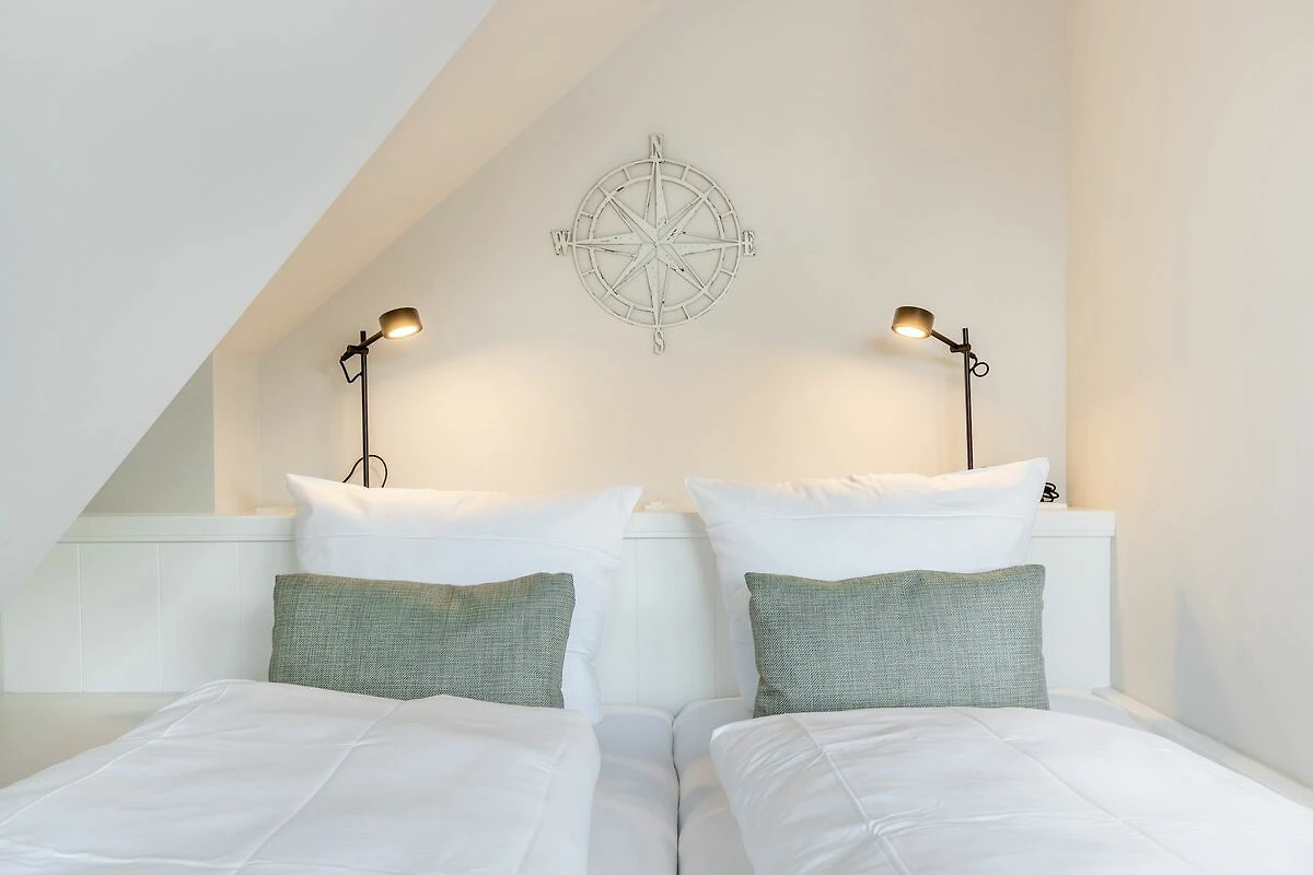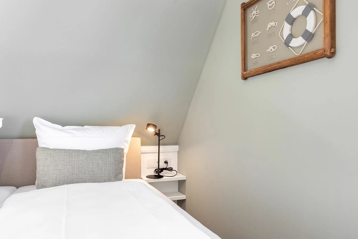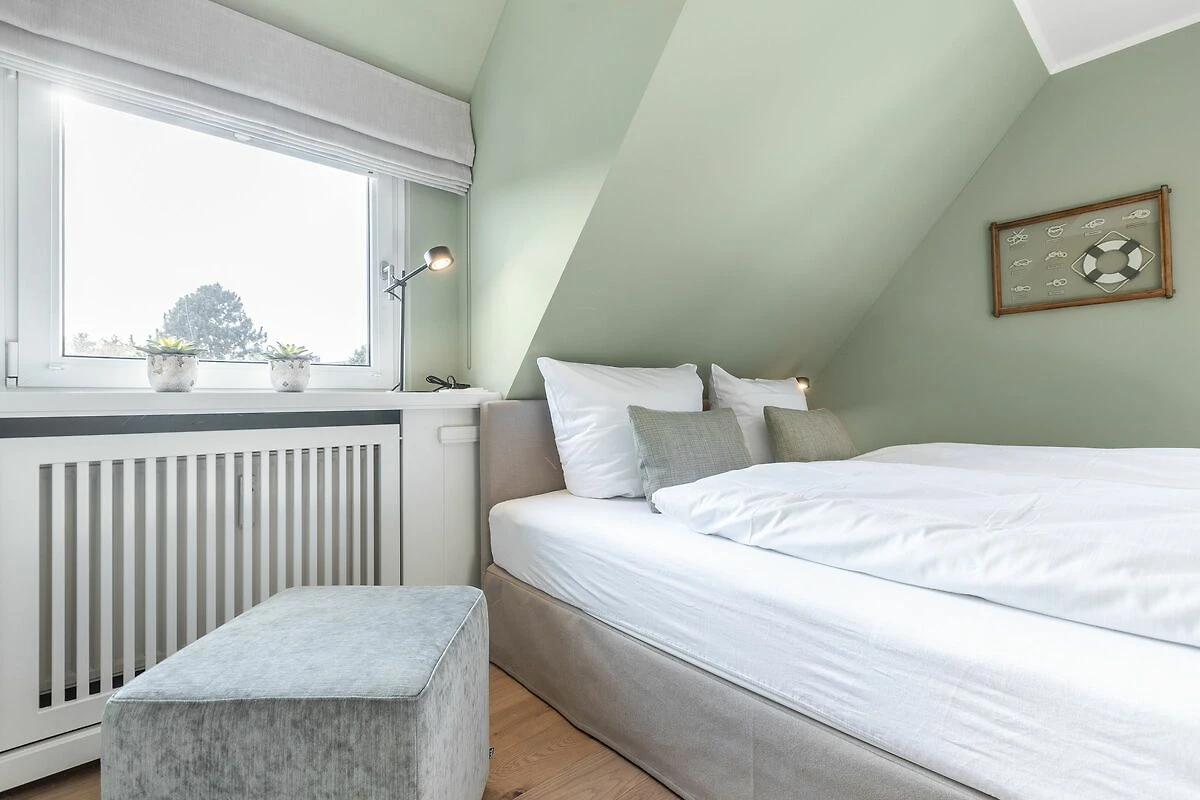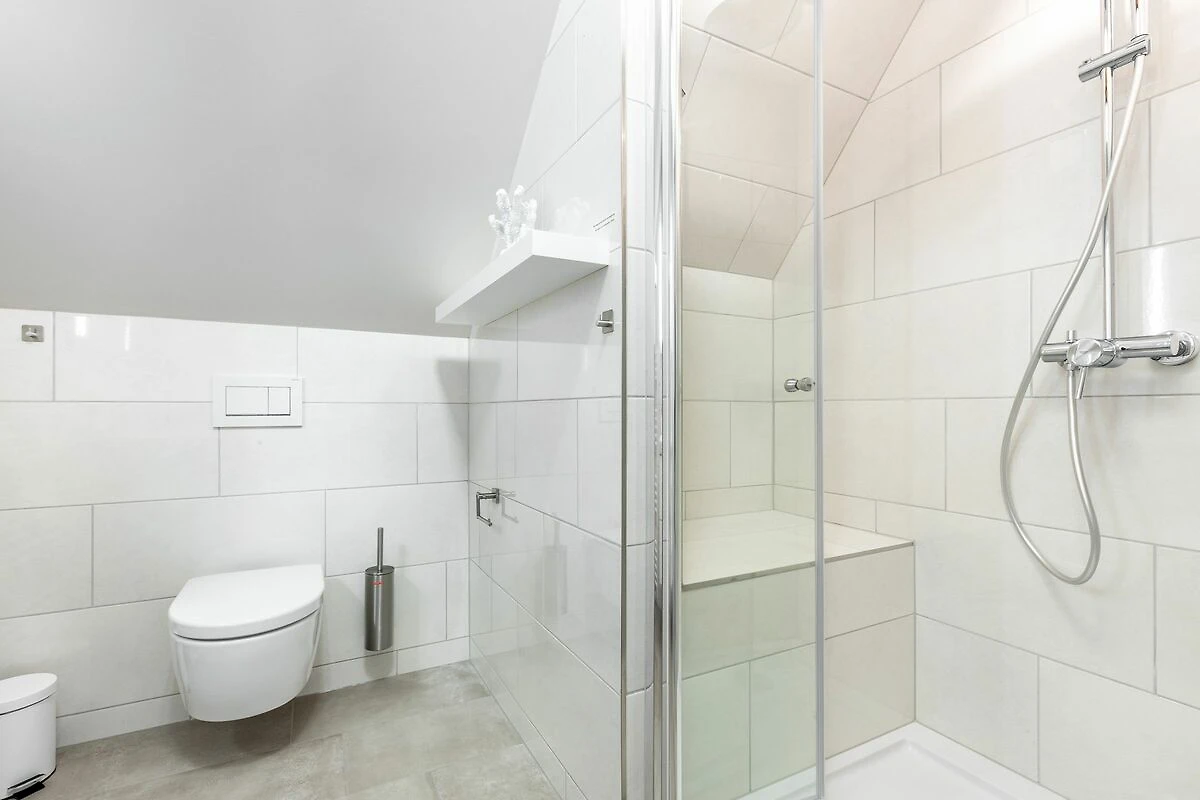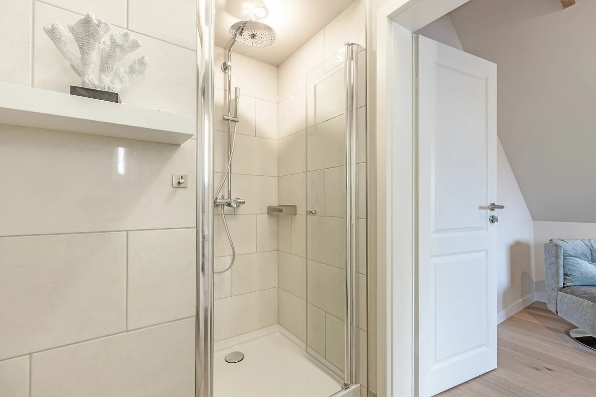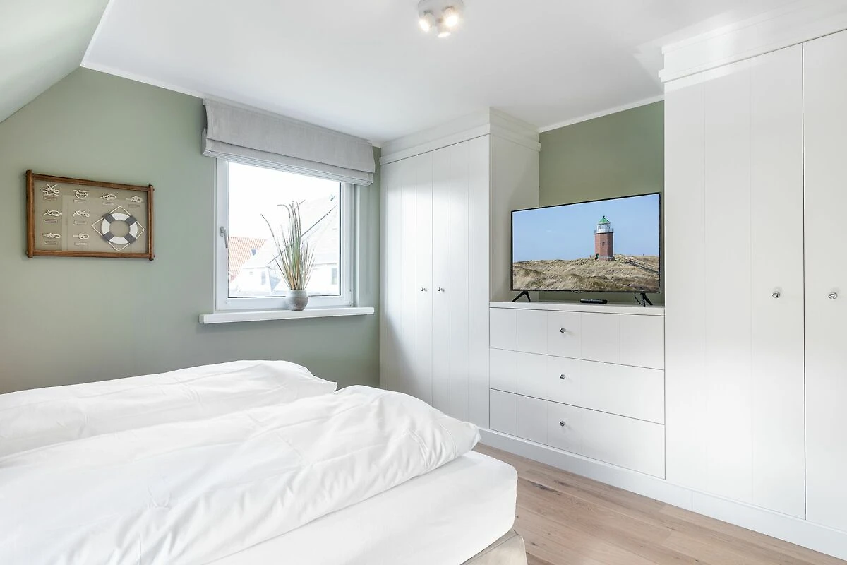 Ebenfalls im Obergeschoss befindet sich auch eins der insgesamt zwei Schlafzimmer mit komfortablen Polsterbett sowie hochwertigen Einbauschränken für die Urlaubsgarderobe. Gleich nebenan dann das ganz in Weiß gehaltene Duschbad für den perfekten Start in den Tag.