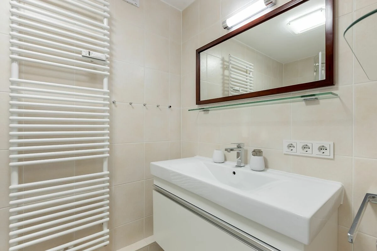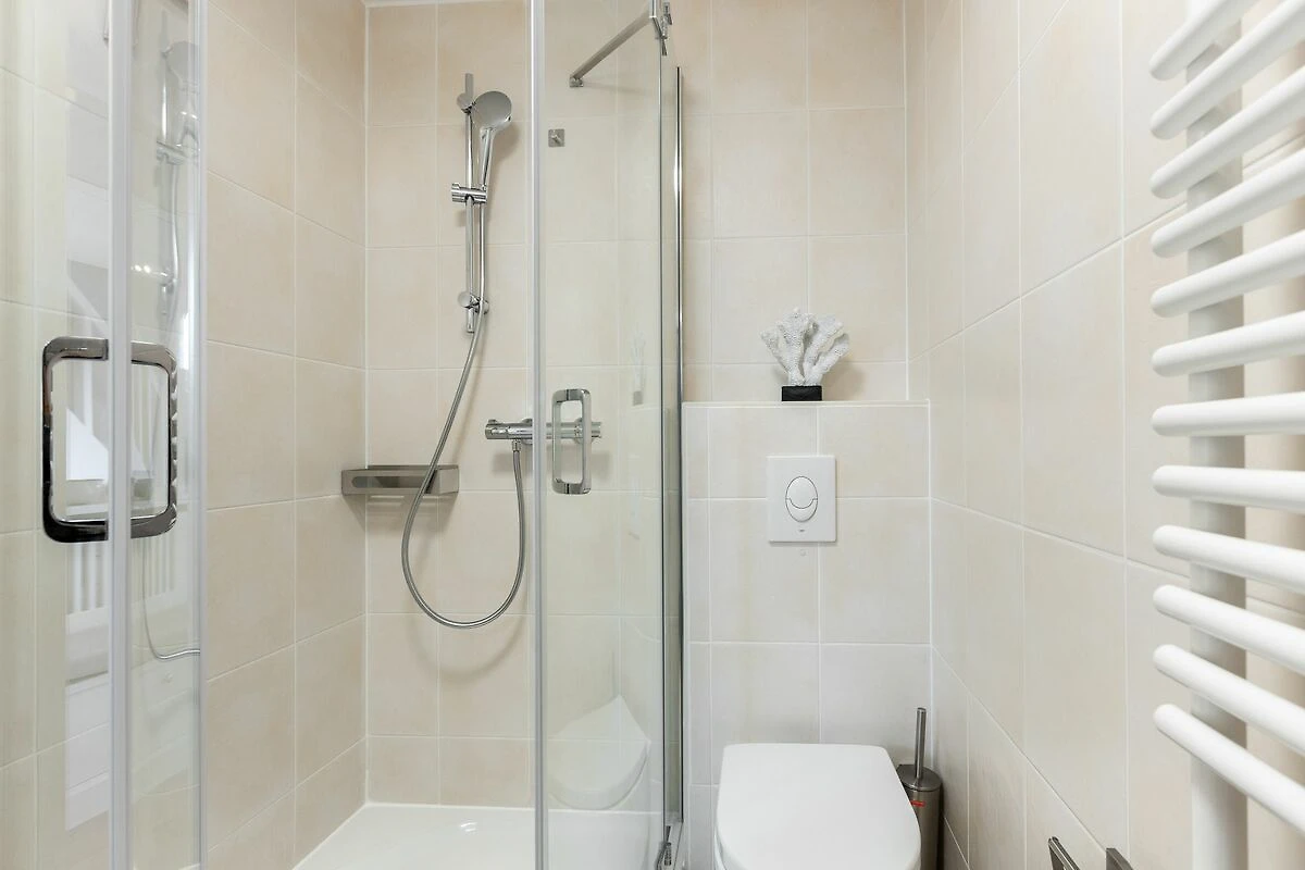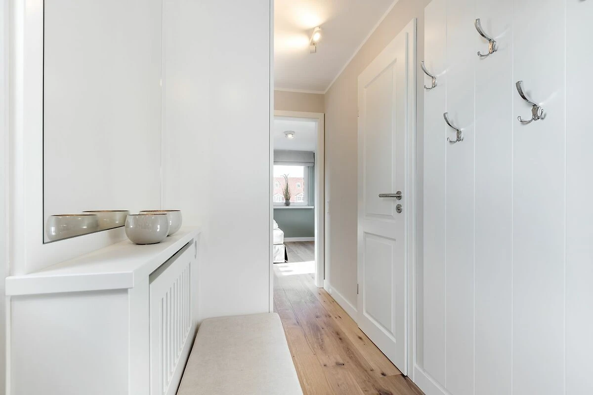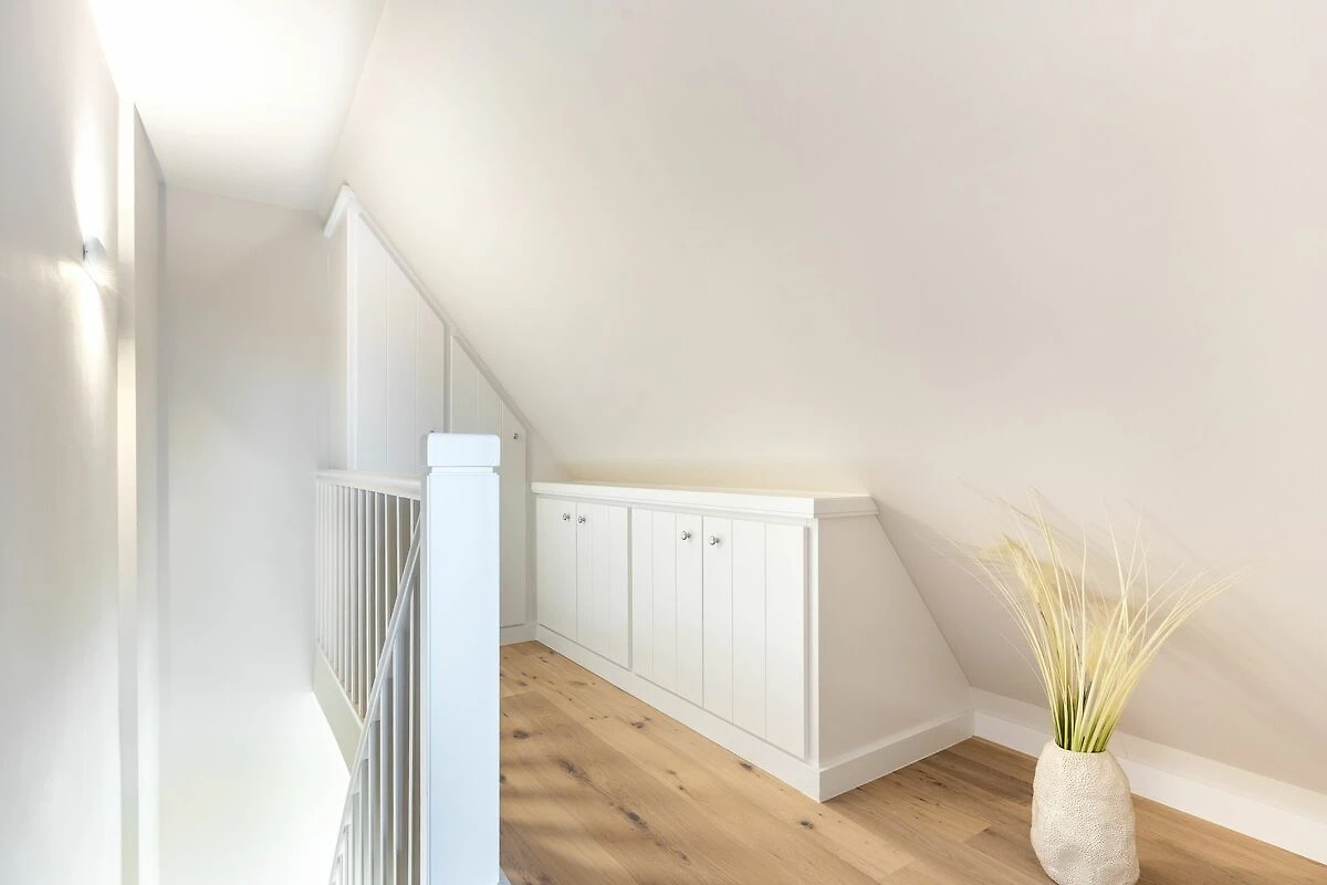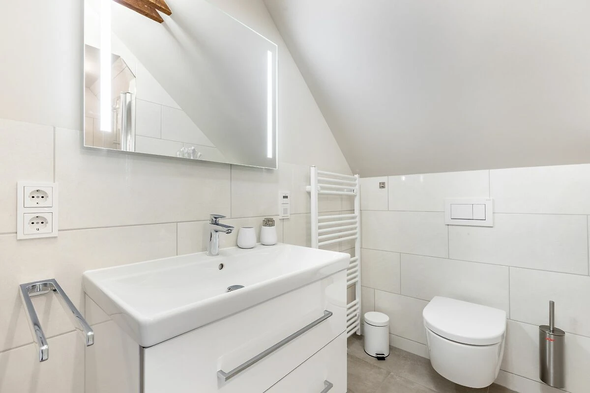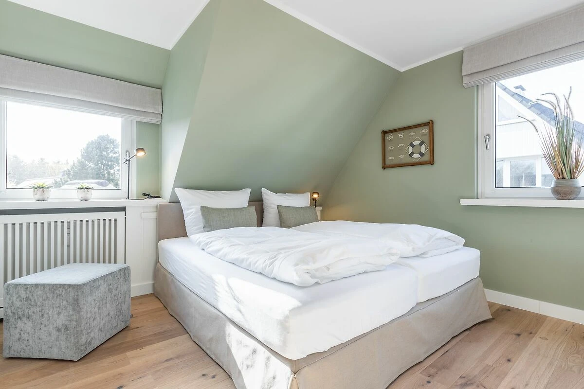 Ebenfalls im Obergeschoss befindet sich auch eins der insgesamt zwei Schlafzimmer mit komfortablen Polsterbett sowie hochwertigen Einbauschränken für die Urlaubsgarderobe. Gleich nebenan dann das ganz in Weiß gehaltene Duschbad für den perfekten Start in den Tag.