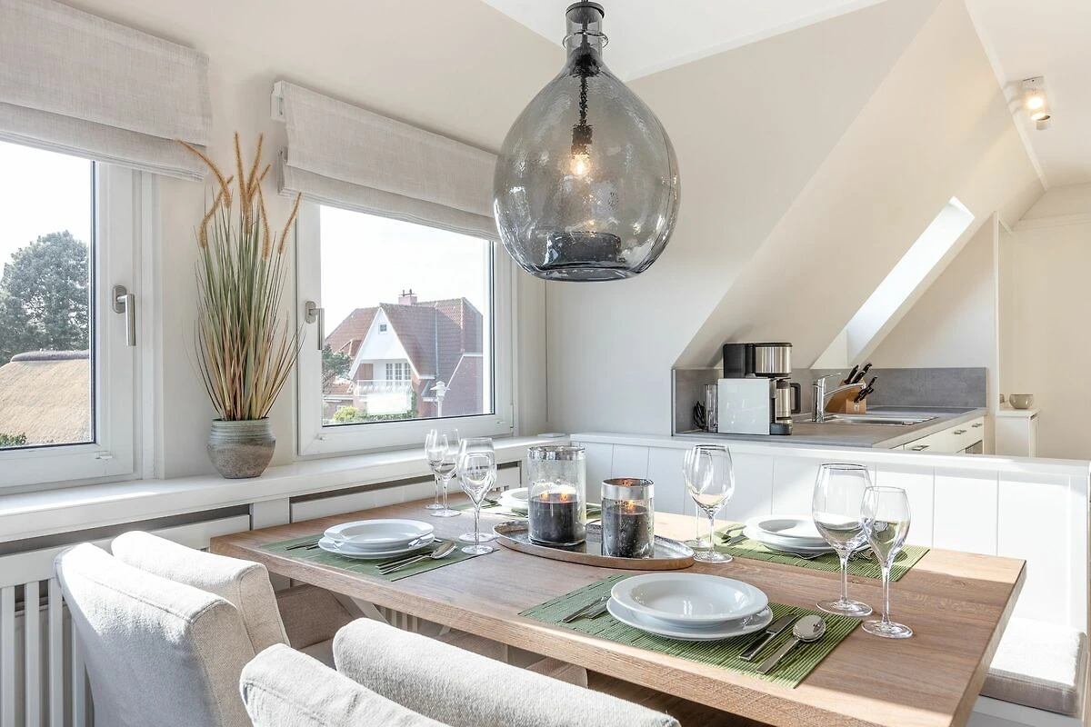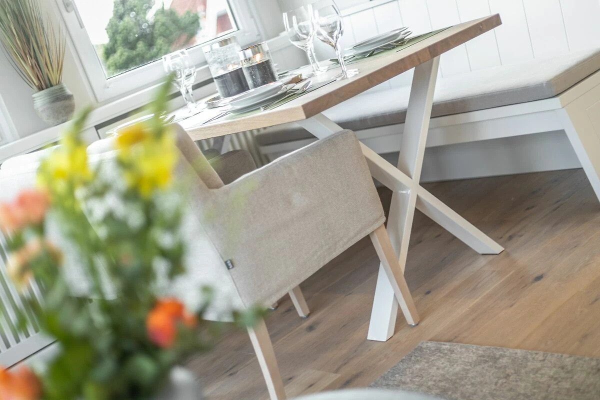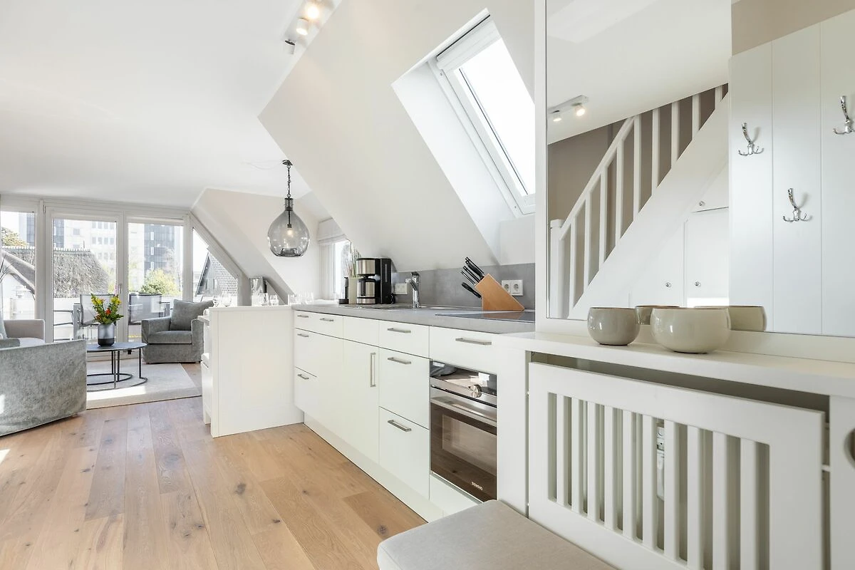 Kochen, essen, wohnen, Beisammensein: Im offenen Wohnbereich des ersten Obergeschoss gehen verschiedene Lebenswelten fließend ineinander über und vereinen sich zu einem harmonischen Ganzen. Eine cosy Sitzecke, dazu der große Esstisch und die offene Küche, die für alle Küchenschlachten ausgestattet ist. Unverzichtbar bei schönem Wetter ist auch der kleine Balkon (Südlage), die zum draußen frühstücken einlädt.