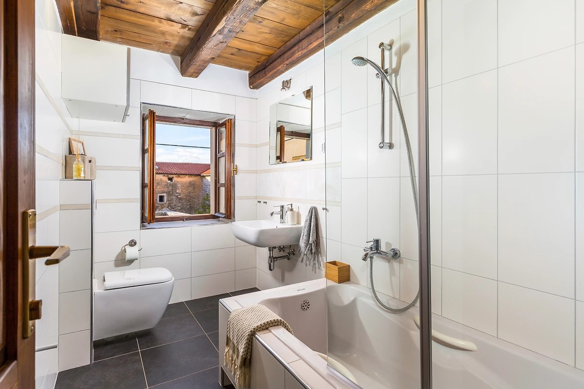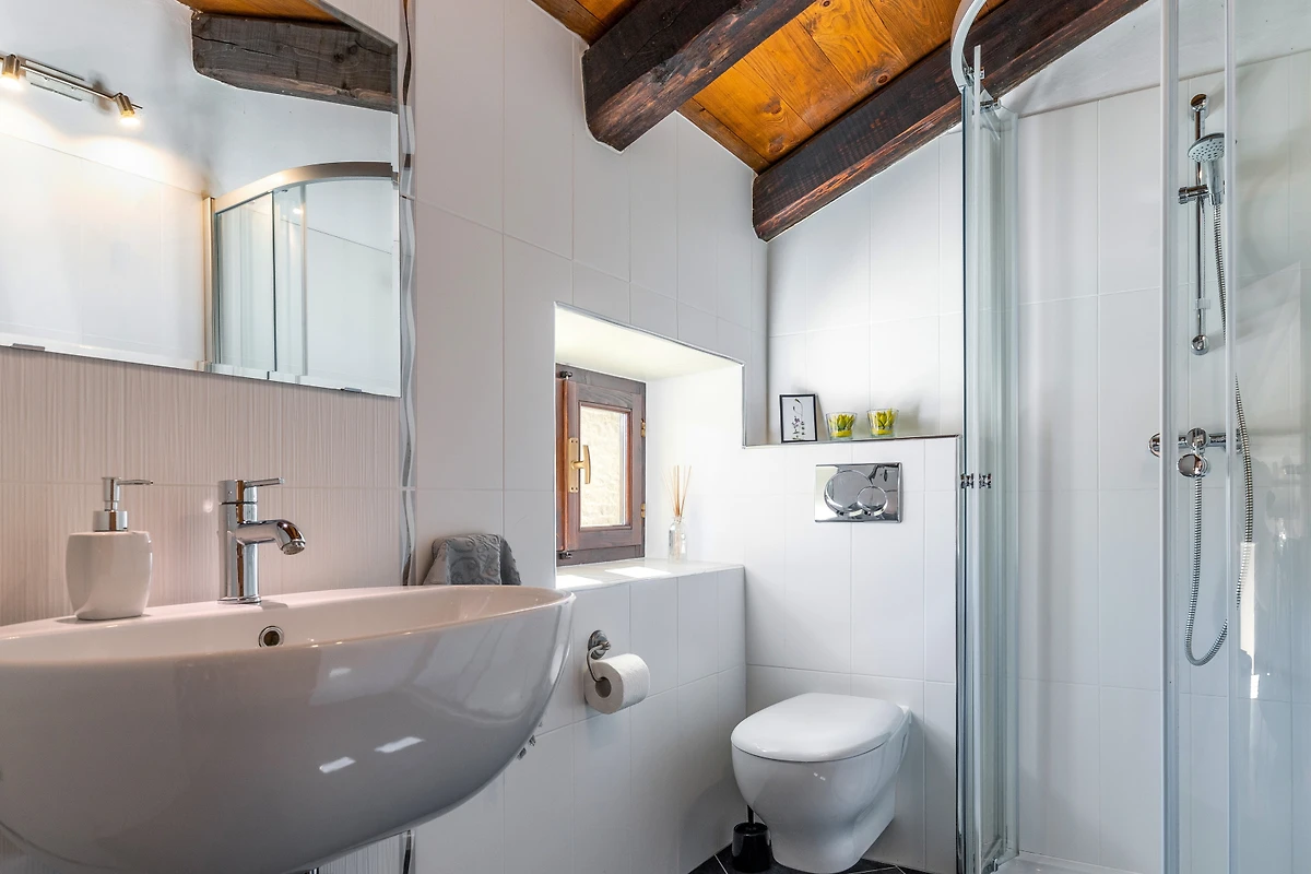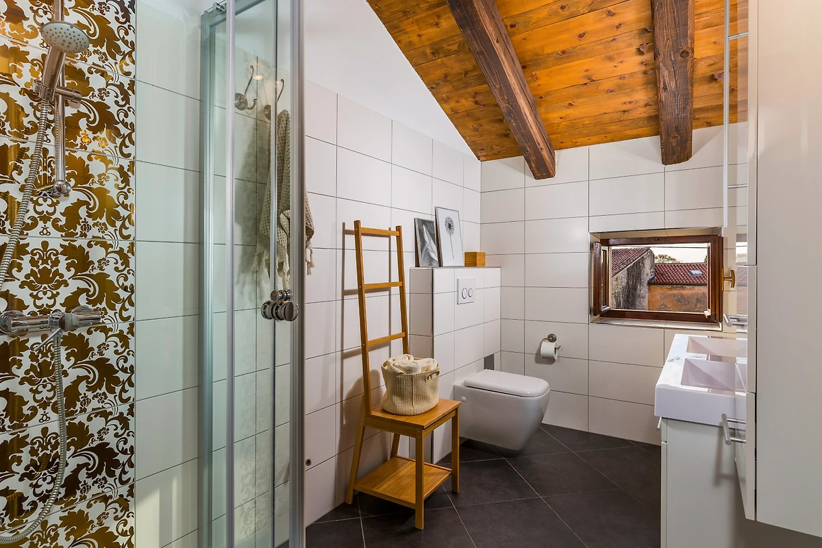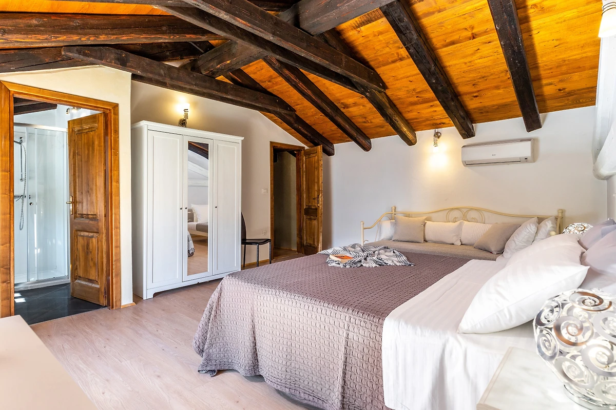 Das Innere der Villa hat eine Fläche von 320 m2 und erstreckt sich über 3 Etagen. Im Erdgeschoss befindet sich ein Wohn- und Essbereich, der aus einem Wohnzimmer, einer Küche und einem Esszimmer besteht. In der Küche finden Sie fast alles, was Sie zur Zubereitung von Mahlzeiten benötigen, darunter 2 Kaffeemaschinen und eine Spülmaschine. Am Esstisch, der Platz für 14 Personen bietet, können Sie Ihre zubereiteten Mahlzeiten geniessen. Wenn Sie sich entspannen möchten, gehen Sie ins Wohnzimmer, wo Sie ein Sofa für 8 Personen und einen Sessel vorfinden - ein idealer Ort, um Filme zu schauen oder Brettspiele zu spielen. Im Erdgeschoss, wie auch in der gesamten Villa, herrscht ein rustikaler Einrichtungsstil vor, bei dem Elemente aus Stein und Holz im Vordergrund stehen. Offene Deckenbalken bringen Wärme in den Raum, was sicherlich dazu beiträgt, dass Sie sich in dieser Villa wie zu Hause fühlen werden.
