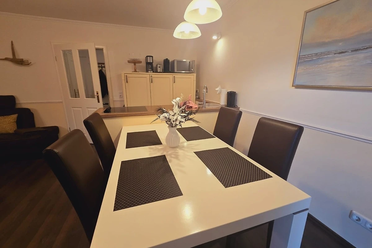 Auf der Nordseite und direkt am Wohn und Essbereich befindet sich ein geräumiger Balkon mit Blick Richtung Ostsee. Hier stehen Ihnen natürlich auch ein Tisch und Stühle zur Verfügung für ein schönes Frühstück im freien.