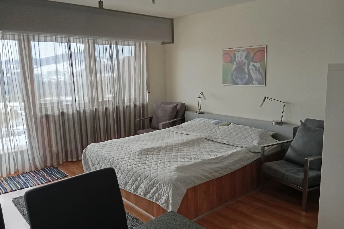 Wohn/Schlafraum: Esstisch mit 4 Stühlen, Doppelbett (2,0 x 1,8 m), 2 bequeme Sessel, grosser Flachbildfernseher mit SAT – Programmen (Astra)