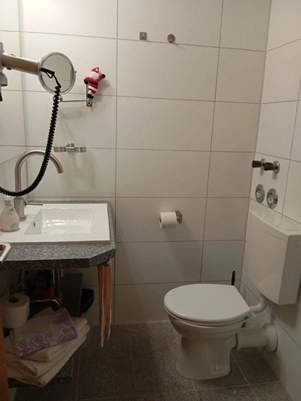 Bad: Halbrunddusche mit Schiebetüren, Toilette, Waschbecken mit grossem Spiegel, Kosmetikspiegel und Haartrockner.