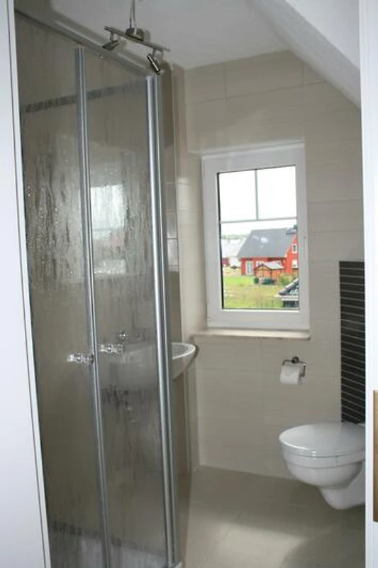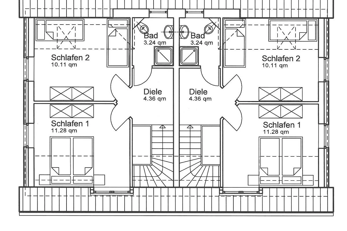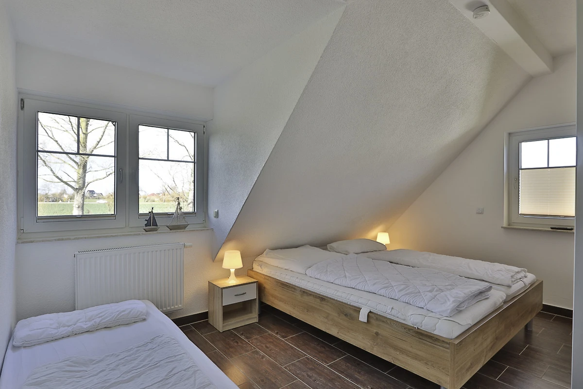 Zwei Schlafzimmer mit komfortablen Doppelbetten und je einem Einzelbett befinden sich im Obergeschoss sowie ein Duschbad, ein weiteres Duschbad mit Waschmaschine gibt es im Erdgeschoss. In den Schlafräumen befinden sich zusätzliche Fernseher.