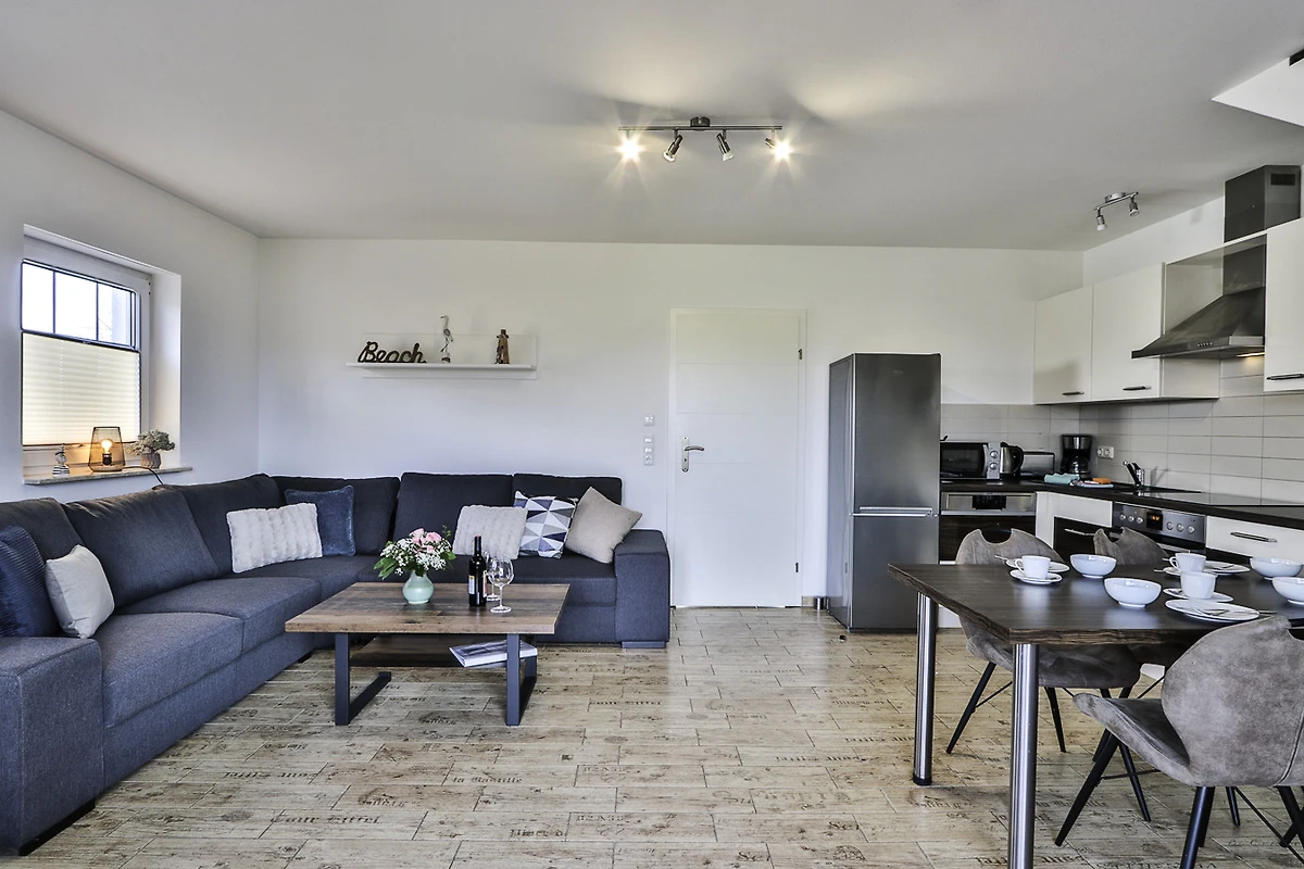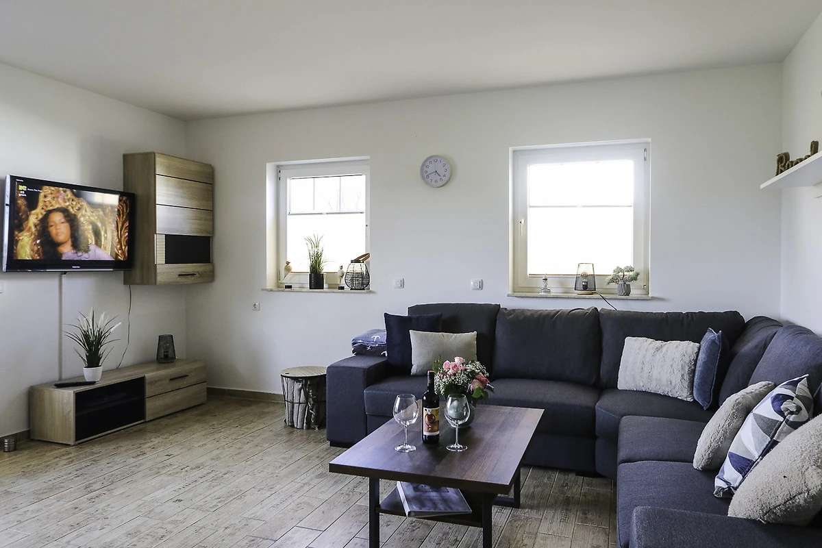 Das Ferienhaus bietet ein modernes und maritimes Ambiente. Im grosszügigen Wohnzimmer finden Sie eine gemütliche Sitzecke mit Fernseher, DVD und Radio vor. Die Küche ist mit Geschirrspüler, Herd und Mikrowelle ausgestattet sowie einem Essplatz. Alle Fenster sind mit elektrischen Rollläden versehen.