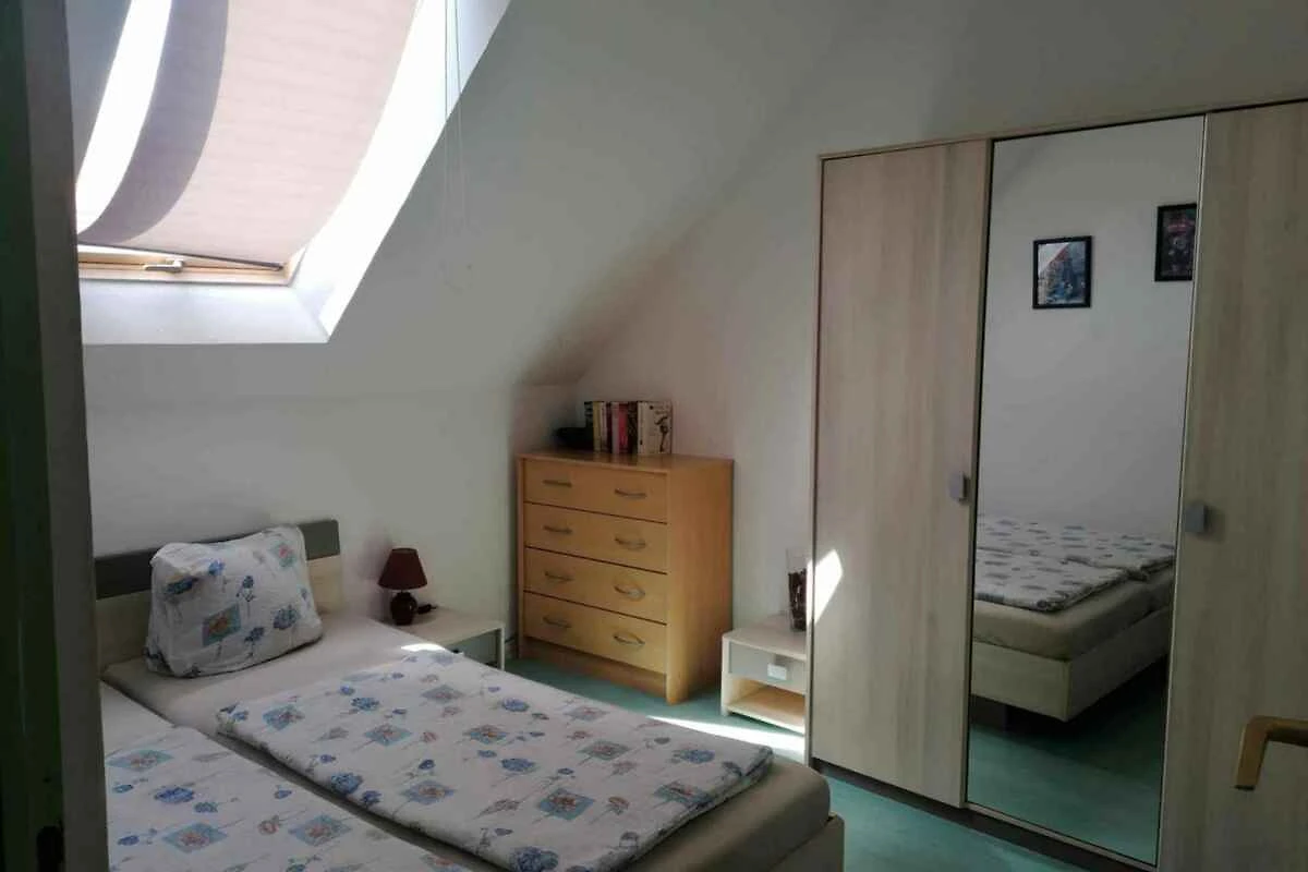 Dachgeschoss: 2 Schlafzimmer jeweils mit 1 Doppelbett. Schlafzimmer mit 1 Doppelbett. Bad mit Dusche, 1 Waschbecken, WC und Fenster.