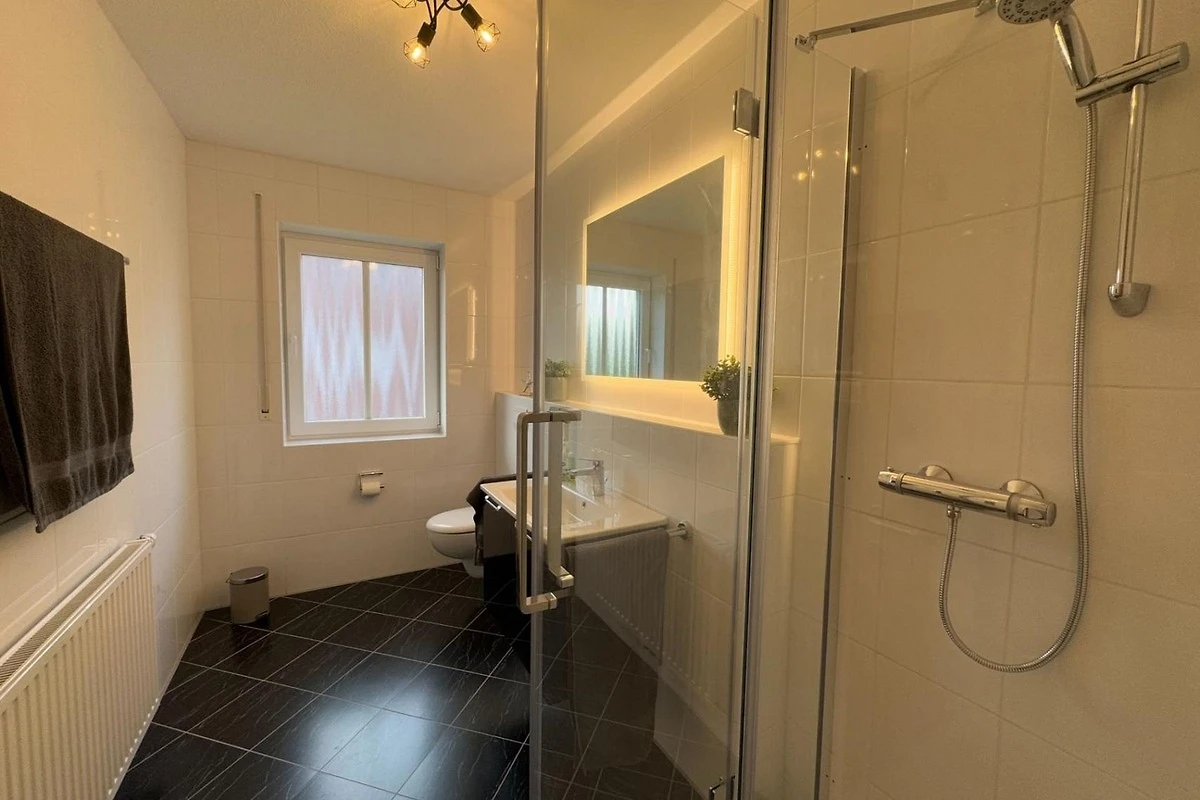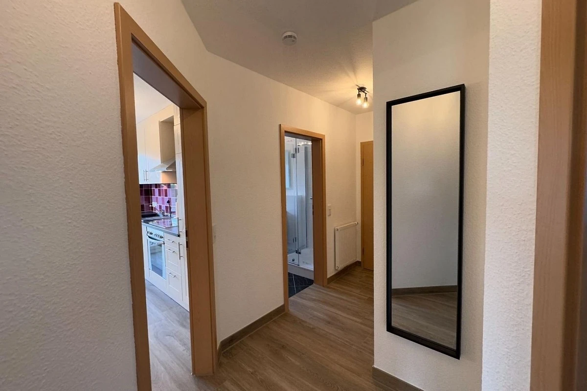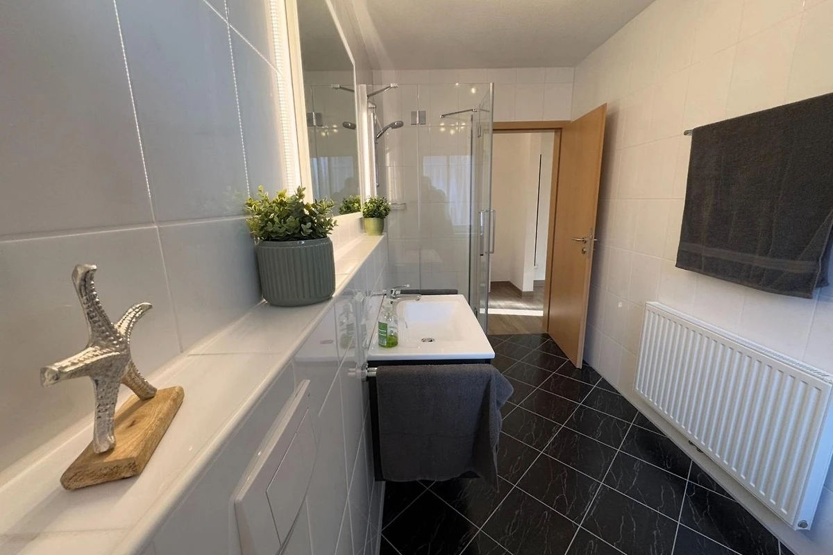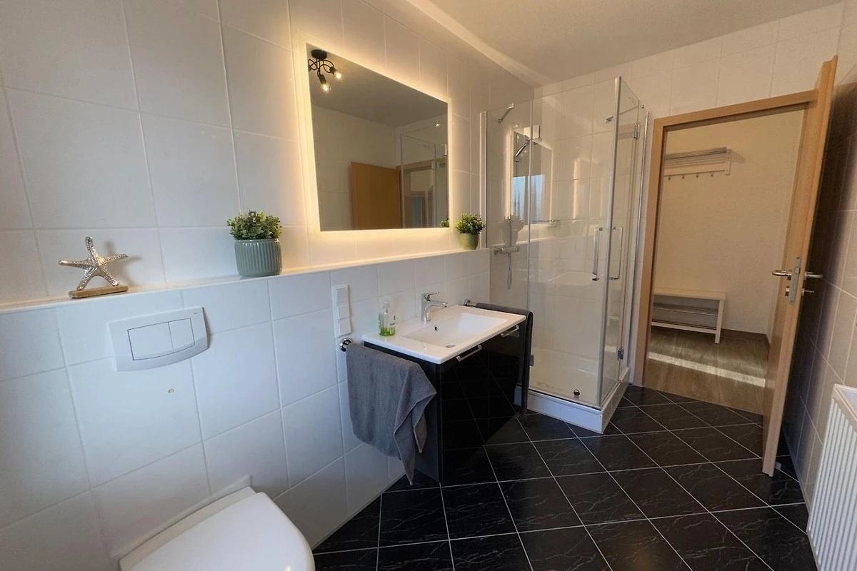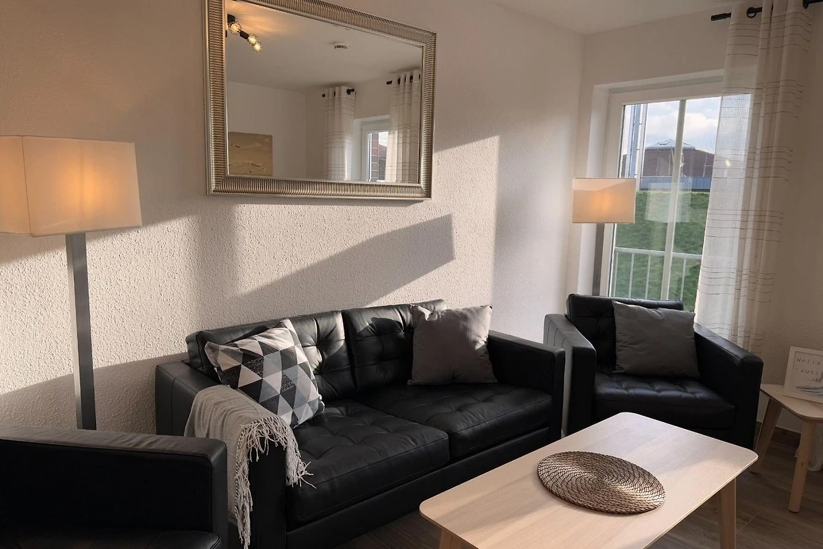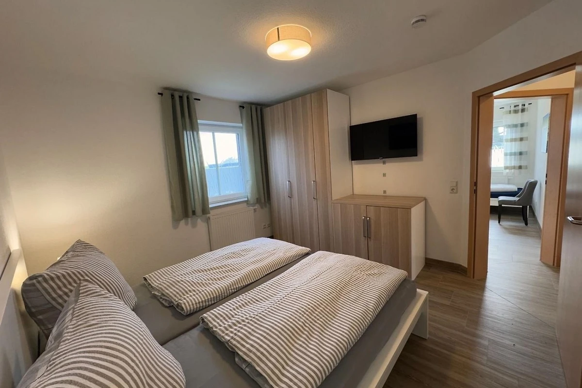 Ein grosszügiger Flur, ein Tageslichtbad mit Dusche und Föhn, zwei Schlafzimmer (das erste ausgestattet mit Doppelbett, Kleiderschrank und Fernseher, das zweite mit zwei Einzelbetten und Kleiderschrank), sowie ein grosser offener Raum mit Küche, Essplatz für 4 Personen und einem Wohnbereich mit Fernseher, DVD-Player und Gesellschaftsspielen lassen keine Wünsche offen.Es stehen Ihnen Internet und Kabelfernsehen zur Verfügung.Die Wohnung ist durch die vielen vorhandenen Fenster schön hell, die Sonne lässt sich bei Bedarf jedoch auch durch die vorhandenen Jalousien jederzeit aussperren.Für die kleinsten Gäste sind ein Kinderreisebett und ein Hochstuhl vorhanden.Die Küche ist komfortabel ausgestattet und beinhaltet u.a. eine grosse Kühl-/Gefrierkombination, ein Herd mit Ceranfeld und Backofen, Mikrowelle, Toaster, Kaffeemaschine, Wasserkocher, Geschirrspülmaschine und noch vieles mehr, was man für die Zubereitung des Frühstücks oder Mittagessens benötigt.Die Sonne kann man auf dem grosszügigen nach Süd-Westen ausgerichteten Balkon geniessen, der mit Tisch und 4 Stühlen ausgestattet ist.Die Waschmaschine, Staubsauger, Bügeleisen und Bügelbrett sind in einem separaten Abstellraum untergebracht.Ein eigener PKW- Stellplatz und Fahrradabstellraum (abschliessbar) befinden sich direkt am Haus.