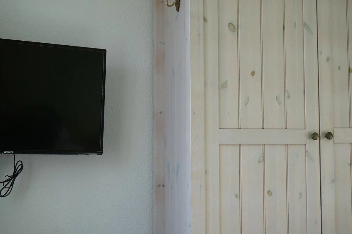 Das Schlafzimmer verfügt über einen Fernseher, einen Kleiderschrank für mitgebrachte Kleidung und ein grosses Doppelbett.