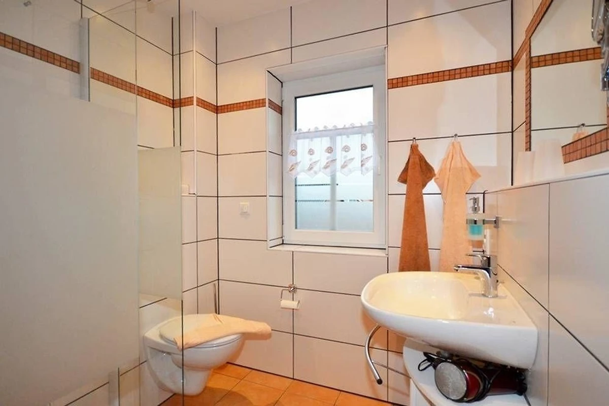 Einen guten Start in den Tag beginnen Sie im freundlichen Badezimmer mit bodengleicher Dusche, Waschbecken mit Spiegel, WC, Handtuchwärmer, Föhn und Kosmetikspiegel.