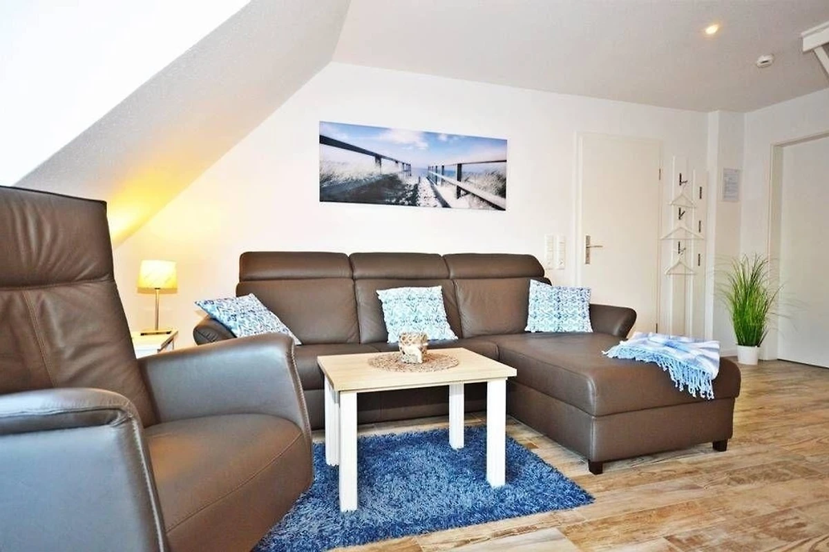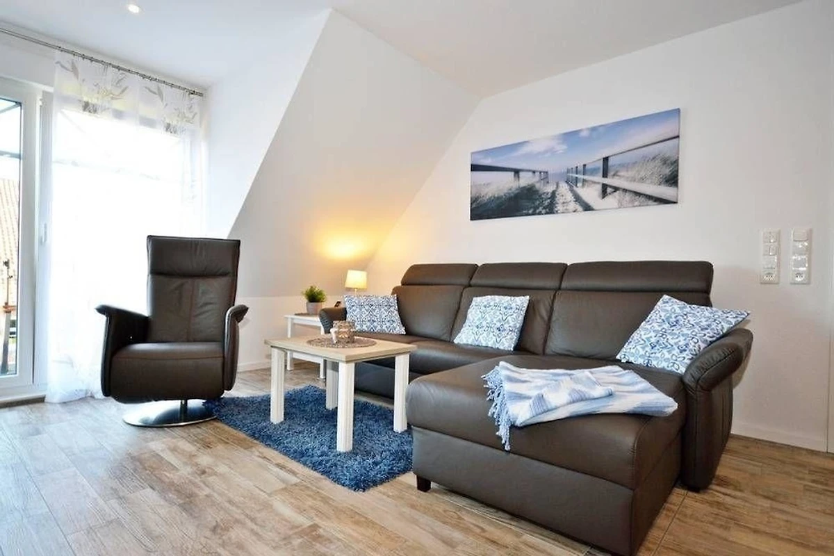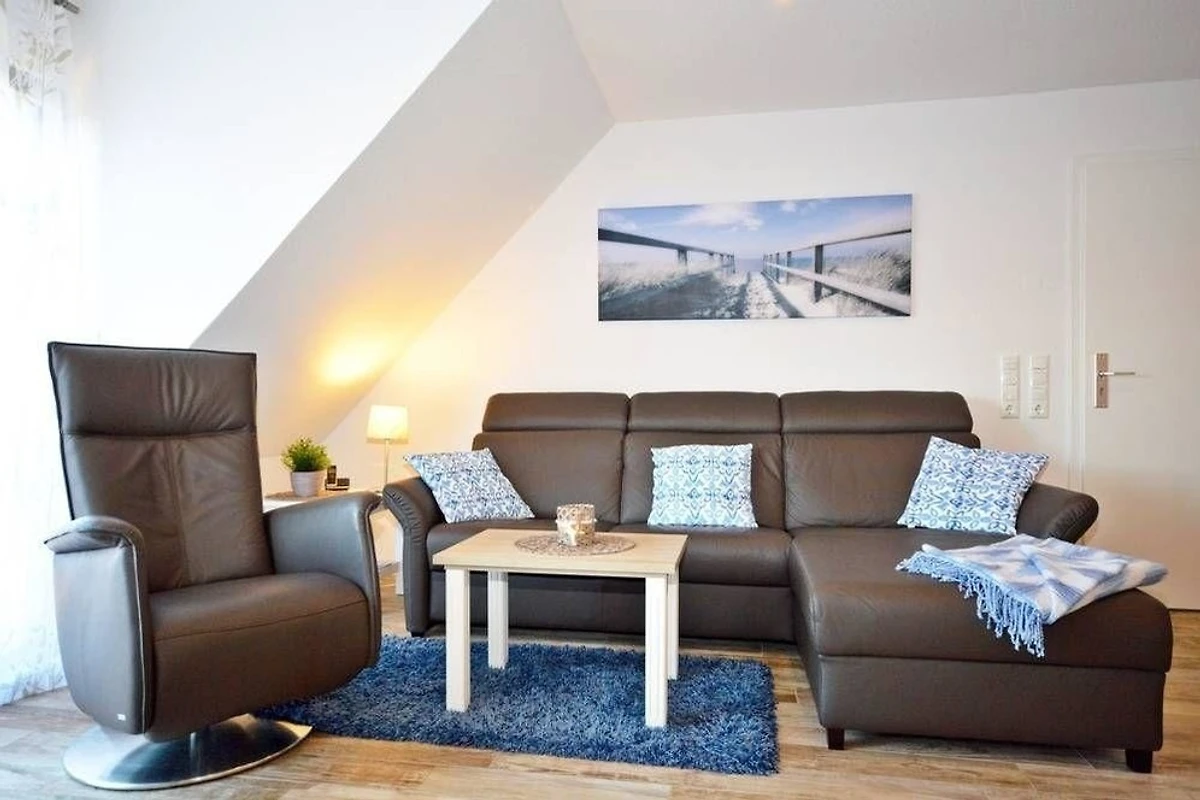 Der behagliche Wohnbereich mit moderner Ledereckcouch, Couchtisch und herrlich bequemen Komfort-Sessel an. Selbstverständlich verfügt die Ferienwohnung über einen grossen 3D-Flachbild-TV, Blue-Ray Player und Mini Stereo Anlage.