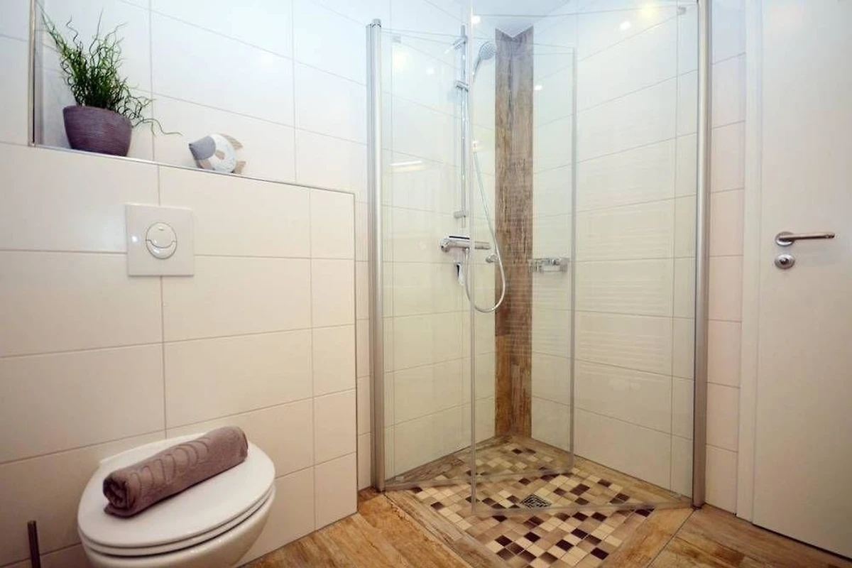 Das harmonisch gestaltete Badezimmer hat eine 1,00 m x 1,00 m grosse ebenerdige Dusche. Handtuchtrockner, Waschtisch mit Spiegel- und Unterschrank. Kosmetikspiegel und Föhn sind ebenfalls vorhanden.