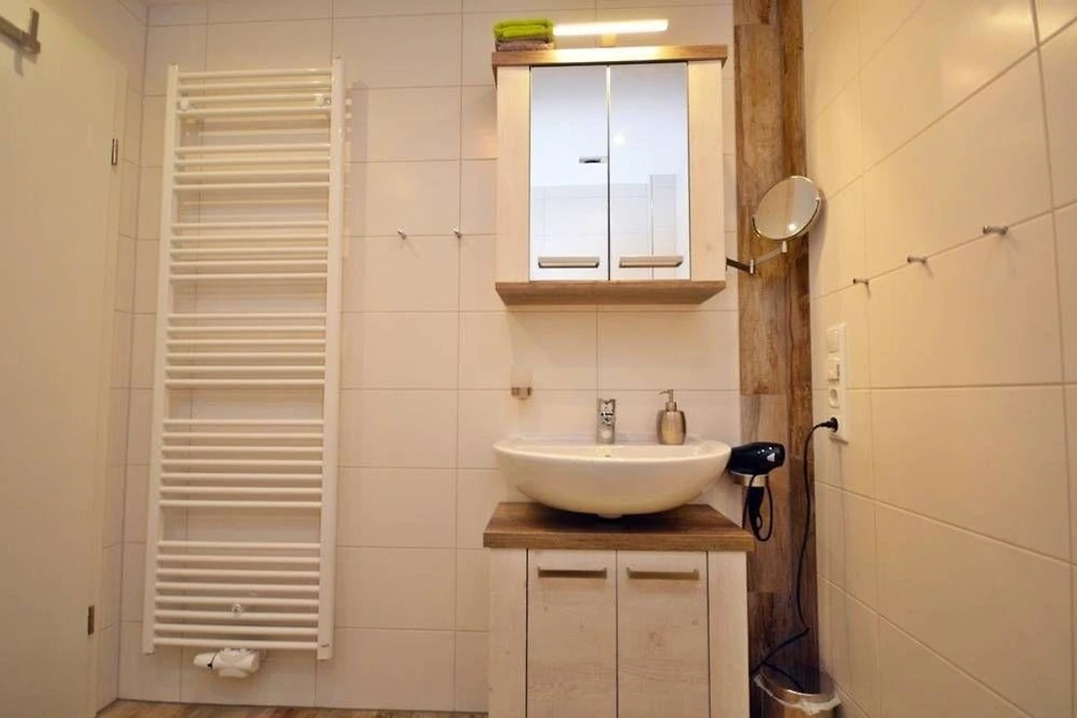Das harmonisch gestaltete Badezimmer hat eine 1m x 1m grosse, ebenerdige Dusche. Handtuchtrockner, Waschtisch mit Spiegel- und Unterschrank,Kosmetikspiegel und Föhn sind ebenfalls vorhanden.