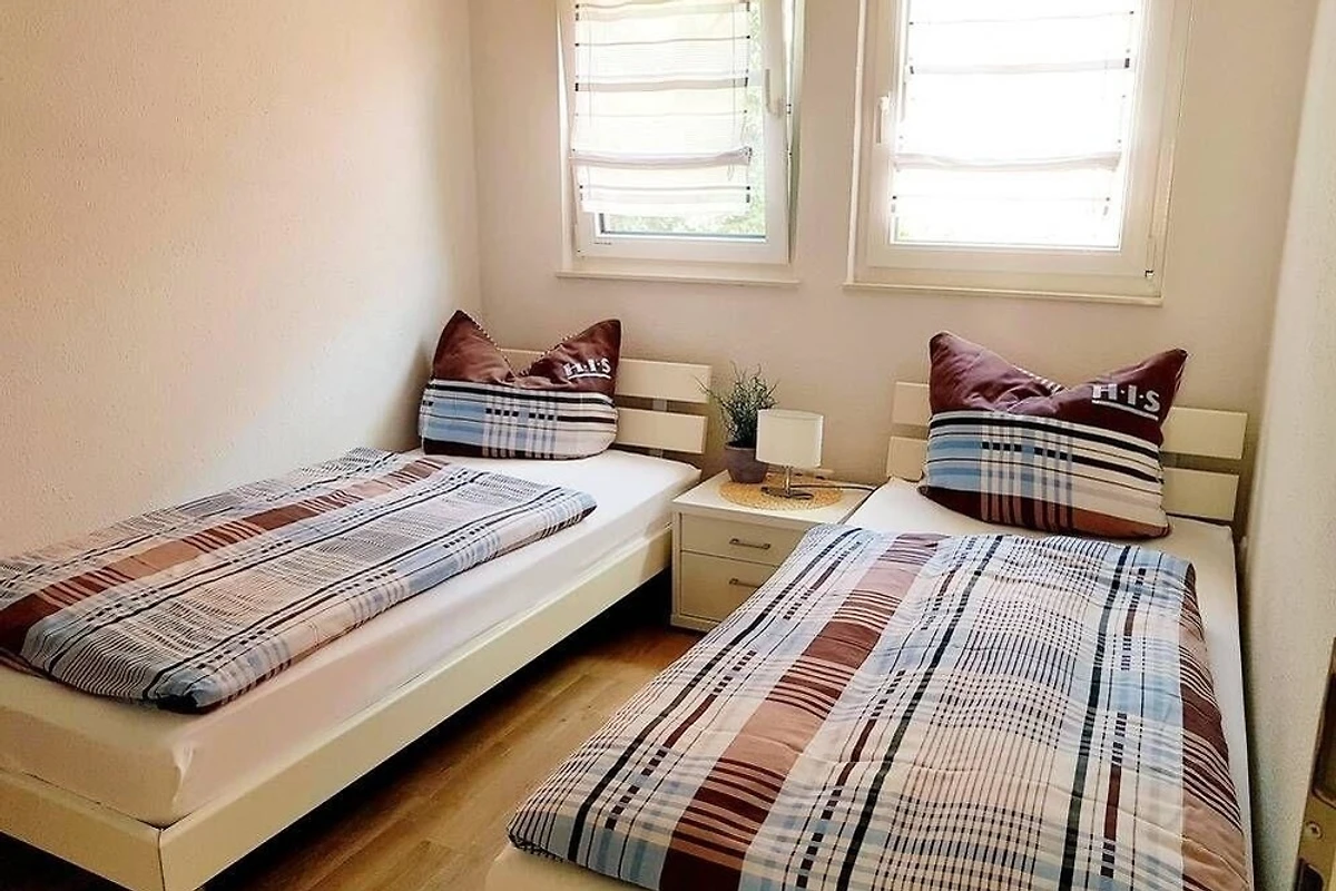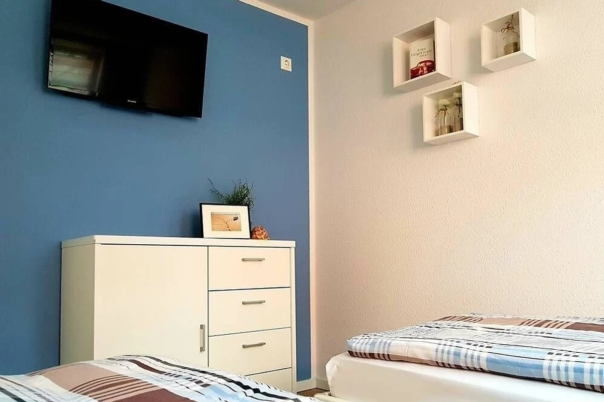 Das eine Schlafzimmer verfügt über ein 1,80 m x 2,00 m grosses Doppelbett mit Qualitätsmatratzen. Zwei Nachtische, ein Kleiderschrank und eine Kommode bieten Ihnen ausreichend Stauraum. Im zweiten Schlafzimmer hingegen befinden sich zwei gemütliche Einzelbetten. Beide Schlafzimmer verfügen über einen modernen Flachbild-Fernseher.