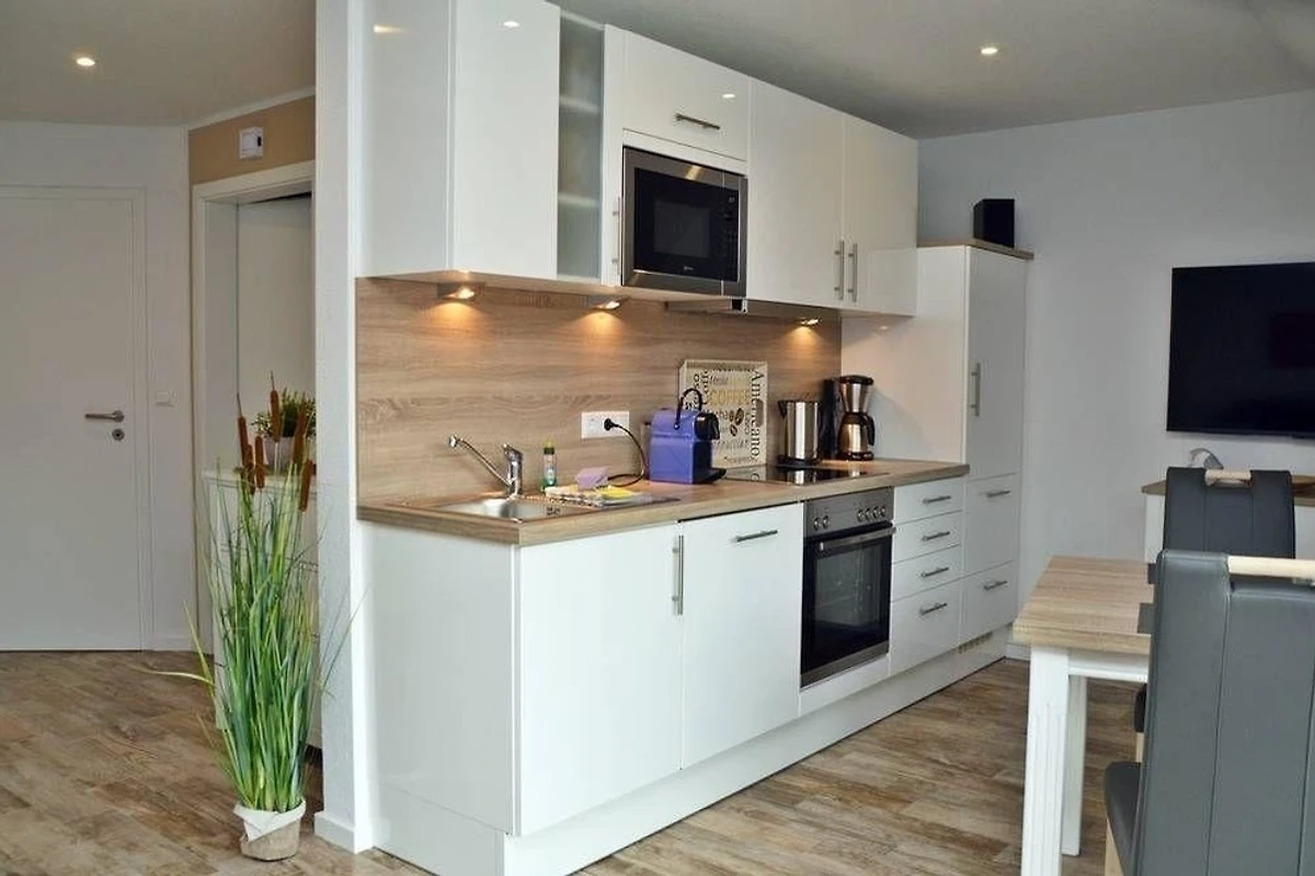 Die sehr gut ausgestattete und moderne Einbauküche lässt keine Wünsche offen und bietet z.B. Spülmaschine, Mikrowelle, Cerankochfeld und Backofen. Eine Nespresso Maschine und eine traditionelle Filterkaffeemaschine sowie Teekanne mit Filter sorgen für exklusiven Kaffee- und Teegenuss. Der Essbereich mit vier Sitzgelegenheiten ist mit einem Kinderhochstuhl für Ihre Kleinsten ergänzbar.