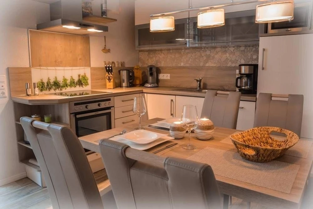 Die Einbauküche lässt in Ausstattung und Grosszügigkeit keine Wünsche offen. Herd mit Ceranfeld, Backofen, Edelstahl-Abzugshaube, Kühlschrank mit Gefrierfach, Mikrowelle, Wasserkocher, Eierkocher, Kaffeemaschine und Senseo, Toaster, Standmixer, Pürierstab etc... auch das umfangreiche Zubehör wie Geschirr, Töpfe und Besteck lässt keine Wünsche offen. Eine Grundausstattung an Gewürzen, Spülmaschinen-Tabs, etc. ist vorhanden.