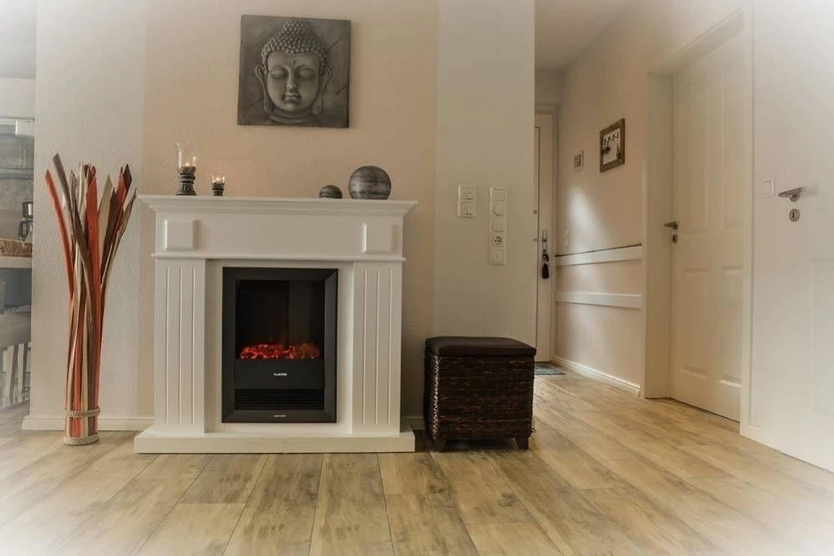 Dem Eingangsbereich mit Nischengarderobe schliesst sich der grosse helle Wohnbereich an. Eine gemütliche Sofa-Ecke mit Couchtisch, einen grossem Flachbildschirm-TV, Blue-Ray-Player und Hifi-Anlage laden zum Verweilen ein. Ein zusätzlicher Blickfang ist der Elektro-Kamin.