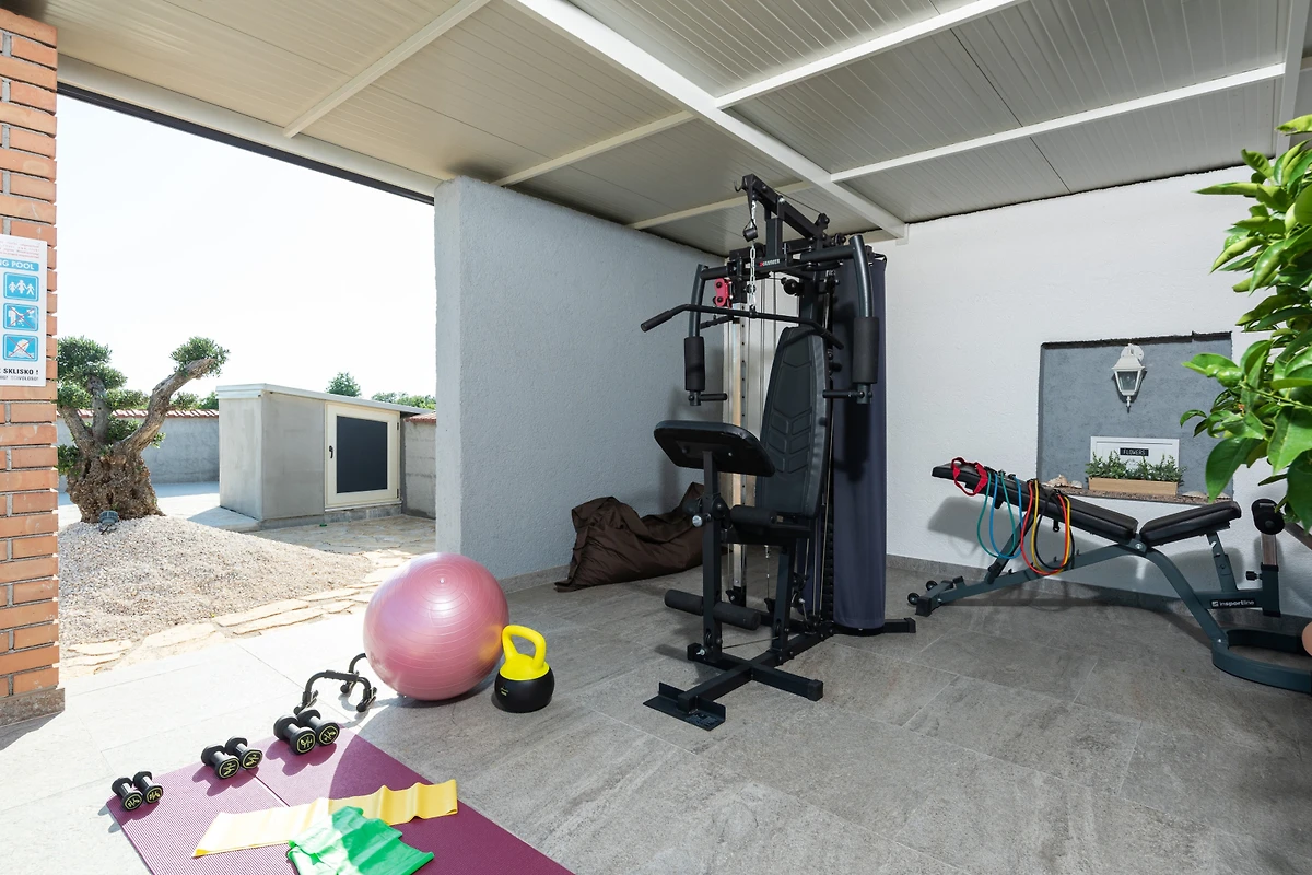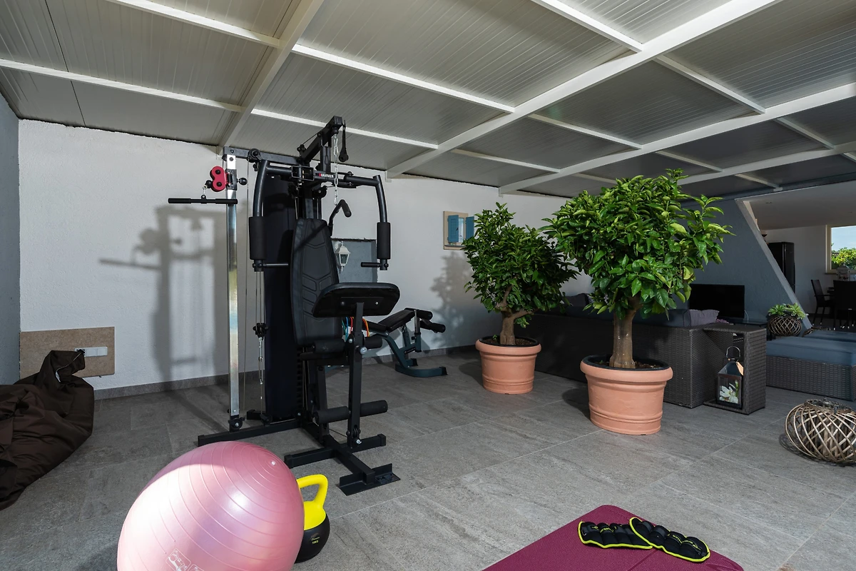 Wenn Ihnen das Innere der Villa gefallen hat, warten Sie, bis wir Ihnen sagen, was Sie draussen erwartet. Neben dem Haupthaus gibt es 2 weitere kleinere Gebäude auf dem Grundstück, das eine Fläche von bis zu 2000 m² umfasst. In einem von ihnen erwartet Sie ein unglaublicher Raum zum Spielen, Spass haben, Entspannen, Kontakte knüpfen und sogar zum Trainieren! Fangen wir also der Reihe nach an: Es gibt eine voll ausgestattete Sommerküche mit Grill, Kühlschrank und Esstisch, einen Entspannungs- und Spielbereich mit Sofa, Fernseher und einer Vielzahl von Büchern sowie einen Fitnessraum im Freien. Das Gute daran ist, dass alles überdacht ist, so dass man sich bei jedem Wetter treffen kann! Im zweiten Gebäude gibt es einen Whirlpool und das zentrale Element, das alle 3 Gebäude miteinander verbindet, ist natürlich der Swimmingpool. Darüber hinaus gibt es eine Tischtennisplatte und einen Kinderspielplatz.