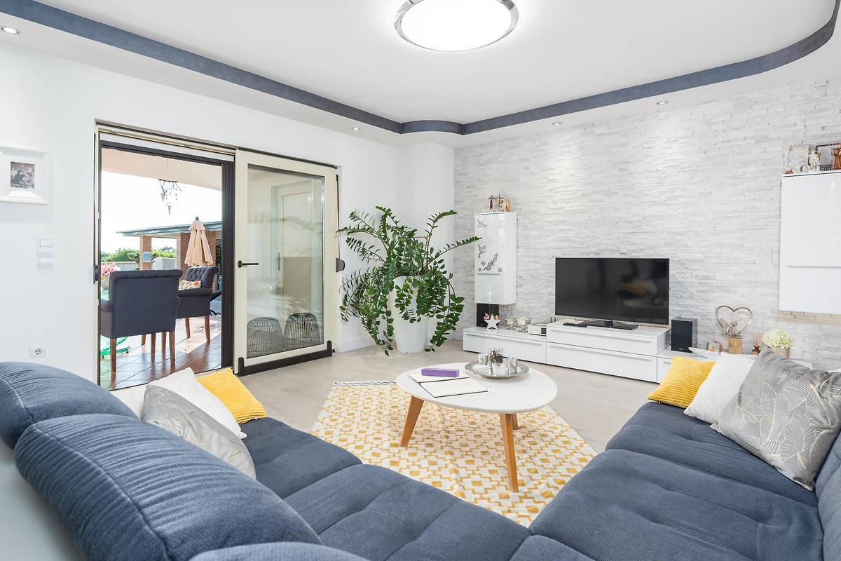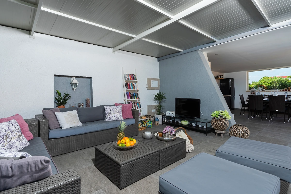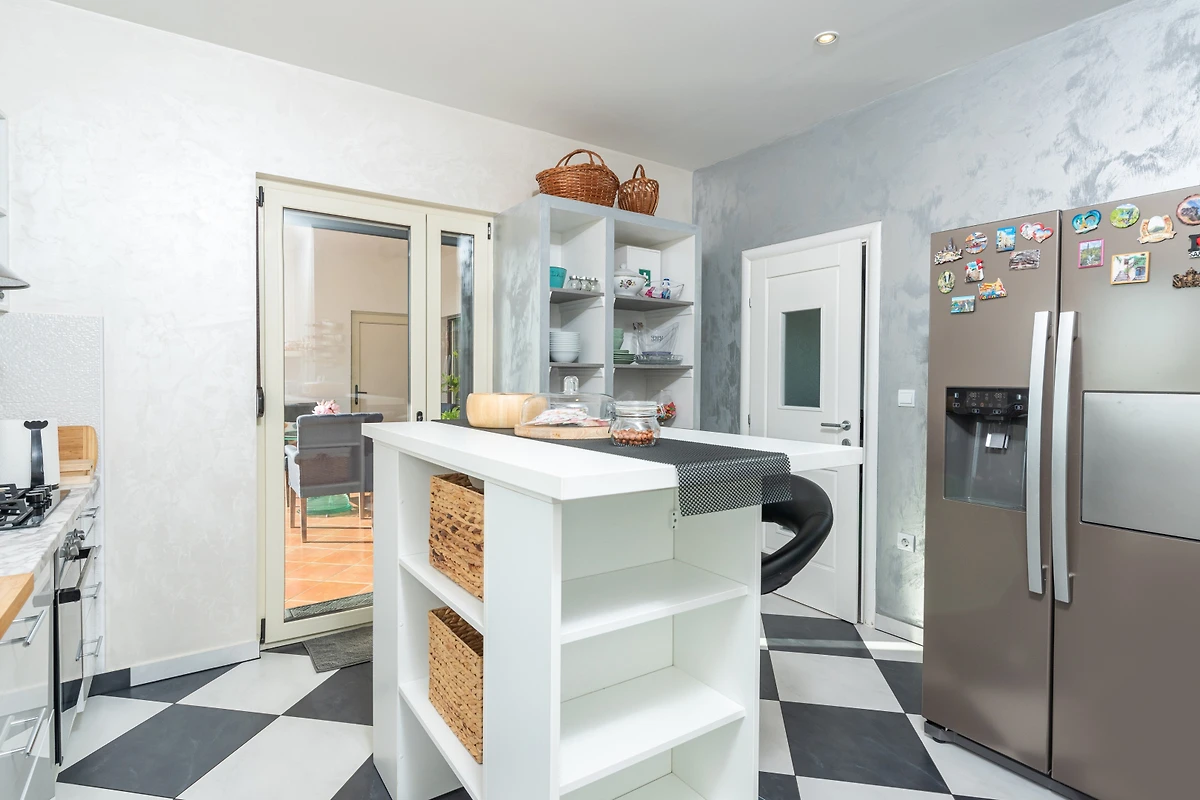 Das Innere der Villa umfasst 240 m² und besteht aus 2 Etagen. Im Erdgeschoss empfängt Sie ein moderner, heller Raum zum Entspannen und Essen. Das Wohnzimmer verfügt über ein grosses Sofa, ideal für ein Nachmittagsschläfchen oder einen Filmabend mit der Familie. Im gleichen Raum finden Sie einen Esstisch mit 8 Plätzen. In einem separaten Raum finden Sie eine moderne Küche mit klaren Linien, komplett ausgestattet, um eine Vielzahl von Mahlzeiten zuzubereiten. Zusätzlich zu allen Arten von Küchengeräten gibt es auch einen grossen Kühlschrank für die Lagerung von Lebensmitteln.