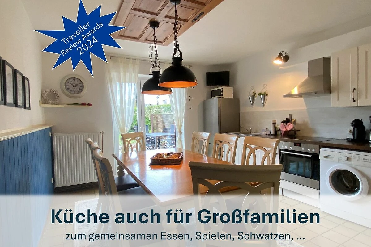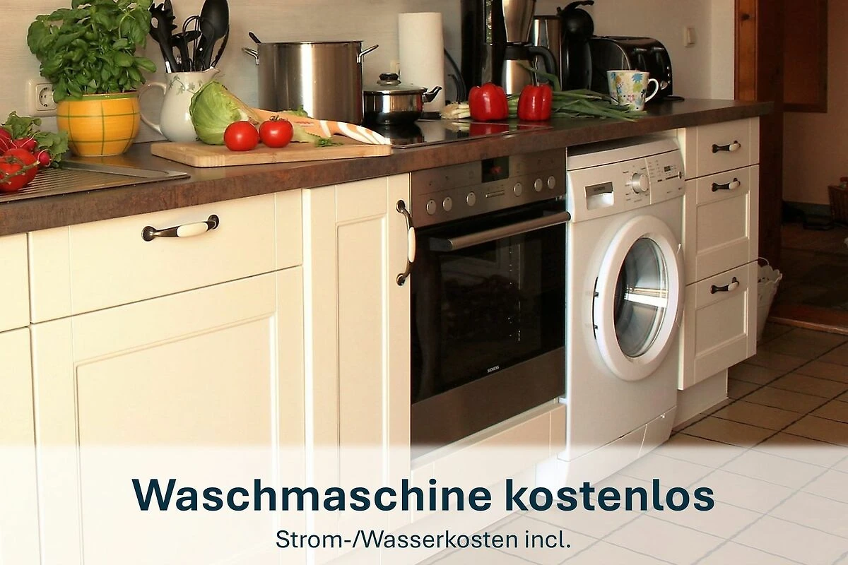 - Voll ausgestattete Küche mit Backofen, Kühlschrank mit Gefrierfach, Geschirrspüler, Waschmaschine sowie umfangreichem Geschirr (auch für Kleinkinder).