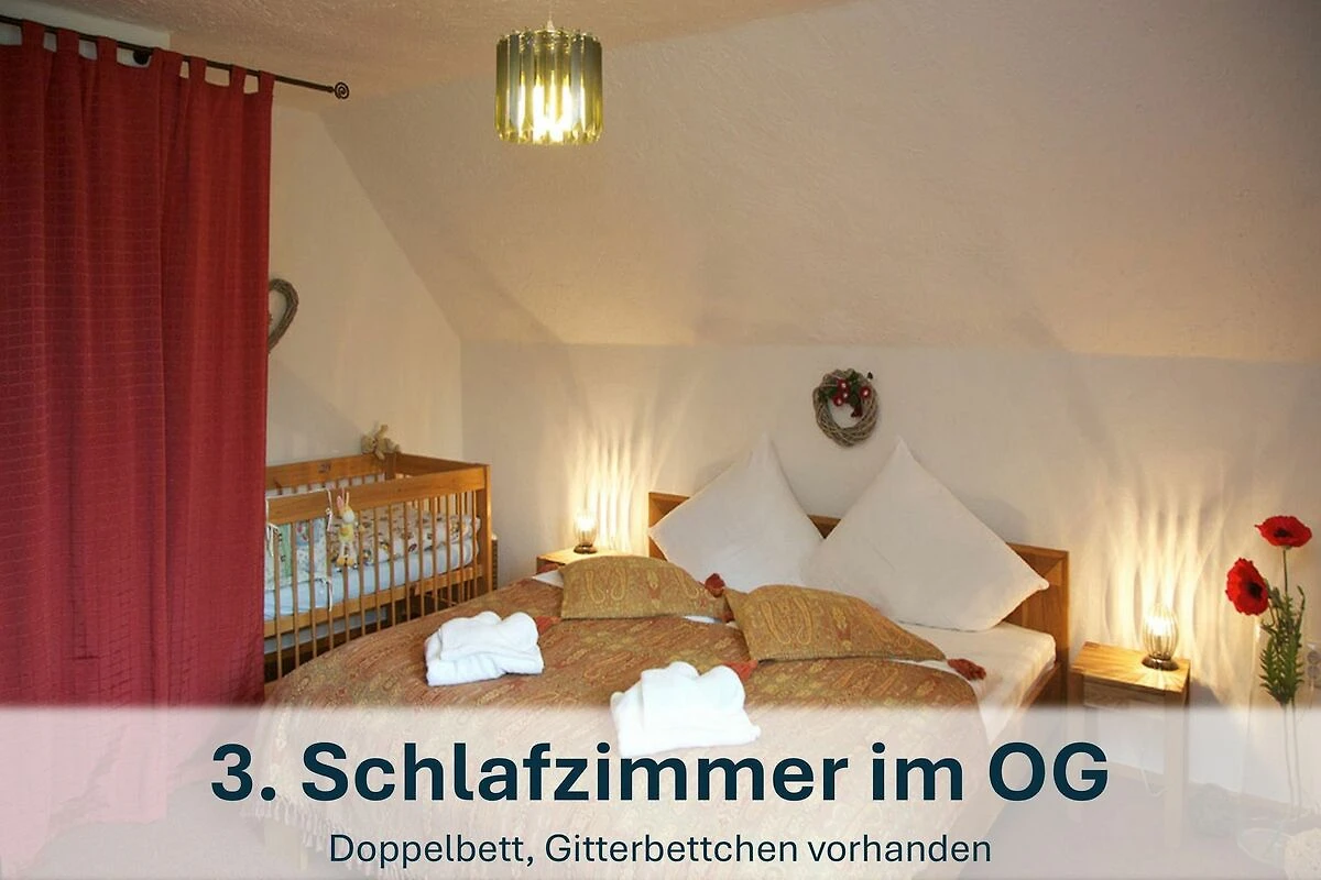 - Schlafzimmer mit gemütlichem Doppelbett und Kinderholzbett (inkl. Wickelauflage & Bettwäsche).