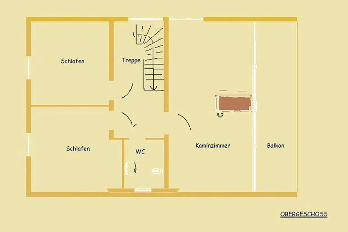 Oben: Schlafzimmer, Kinderzimmer, kleines Bad & Wohnbereich mit Kamin