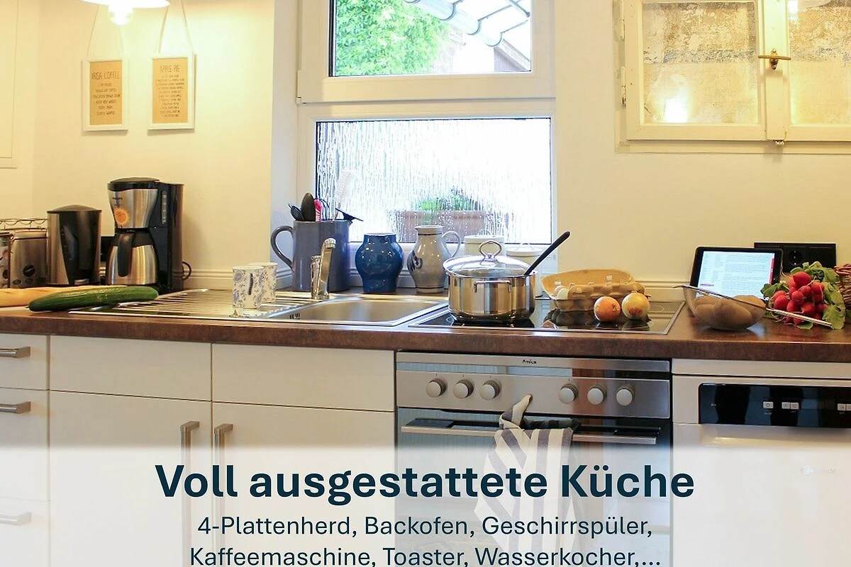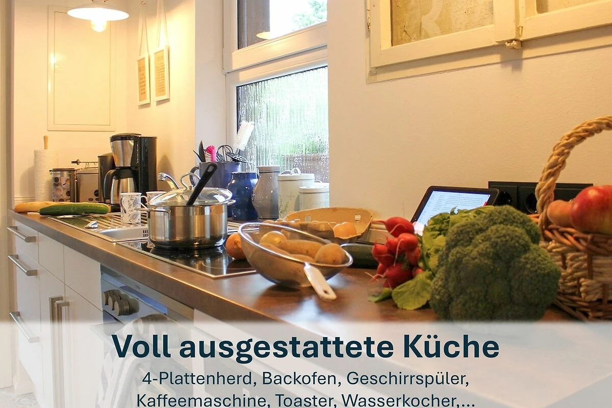 Die voll ausgestattete Küche bietet Cerankochfeld, Backofen, Kühlschrank mit Gefrierfach, Kaffeemaschine, Wasserkocher, Toaster und Geschirr für vier Personen - ideal für gesellige Mahlzeiten. Auch Reinigungsutensilien und ein Hauswirtschaftsbereich mit Bügelbrett und Staubsauger sind vorhanden.