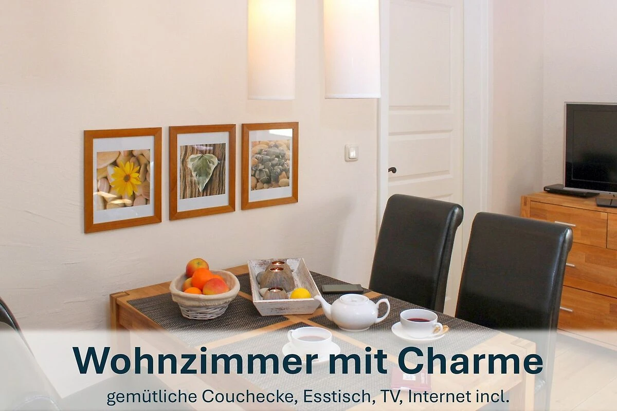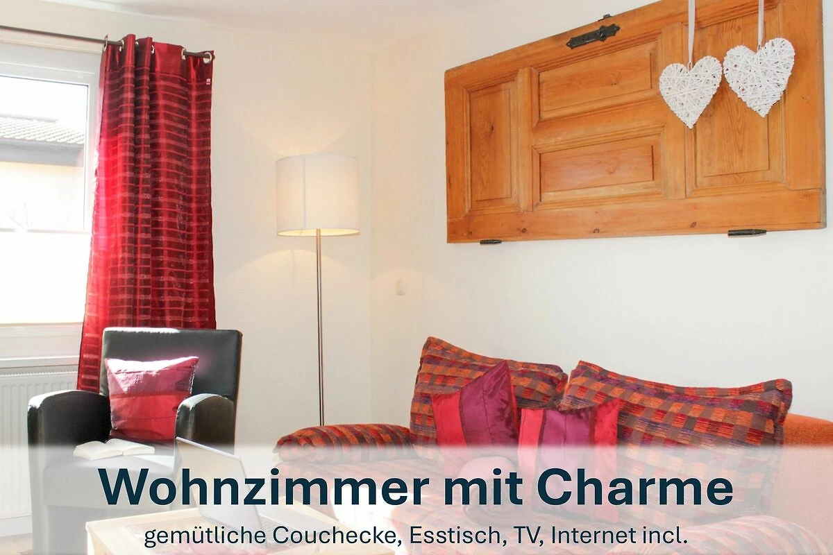 Im Wohnbereich laden eine bequeme Couch, ein moderner Flachbildfernseher und kostenloses WLAN zum Entspannen ein. Warme Farben und liebevolle Details sorgen für eine wohnliche Atmosphäre.